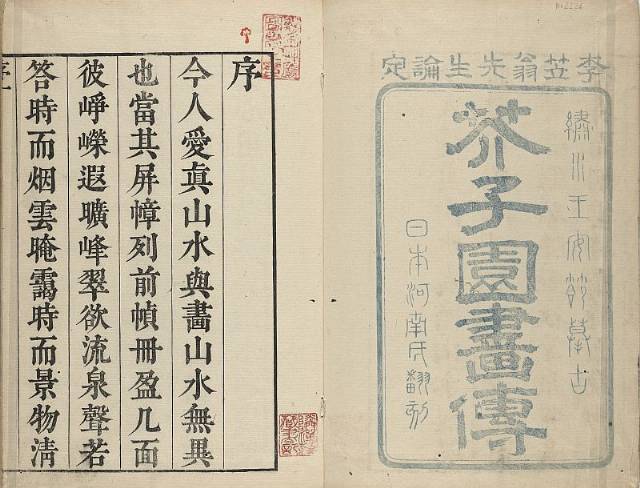 《芥子園畫傳》(芥子園畫譜)是清朝康熙年間的一部著名畫譜,由清代王槩等輯摹。此書詳細介紹了中國畫中山水畫、梅蘭竹菊畫以及花鳥蟲草繪畫的各種技法,其名由來為李漁在南京的別墅芥子園。此內含清康熙時期芥子園刊五色套印本、日本河南四郎右衛門彩色套印本、清嘉慶五年金陵芥子園重刊彩色套印本等版本。