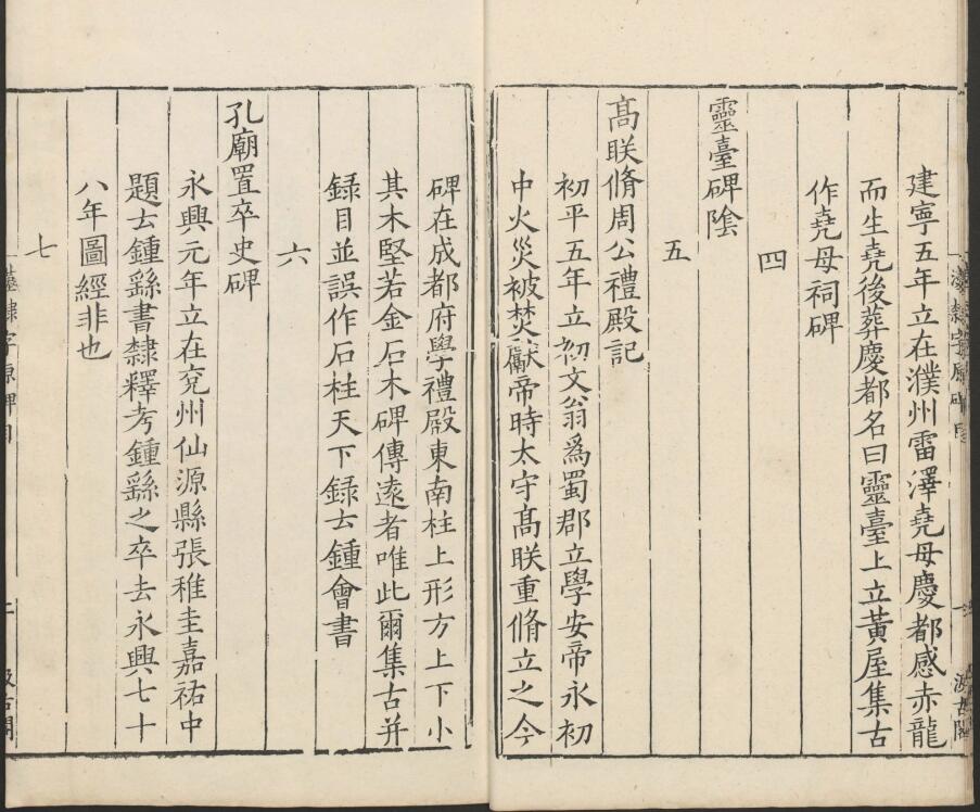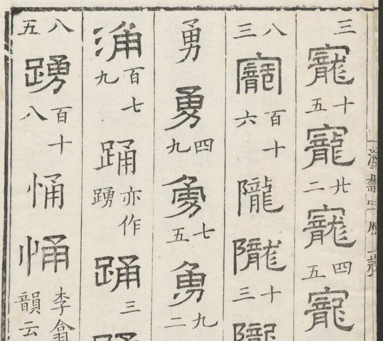 書前列“考碑”、“分韻”、“辨字”三例,實為此書體例之簡說。次列“碑目”一卷,凡漢碑三百零九,魏晉碑三十一,各紀其年月、地、人、書人姓名,以次編列,即以其編之數注卷中碑字之下,以省繁文,如第一一二號為《執金吾丞武榮碑》,注文:“在濟州,不見年月。碑云:‘遭威帝大憂戚哀隕而亡,當在靈帝時也。”後正文中遇到此中有關之隸書,即注為“一一二”。鉤摹之隸書,按《禮部韻略》二百六部分為五卷(上平聲、下平聲、上去、去聲、人聲五卷)。每字皆以楷書標目,而以采自不同碑刻之隸書,鉤摹後標以碑目序號排比於楷書之下。一字若有數體,並列於後。不注音,不釋義,間或作字形考辨,形體異文,隨字註明出處,如“曲江”之為“曲紅”,引《周憬碑》,“遭罹”之為“遭離”,引《馬江碑》;“陂障”之為“波障”,引《孫叔敖碑》等。書前有洪邁(景廬)作於南宋慶元三年(1197)之序。
