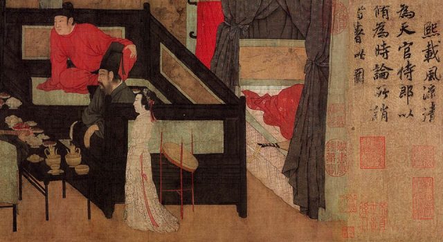 《韓熙載夜宴圖》卷,五代,顧閎中作,宋摹本,絹本設色,縱28.7X橫335.5厘米,北京故宮博物院藏。