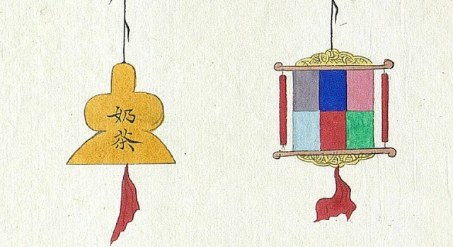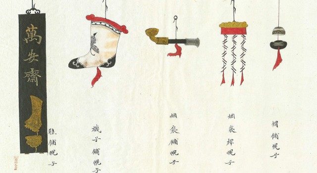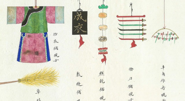 幌子是古時掛在店鋪門外,用以招引顧客和表明商店所售物品或服務項目的標誌。此套京城店鋪幌子圖繪共18幅(近100種,如:當鋪、酒鋪、藥譜、首飾鋪、點心鋪,甚至還有奶茶鋪、影像鋪等等),由清末北京民俗畫家、外銷畫家周培春繪製。他的畫作幫助我們了解清代北京的市景風俗習慣。
