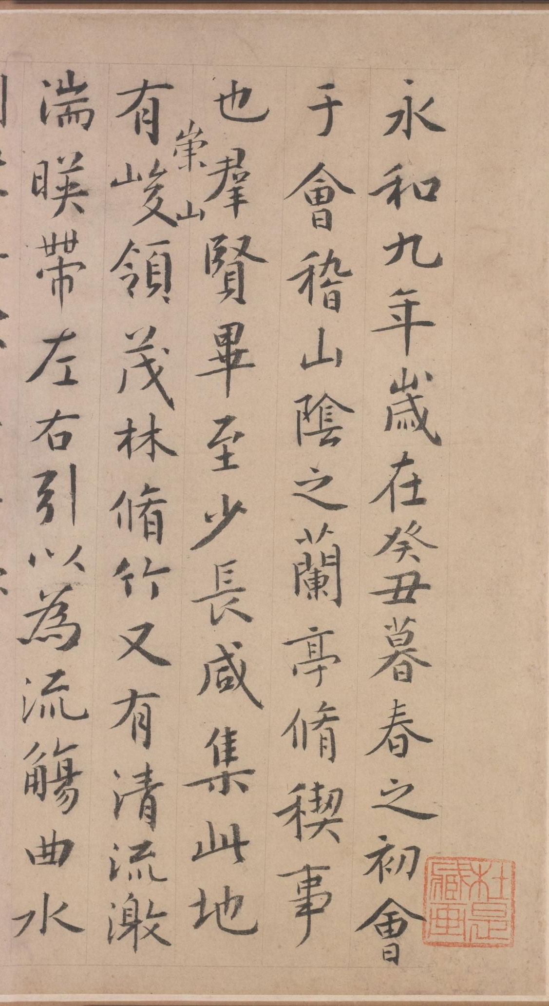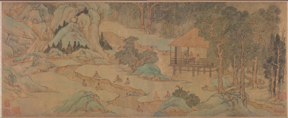 文徵明繪《蘭亭修褉圖》全卷下載,作於明嘉靖二十一年(壬寅年,1542年),金箋地,設色,縱24.2cm,橫60.1cm,北京故宮博物院藏。