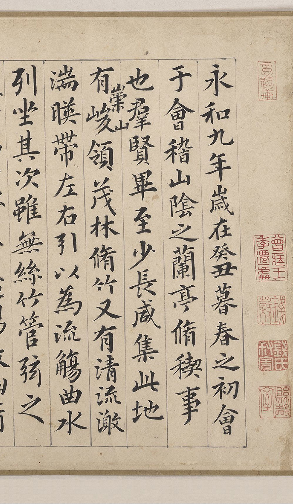 此《蘭亭修禊圖》卷為明代畫家錢榖繪。畫作題材取自東晉王羲之《蘭亭序》,描繪東晉永和九年,王羲之、謝安等人在浙江山陰的蘭亭溪上修禊,作曲水流觴之會的故事,卷前有王榖祥題「蘭亭修禊」,卷後有錢榖書《蘭亭序》及集詩。此卷現藏於美國大都會藝術博物館。
