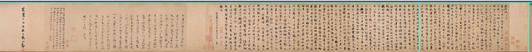 趙孟頫行書《洛神賦》,紙本,墨跡,縱二十九·五厘米,橫一百九十二·六厘米;六十八行,計八百七十四字,款署“大德四年四月廿五日為盛逸民書子昂”。卷尾有元何心山、倪瓚題記,清英和觀款。現藏天津市藝術博物館。