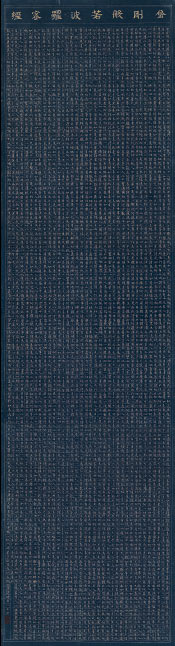 文徵明小楷泥金《金剛般若波羅蜜經》,明代,絹本泥金,立軸,縱116厘米,橫31厘米,遼寧省博物館藏。長洲文徵明時年八十七歲。