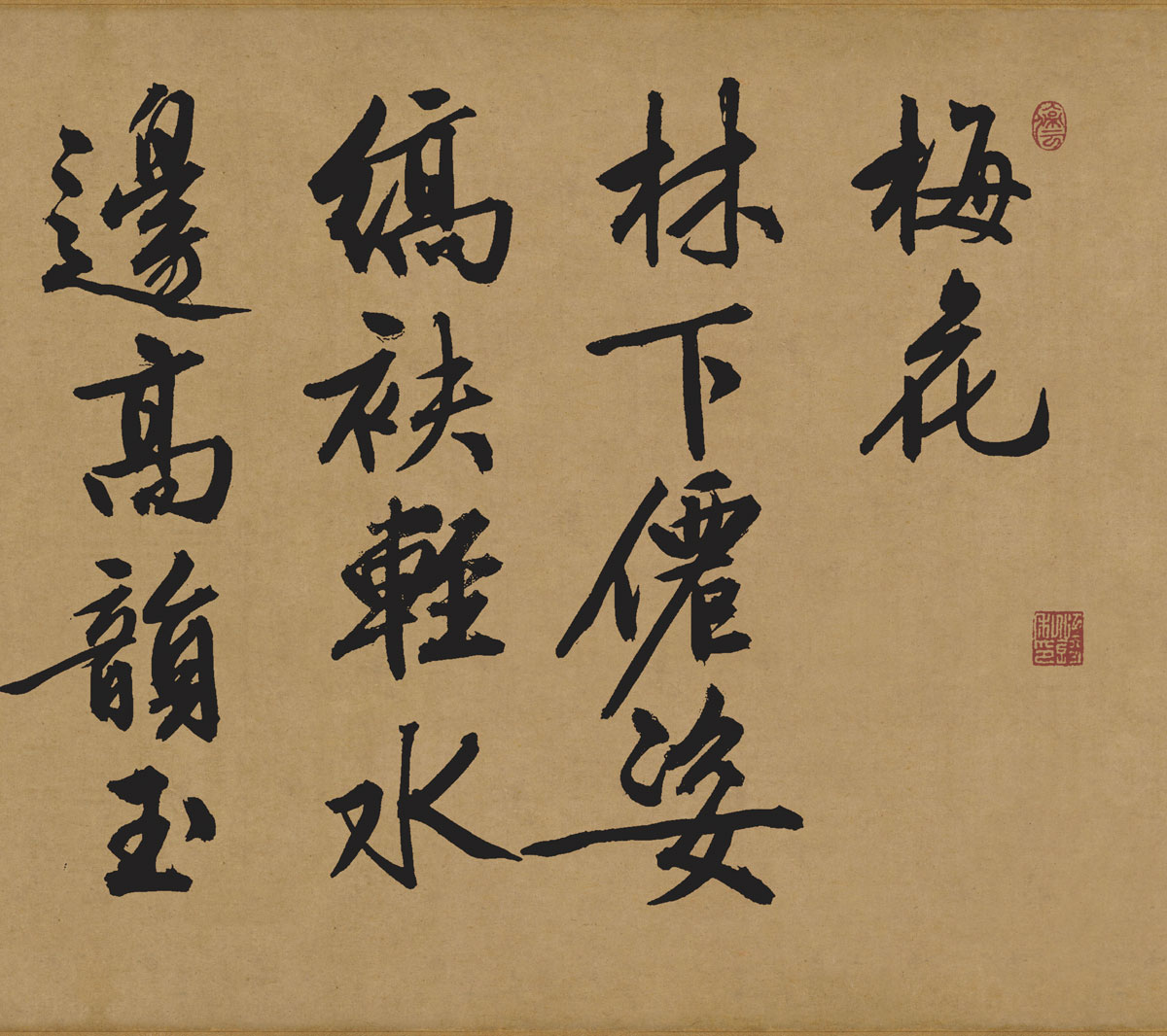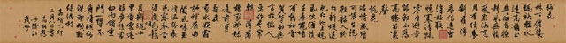 文徵明行書《詠花詩》卷。紙為高麗玉版紙,原紙上鈐有三方朝鮮國王之印·朱文大印,應是李氏朝鮮王朝給明王朝的進貢紙。在這件縱39.3cm、橫546cm的鴻篇巨製中,文徵明以其如椽巨筆向人們展現了一個86歲高齡的書畫家的文氣匠心。