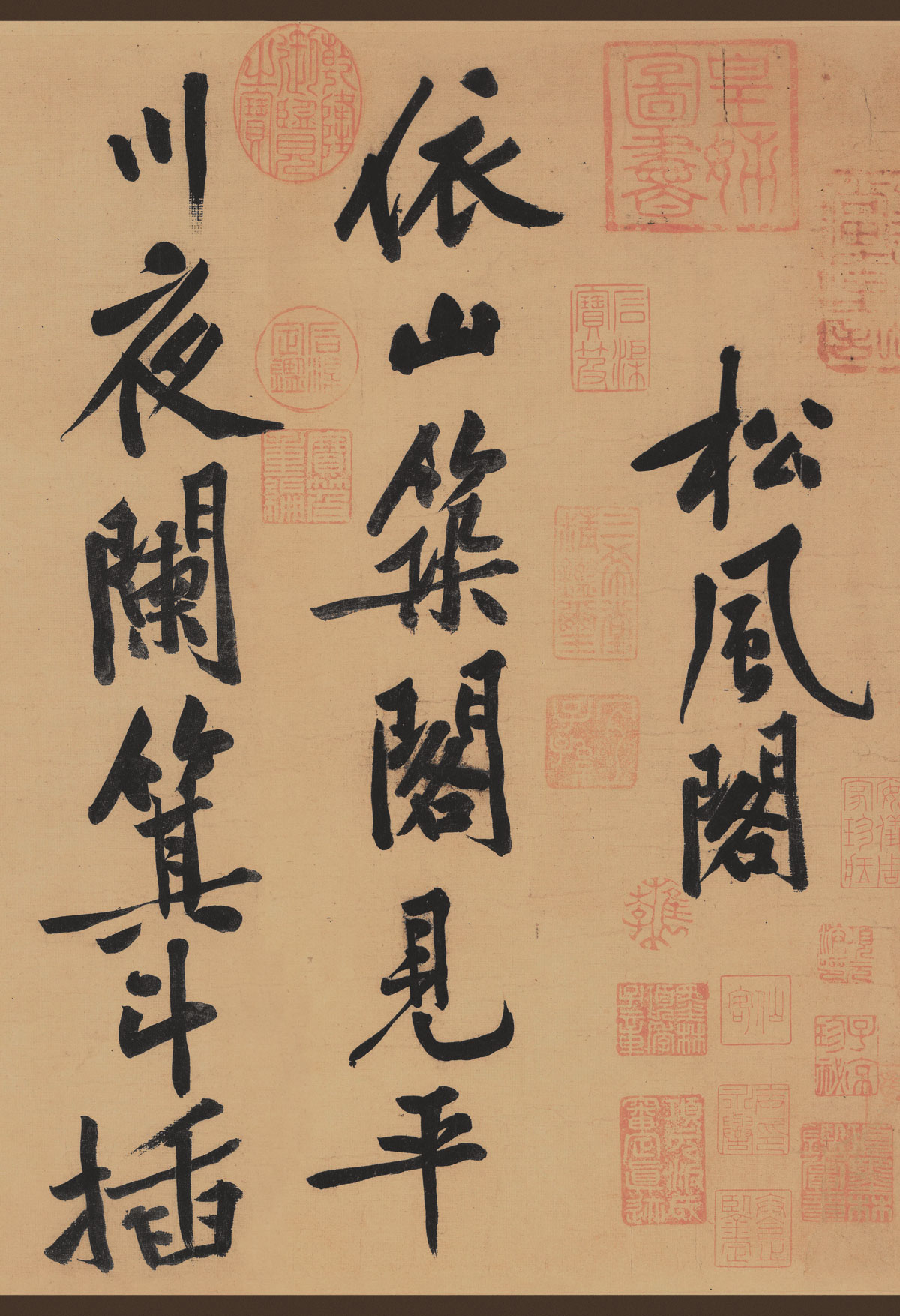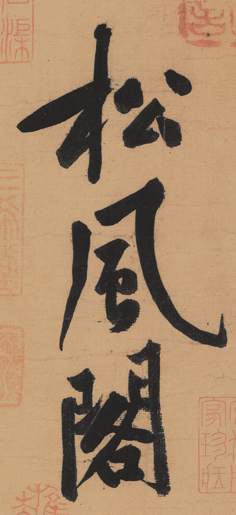 崇寧元年(1102)九月,黃庭堅與朋友游鄂城樊山,途經松林間一座亭閣,在此過夜,作了這首“松風閣”的詩,歌詠當時所看到的景物,並表達對朋友的懷念。這件書跡長波大撇,提頓起伏,一波三折,像是船夫搖槳用力的樣子。不論收筆、轉筆,都是楷書的筆法,下筆平和沉穩,變化非常含蓄,輕頓慢提,婀娜穩厚,意韻十足。在後段提到前一年已去世的蘇軾時,心中不免激動,筆力特別凝重,結字也更加傾側,傳達出與東坡篤厚的情誼,是尚意書風的典型。