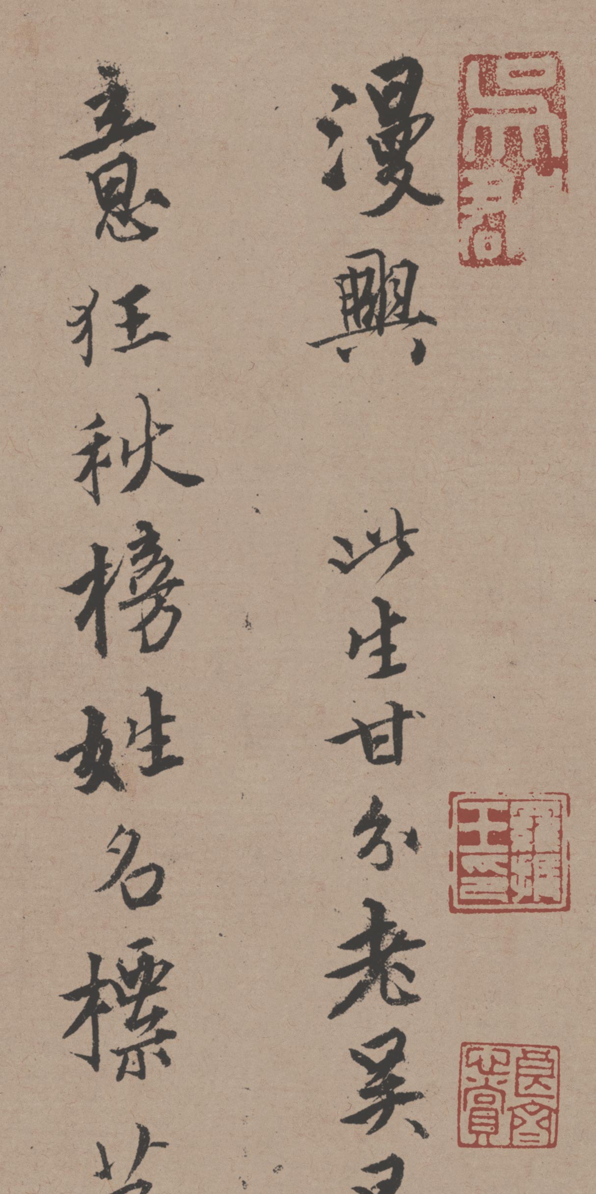 該作是其為友人所書的自作漫興詩,通卷千餘字一氣呵成,用筆精到細膩,體勢向右欹側,富有生動姿態,如高雅之士,閒庭信步於閬苑林木之間,十分耐人尋味,卷後末署書寫年月,但從其淡雅自然的筆調之中當為其晚年所書,唐寅傳世真跡甚少,除《落花詩冊》外,《漫興》便是其主要的代表作品。