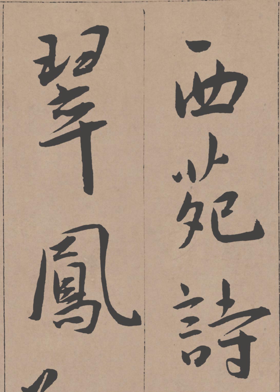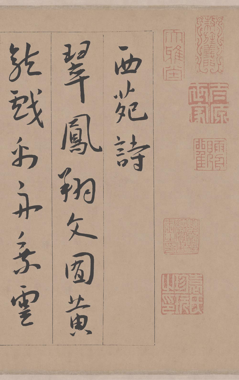 該卷《西苑詩》,取法獻之、虞世南筆意,但善於摻拙,做到了巧而不媚,流暢而不浮滑;用筆清勁秀雅,溫潤含蓄,不激不厲,技巧動作的表達非常細膩、精巧,變化極其微妙;結體安排精巧流走,法度、情性俱在,有些地方還流露章草遺韻,更顯高古蘊藉;整個氣息落拓不羈、遒勁蕭疏,在沉靜、收斂之中反而更具一種內在的張力。誠如清黎惟敬所讚頌的那樣:“晉人真跡,世所罕見。所傳者,仿書耳。諸體混淆,若出一手,不辨其為誰也。近世吳人王履古氏獨能追蹤大令,蕭散俊逸,復出流輩,雖不見晉人書,知其為絕藝也。”