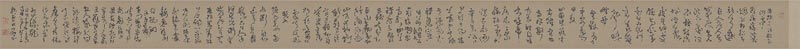 王鐸《贈張抱一草書詩卷》,自署書於崇禎十五年(1642),綾本,草書,長469cm,高26cm,日本東京國立博物館藏。自作詩七律五首,凡七十五行,共3636字。