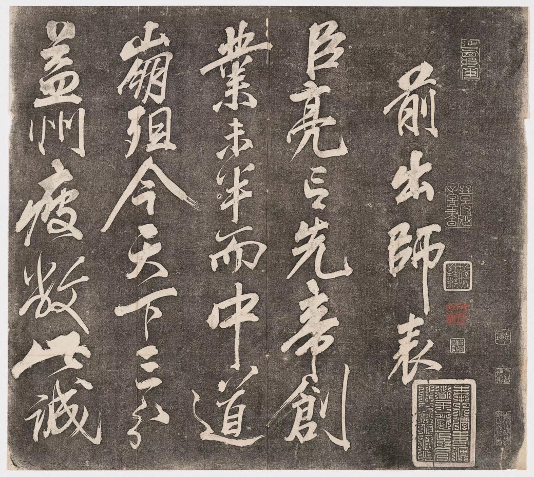 陝西省岐山縣城南五丈塬,是諸葛亮幾十年南征北戰中最後一個戰場。諸葛亮死後,唐初便有人在此立廟,後來殿內東西兩壁鑲嵌的40塊二尺見方的岳飛書諸葛亮前後《出師表》石刻。此本為光緒4年的一個拓本,哈佛大學圖書館藏。