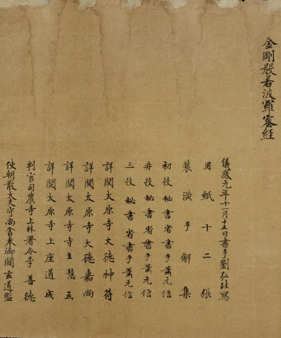 此卷《金剛般若波羅蜜經》於唐代儀鳳元年十一月由劉弘珪抄寫。這是武則天為母親追福而發願敬造的經書之一,楷書字型飄逸,規整雋秀。卷後題記有抄寫時間、用紙數量,書手、初校者、再校者、三校者、詳閱者、裝潢手、使、判官等人的信息。此卷出土於敦煌(卷首殘,卷尾齊全),現藏於中國國家圖書館。
