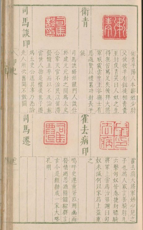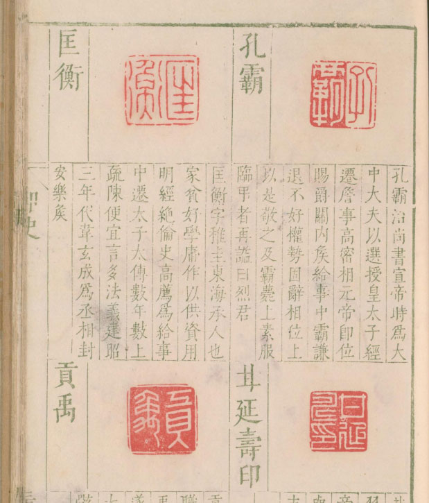 明代印人何通首開印章與印外學問結合之先,嘗取史傳人物,各刻其私印,系以小傳,成《印史》。內收自秦始皇至元順帝一千六百年間史傳名人姓名,如:李斯、蒙恬、龐統、房玄齡、王君公、韓嬰、趙孟頫等眾多名家印鑑。此本為明天啟刻鈐印本。