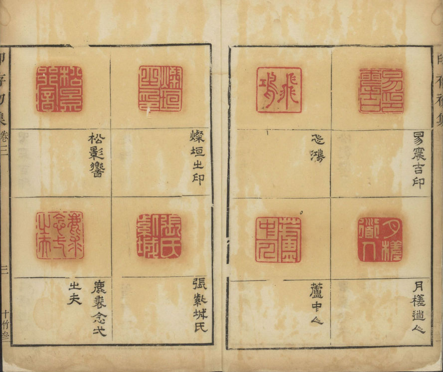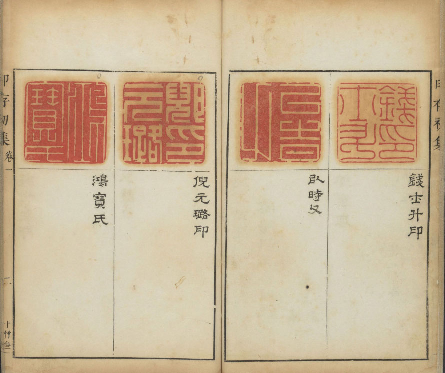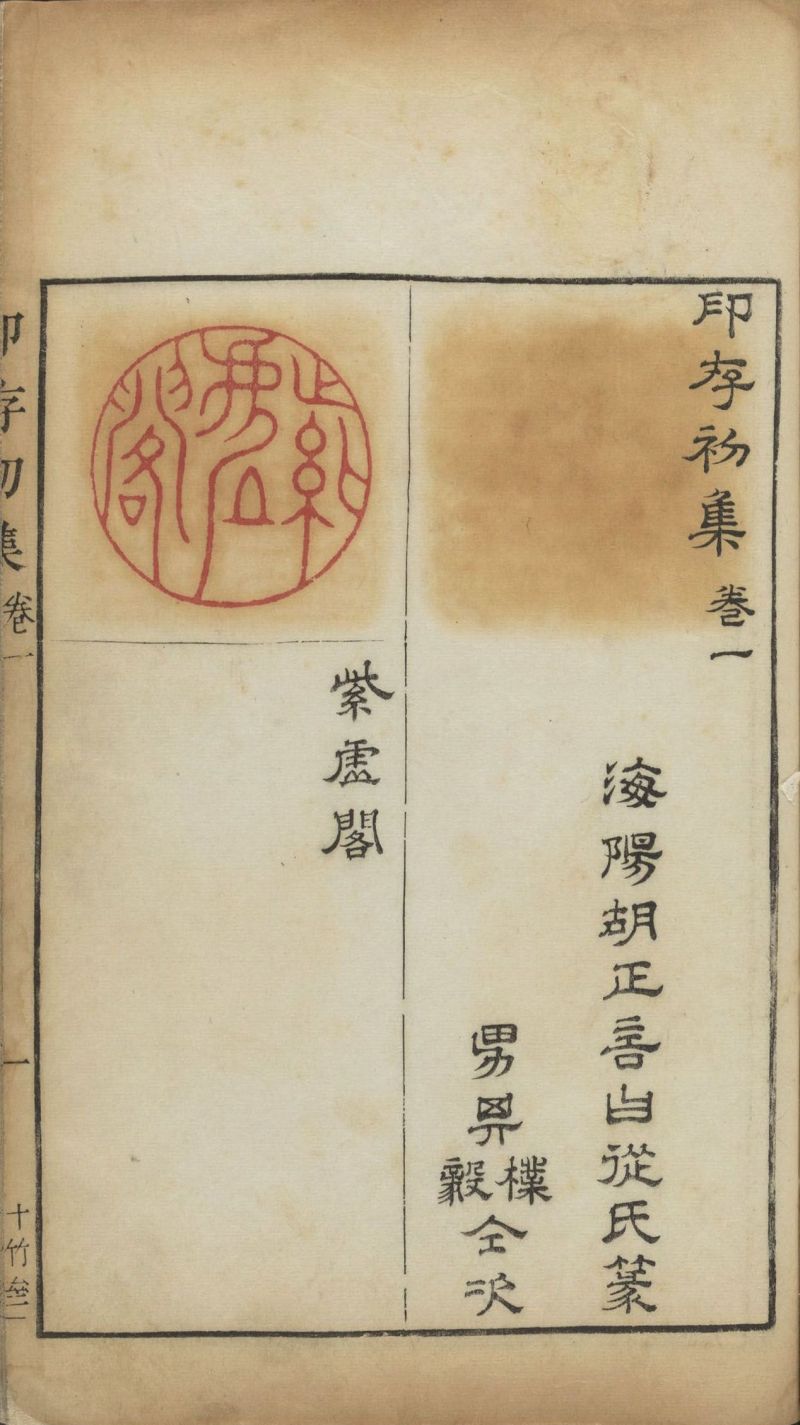 此《胡氏印存》(印存初集)為明末胡正言自刻輯印而成。全書共四卷:卷一錄私印大印三十九方、卷二錄社堂印私印一百八十六方、卷三錄私印文語印三百二十方、卷四錄長方印九十方,每印下有釋文。此本為清順治四年十竹齋鈐印本,卷首有周亮工、王相業、杜濬、陳丹衷、錢應金、韓詩序,卷未有彭源、吳奇跋。哈佛大學圖書館藏本。