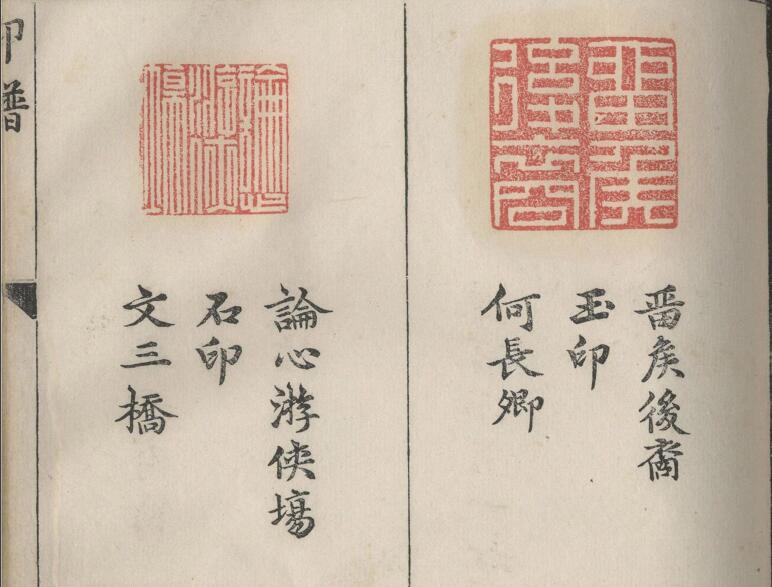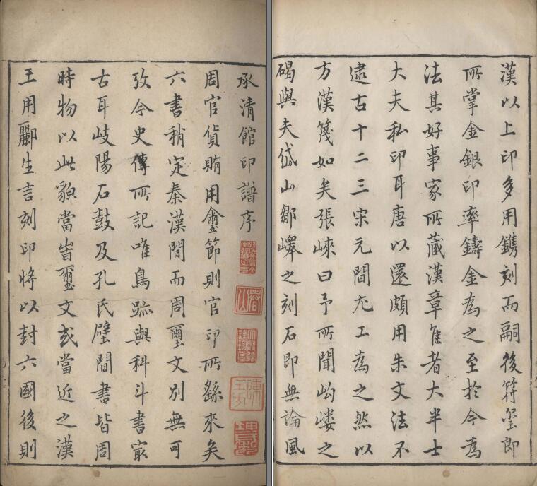 承清館主人張灝,早年偶得古代金玉印章百鈕,愛不釋手,遂搜購當時名家篆刻作品,並謀鈐拓編集印譜,於萬曆四十五年(1617年)輯成《承清館印譜》正續二集,四冊。正集彙輯文彭、何震、蘇宣、李流芳等二十二家印人刻印四百八十方。除石印外,不乏有金、銀、銅、琥珀、瑪瑙、玉石、水晶等材質。每方印下註明釋文、印材與作者。《承清館印譜》是我國首部彙輯諸家印作的印譜,一些享有盛譽的印人作品賴此譜傳世,為後世考察明代文人篆刻風貌提供了重要依據。