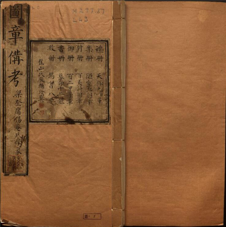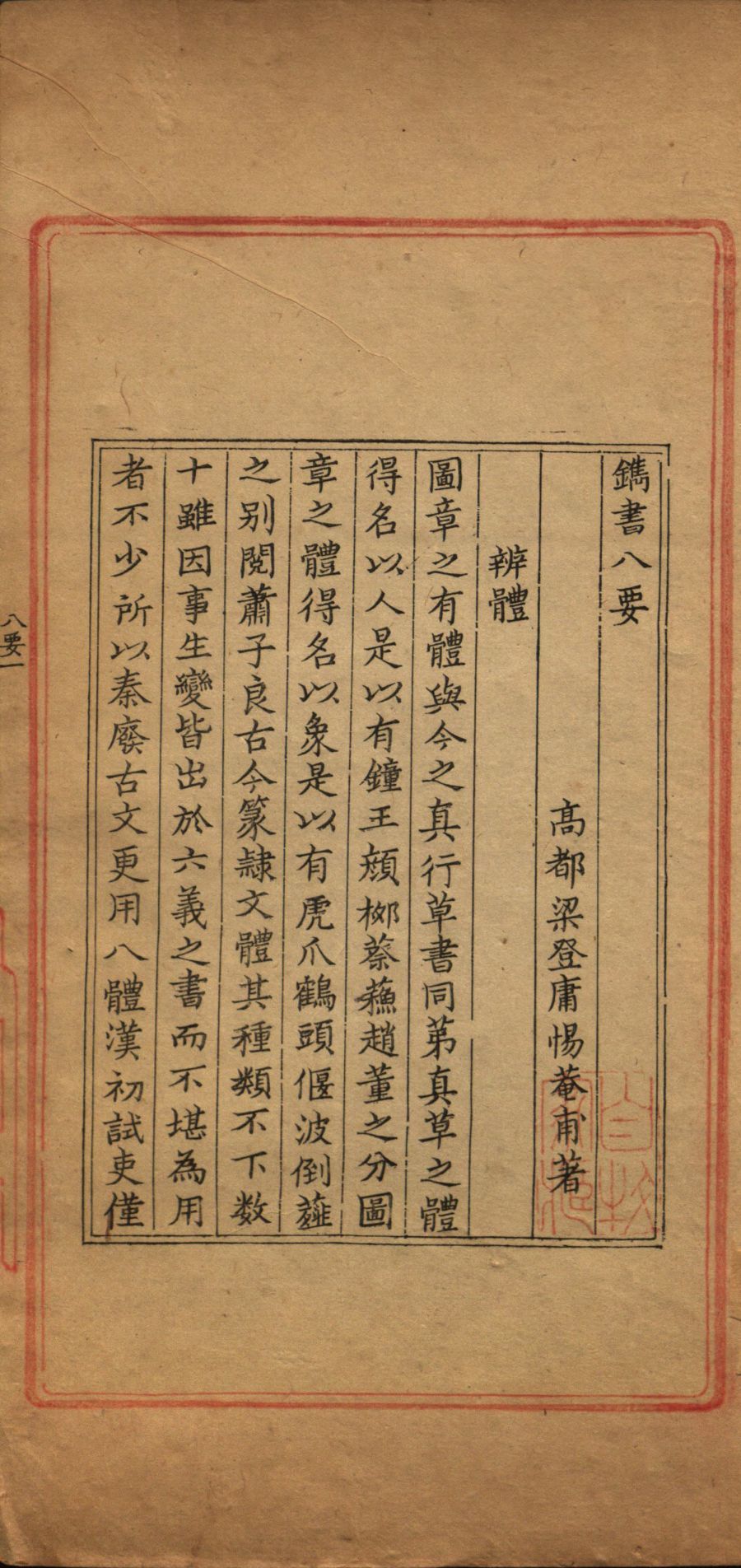 清代梁登庸篆《圖章備考》(垂棘山房藏印)。全書共分六冊(禮、樂、射、御、書、數),輯錄六種:天保九如章、陋室銘圖章、百美詩圖章、百二甲子章、摹印十二體、鐫書八要。前五卷除錄印作外,俱有序文。卷二專題刻錄劉禹錫之〈陋室銘〉,共十九印。卷三專題刻錄歷史上著名美人之詩語。卷六為篆刻理論,分:辨體、配篆、制刃、選石、刀法、調塗、鈐印、避忌等八則。卷內題:高都梁登庸惕菴氏學篆、高都梁登庸惕菴甫著。鈐印:”草溪”朱文葫蘆印,”白牧家藏”朱文方印,均在序一。