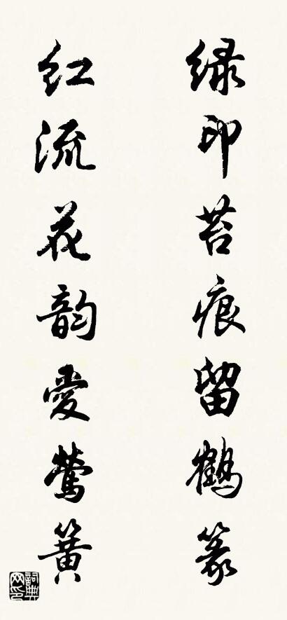 對聯綠印苔痕留鶴篆 紅流花韻愛鶯簧書法欣賞