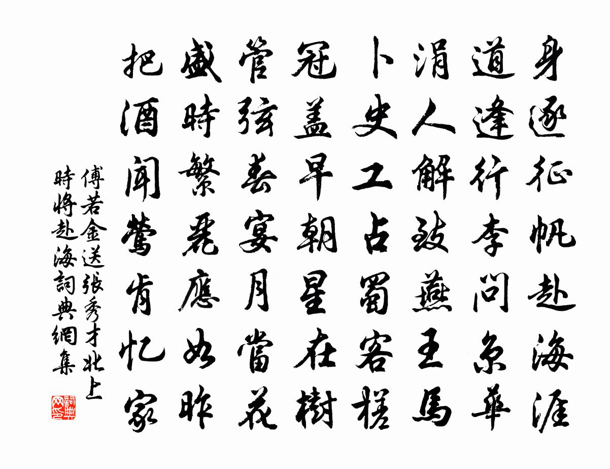 詩詞名句歷史字典書法欣賞書法字典國語詞典說文解字康熙字典古漢語字典標 題 作 者 詩 句 送張秀才北上時將赴海作者:傅若金 朝代:元代送張秀才北上時將赴海原文身逐征帆赴海涯,道逢行李問京華。涓人解致燕王馬,卜史工占蜀客槎。冠蓋早朝星在樹,管弦春宴月當花。盛時繁麗應如昨,把酒聞鶯肯憶家。詩詞問答問:送張秀才北上時將赴海的作者是誰?答:傅若金問:送張秀才北上時將赴海寫於哪個朝代?答:元代問:送張秀才北上時將赴海是什麼體裁?答:七律傅若金送張秀才北上時將赴海書法欣賞送張秀才北上時將赴海書法作品注釋元詩別裁集詩詞推薦送人王建〔唐代〕河亭收酒器,語盡各西東。回首不相見,行車秋雨中。考試畢登銓樓梅堯臣〔宋代〕春雲濃淡日微光,雙闕重門聳建章。不上樓來知幾日,滿城無算柳梢黃。淮南遇梵才告上人因悼謝南陽疇昔之游梅堯臣〔宋代〕久已厭宦旅,故茲歸江南。始時遽辭邑,不及事春蠶。殘臘猶在道,險阻固所諳。扁舟次淮海,喜遇釋子談。契闊石頭城楊備〔宋代〕五城樓雉各相望,山水英靈宅帝王。此地定由天造險,古來長侍作金湯。詠史二首劉禹錫〔唐代〕驃騎非無勢,少卿終不去。世道劇頹波,我心如砥柱。賈生明王道,衛綰工車戲。同遇漢文時,何人居貴位。偈傾一百六十九首釋智朋〔宋代〕提折明星腳鐺,各明星出只手明星。釋迦不先,彌勒不後。妙用臨機,如盤珠走。鼓腹笑復歌,明星南看北斗。六應致遠謁放翁姜特立〔宋代〕雙溪雪消水生波,有客袖句來相過。自言平生有詩僻,擺落世故工吟喔。不願垂腰連六印,不願爰田封萬戶。唯於端午帖子皇后合五首歐陽修〔宋代〕蘭苕擢秀迎風紫,槿艷繁開照日紅。嘉節相望傳有舊,深宮行樂自無窮。句李申子〔宋代〕[缺]深城紅塵,怎得侵[缺]骨雲岩檜老險驚[缺]興廢一掬清泉酌古[缺]沈寂徘徊覓句聽市[缺]郡圃依綠亭陳峴〔宋代〕修林平沼久荒埃,招領春風一笑回。掃淨莓苔分徑岸,剩添桃李結亭台。時因休吏文書了,忽作閒人杖屢來。待與挽洛陽李教授喪北歸陳杰〔宋代〕華閥晃科峻,寒氈洛學開。燕子庭五桂,晉國手三槐。風幕南烹養,塗車北首哀。讀書終不憾,九秩過江來。贈寫真水監處士王溫叔楊萬里〔宋代〕我不如森森千丈松,我不如濯濯春月柳。髯疏鬢禿已雪霜,皮皺肉皴真老醜。葉生畫時顏尚朱,王生畫時骨更臞。次韻謝兄饋李方岳〔宋代〕往事轉頭如墮甑,獨枕書眠知雋永。竹風風好直萬金,不涉世間榮辱境。東山之屐北山移,坐覺室邇長相思。碧脆新田詩王安石〔宋代〕離離新田,其下流水。孰知其初,灌莽千里。其南背江,其北逾淮。父抱子扶,十百其來。其來僕僕,鏝我新屋。聞潮陽吳子野出家(或為蘇過作)蘇軾〔宋代〕子昔少年日,氣蓋里閭俠。自言似劇孟,叩門知緩急。千金已散盡,白首空四壁。烈士嘆暮年,老驥悲伏櫪。妻孥送邢郎中赴太原姚合〔唐代〕上將得良策,恩威作長城。如今并州北,不見有胡兵。晉野雨初足,汾河波亦清。所從古無比,意氣送君行。清平樂張繼先〔宋代〕天先天后。真土藏靈秀。妙用自然循火候。節節薰烝教透。不分龍麝檀沈。都能入鼻通心。待得煙訊息住,渾身變秦樓月 以上壽詞六首見順齊間居業稿卷六蒲道源〔元代〕龍樓宴。千官拜表俱歡忭。俱歡忭。今宵帝座,瑞光高見。觚*引領心常戀。南山萬壽殷勤獻。殷勤獻。皇天眷顧陪周溪園登賞心亭翁泳〔宋代〕建業城樓四面窗,賞心勝處冠南邦。石頭西峙雲藏寺,水面南浮月滿江。故國秋深人自老,新河夜遁虜誰降。高人了翁釋智朋〔宋代〕先師公案強名模,不解深藏負累渠。是我殺我便償命,如何年老解心孤。名句推薦玉樓天半起笙歌,風送宮嬪笑語和。顧況《宮詞五首·其二》 北風利如劍,布絮不蔽身。白居易《村居苦寒》 紙上得來終覺淺,絕知此事要躬行。陸游《冬夜讀書示子聿》 湛湛長江去,冥冥細雨來。杜甫《梅雨》 千貫買田,萬貫結鄰。佚名《增廣賢文·下集》 孤燈不明思欲絕,卷帷望月空長嘆。美人如花隔雲端!李白《長相思·其一》 小雨空簾,無人深巷,已早杏花先賣。史達祖《夜行船·正月十八日聞賣杏花有感》 舊時王謝堂前燕,飛入尋常百姓家。劉禹錫《烏衣巷》 桃花盡日隨流水,洞在清溪何處邊。張旭《桃花溪》 暗塵隨馬去,明月逐人來。蘇味道《正月十五夜》