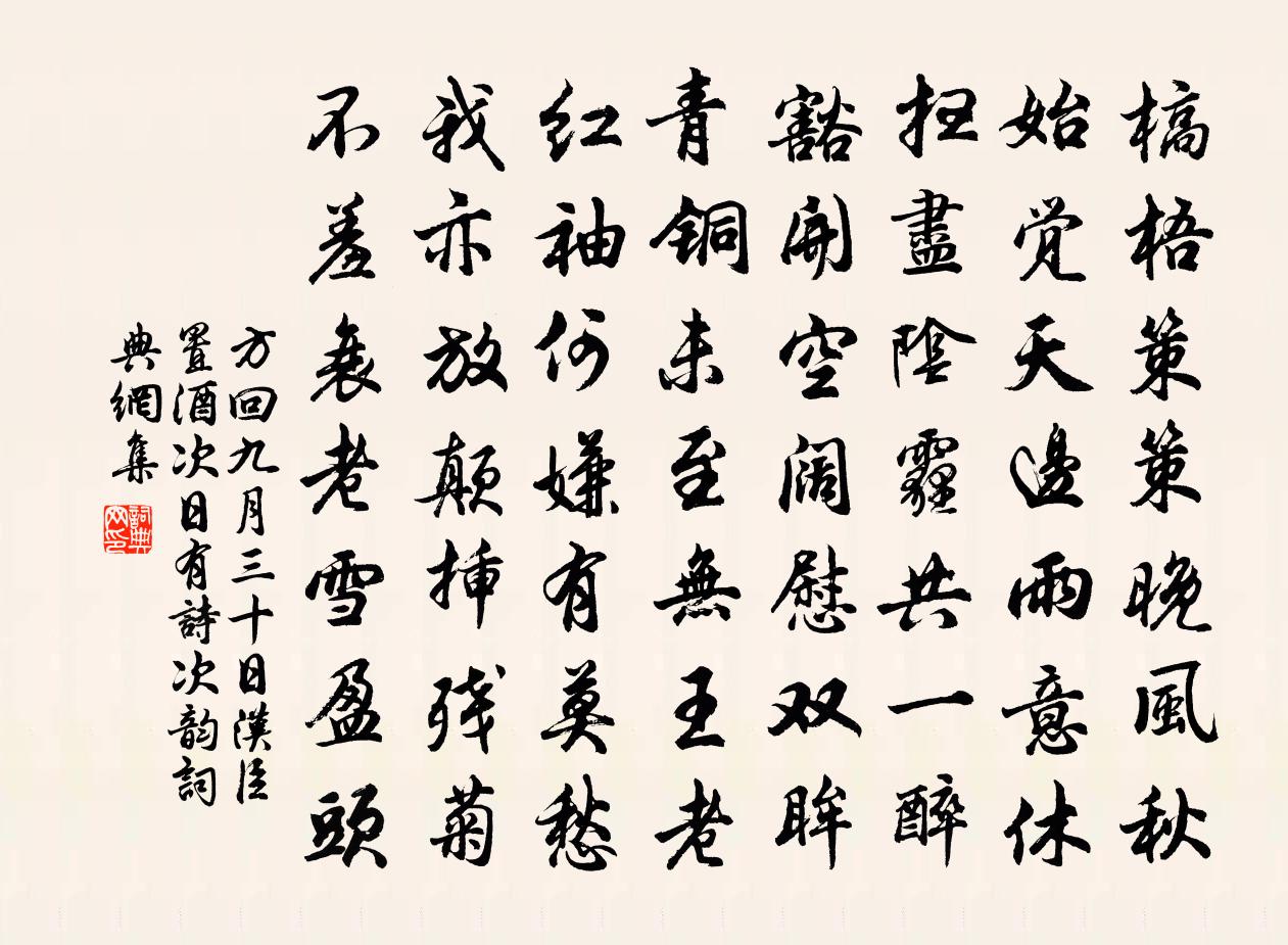 詩詞名句歷史字典書法欣賞書法字典國語詞典說文解字康熙字典古漢語字典標 題 作 者 詩 句 九月三十日漢臣置酒次日有詩次韻作者:方回 朝代:宋代原文槁梧策策晚風秋,始覺天邊雨意休。掃盡陰霾共一醉,豁開空闊慰雙眸。青銅未至無王老,紅袖何嫌有莫愁。我亦放顛插殘菊,不羞衰老雪盈頭。詩詞問答問:《九月三十日漢臣置酒次日有詩次韻》的作者是誰?答:方回問:該詩寫於哪個朝代?答:宋代書法欣賞九月三十日漢臣置酒次日有詩次韻書法作品詩詞推薦九月晦日謁韓子華遂留邀江鄰幾同飲是夕值其梅堯臣〔宋代〕乘興驅車偶一來,旋呼江老舊遊陪。驚風送雨寒初動,舉酒浮蛆撥不開。騏驥鞴時聞內宿,琵琶彈急怨虛催。接籬西江月向子諲〔宋代〕見處莫教認著,無心慎勿沈空。本無背面與初終。說了還同說夢。欲識薌林居士,真成漁父家風。收絲垂釣月明中岳州別姚司馬紹之制許歸侍張說〔唐代〕和玉悲無已,長沙宦不成。天從扇枕願,人遂倚門情。方外懷司馬,江東憶步兵。問君棲泊處,空嶺夜猿驚。趙待制輓詞樓鑰〔宋代〕半世誰知己,登門意氣傾。交情忘父行,文會忝余盟。持論先忠厚,談經嘆老成。幽光誰為發,落筆淚縱橫。伯兄新樓十首王柏〔宋代〕未說樓居即是仙,自然高處隔塵寰。誰家雙鶴鳴清曉,聲在東邊竹樹間。送關都官致仕陳襄〔宋代〕有堅松柏,君子斧之。有實秠稷,農夫有之。天子有老,曷其與歸。贈日者馮鼎山蒲壽宬〔宋代〕馮君胸中爛星斗,測人窮達誰與偶。得錢便據青旗亭,北斗還堪把漿酒。醉來訪我梅花傍,索飲喔詩恣狂吼。平生又戲答絕句白居易〔唐代〕狂夫與我兩相忘,故態些些亦不妨。縱酒放歌聊自樂,接輿爭解教人狂。和丁丞相吳潛〔宋代〕夷狄為陰中國陽,豈容羊犬更鴟張。捷書一紙來從廣,凱奏連旗至自揚。盡瘁元臣食放箸,偷安老守寢凝香。但憐箋年老逢春八首誰讓萬金無孑遺邵雍〔宋代〕箋云:白日偏催處,黃金欲盡時。侈心都用了,始得一開眉。送昌言舍人得告蜀三首司馬光〔宋代〕富貴動歸思,由來光里閭。戒門羞主父,負弩笑相如。外物有榮悴,中心無戚疏。遙知見親舊,不改布衣初。和鄭商老下第楊時〔宋代〕雨余新惹一番愁,展轉衾寒客思悠。獻璞又添今日恨,登科空負昔人羞。林泉水石君先到,京國風塵我尚留。若為松廖匡圖〔唐代〕曾於西晉封中散,又向東吳作大夫。濃翠自知千古在,清聲誰道四時無。枝柯偃後龍蛇老,根腳盤來爪距粗。直待蝶戀花方千里〔宋代〕漏泄東君訊息後。短葉長條,著意遮軒牖。嫩比鵝黃初熟酒。染勻巧費春風手。萬縷篩金新月透。入夜柔情,還勝至性靈迂僻學術空虛幸逢好古之君獲在藏書之李至〔宋代〕蓬閣多餘暇,天寒懶出門。宴眠書幌靜,夜話地爐溫。甌觸烹茶鼎,瓢浮著酒盆。翻同未應舉,嵩洛住山村。歸國謠韋莊〔唐代〕金翠羽,為我南飛傳我意。罨畫橋邊春水,幾年花下醉。別後只知相愧,淚珠難遠寄。羅幕繡帷鴛被,舊歡如夢裡和張乖崖太學生〔宋代〕四窗滅盡讀書燈,窗外唯聞步鐸聲。辜負江山好明月,閒來此地趁虛名。簾李嶠〔唐代〕清風時入燕,紫殿幾含秋。曖曖籠鈴閣,纖纖上玉鉤。窗中翡翠動,戶外水精浮。巧作盤龍勢,長迎飛燕遊。得奇石於峴山蔡肇〔宋代〕州城西南五裡間,如渡鞏洛趨秦川。土囊行盡跨山脊,雲濤萬頃江掀天。江南六月黃埃起,嶺上行人多蠍死。車聲呈李漕劉過〔宋代〕默禱神仙政隱憂,天心人意已周流。旱苗已杭七八月,甘雨如期十五州。風月冷吹雲夢晚,水花新浸武昌秋。異時名句推薦無有定法如來可說。鳩摩羅什譯《金剛經·無得無說》 不須更上新亭望,大不如前灑淚時。虞集《挽文丞相》 不成拋擲,夢裡終相覓。王國維《點絳唇·屏卻相思》 佳人相對泣,淚下羅衣濕。李師中《菩薩蠻·子規啼破城樓月》 思所以危則安矣,思所以亂則治矣,思所以亡則存矣。宋祁、歐陽修、范鎮、呂夏卿等《新唐書·列傳·卷二十二》 知足不辱,知止不殆,可以長久。老子《老子·德經·第四十四章》 且趁閒身未老,盡放我、些子疏狂。蘇軾《滿庭芳·蝸角虛名》 寂寞風蟬至,連翩霜雁來。陰行先《和張燕公湘中九日登高》 客路相逢難,為樂常不足。蘇軾《送頓起》 裳裳者華,其葉湑兮。佚名《裳裳者華》