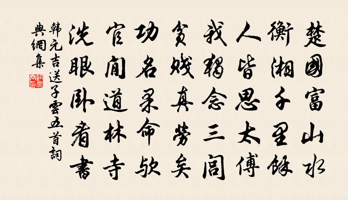詩詞名句歷史字典書法欣賞書法字典國語詞典說文解字康熙字典古漢語字典標 題 作 者 詩 句 送子云五首作者:韓元吉 朝代:宋代送子云五首原文楚國富山水,衡湘千里余。人皆思太傅,我獨念三閭。貧賤真勞矣,功名果命歟。官閒道林寺,洗眼臥看書。詩詞問答問:送子云五首的作者是誰?答:韓元吉問:送子云五首寫於哪個朝代?答:宋代問:韓元吉的名句有哪些?答:韓元吉名句大全韓元吉送子云五首書法欣賞送子云五首書法作品詩詞推薦寄題喻叔奇國傅郎中園亭二十六詠菊徑楊萬里〔宋代〕身在京師夢在鄉,黃花又是一番黃。平生不解淵明語,菊卻猶存徑卻荒。同永叔子聰游嵩山賦十二題其二拜馬澗梅堯臣〔宋代〕王子昔凌霓,國人茲拜馬。依稀日夜笙,聲入寒泉瀉。空傳七日期,飛鶴何時下。送絳州盧使君楊巨源〔唐代〕應將清淨結心期,又共陽和到郡時。絳老問年須算字,庾公逢月要題詩。朱欄迢遞因高勝,粉堞清明欲下遲。他日湖上逸人齊己〔唐代〕澹蕩光中翡翠飛,田田初出柳絲絲。吟沿綠島時逢鶴,醉泛清波或見龜。七澤釣師應識我,中原逐鹿不知誰。秋風書齋壁仇遠〔宋代〕風收細雨斷梅天,晝永身閒但欲眠。木枕桃笙真有味,廣文不用歡無氈。雪後許月卿六〔宋代〕萬木未春先玉蕊,千峰非浪亦銀山。雪融畢竟無蹤跡,依舊梅花耐歲寒。秋晚洛中道上王銍〔宋代〕數雁橫空送斷霞,窮秋遊子向天涯。泉甘野店黃梁酒,霜重荒原白菊花。滿目動灰傷井邑,回頭佳氣戀京華。故人黯淡趙汝鐩〔宋代〕黯淡四山暮,淒涼千里秋。功名常嘆老,衰病豈禁愁。孤雁影誰伴,亂蛩吟不休。一身天外客,雲儘是鄉州。竹葉酒蘇軾〔宋代〕楚人汲漢水,釀酒古宜城。春風吹酒熟,猶似漢江清。耆舊何人在,丘墳應已平。惟余竹葉在,留此千古情。嚴提舉輓詩戴表元〔宋代〕判得身煨爐,歌銘尚爾為。可憐蟬脫蛻,還許豹留皮。剡水歸來棹,柯山看斷棋。平生獨心處,臨卷費相思。雨後陸游〔宋代〕礎潤還成雨,雲收旋作晴。岩花分日發,林筍逐番生。筆硯行常具,軒窗晚更明。塵埃幸不到,那得廢詩情。第十七回回前詩曹雪芹〔清代〕豪華雖足羨,離別卻難堪。博得虛名在,誰人識苦甘?木芙蓉盛開四解宋祁〔宋代〕木末芙蓉語,當時不謂真。今來木末見,愁殺擬騷人。次韻酬劉彥直方回〔宋代〕稷下先生舊老成,十年江表聳雄名。觀星南極孤槎遠,賞月西湖獨榻橫。筆底篇章追夢得,樽前風味勝公榮。酒樓公子行雍陶〔唐代〕公子風流嫌錦繡,新裁白紵作春衣。金鞭留當誰家酒,拂柳穿花信馬歸。十二月初一日得梅一枝絕奇戲作長句今年於是陸游〔宋代〕高標已壓萬花群,尚恐嬌春習氣存。月兔搗霜供換骨,湘娥鼓瑟為招魂。孤城小驛初飛雪,斷角殘鍾半掩門。盡意永遇樂佚名〔宋代〕試問諸公,本來模樣,如何形狀。縱使丹青,難描這個,曠劫端嚴相。無形無影,觀之不見,聽之又無響。露堂堂和經父寄張繢二首孔平仲〔宋代〕解縱梟鴟啄鳳凰,天心似此亦難詳。但知斬馬憑孤劍,豈為摧車避太行!得者折腰猶下列,失之垂翅合南翔。不如瑞龍吟陳允平〔宋代〕長安路。還是燕乳鶯嬌,度簾遷樹。層樓十二闌乾,繡簾半卷,相思處處。漫憑佇。因念彩雲初到,瑣窗瓊戶。梨和何子應夜讀書馮時行〔宋代〕軒頊握元氣,堯舜法令疏。三王備文物,古意漸欲無。周平一東轍,列國異車書。祖龍失雲雨,大漢天為謨。後更名句推薦驚鳥去無際,寒蛩鳴我傍。馬戴《楚江懷古三首》 凡人之大體,取捨同者則相是也,取捨異者則相非也。韓非及後人《韓非子·奸劫弒臣》 無論習何等業,總不可有粗浮心。王永彬《圍爐夜話·第三五則》 誰憐散髻吹笙,天涯芳草關情。納蘭性德《清平樂·孤花片葉》 大家漸及消亡,難期其復振,勢成於因循也。王永彬《圍爐夜話·第三七則》 露從今夜白,月是故鄉明。杜甫《月夜憶舍弟》 長江春水綠堪染,蓮葉出水大如錢。張籍《春別曲》 身無彩鳳雙飛翼,心有靈犀一點通。李商隱《無題·昨夜星辰昨夜風》 獨在異鄉為異客,每逢佳節倍思親。王維《九月九日憶山東兄弟 / 九月九憶山東兄弟》 水漲魚天拍柳橋。雲鳩拖雨過江皋。周邦彥《浣溪沙·水漲魚天拍柳橋》