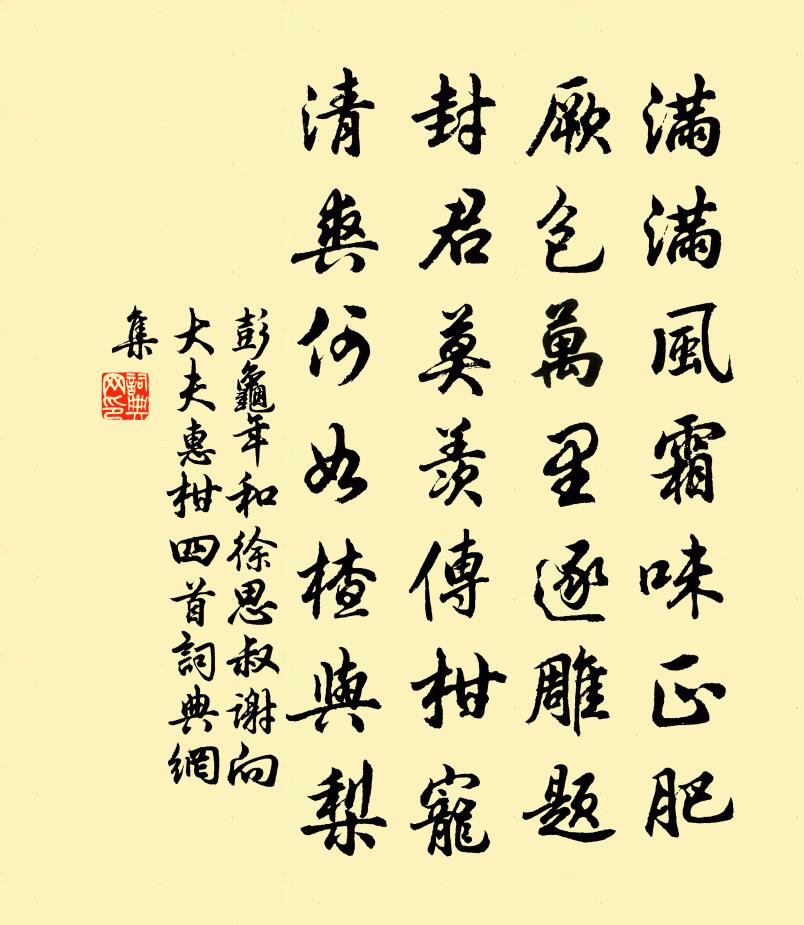 詩詞名句歷史字典書法欣賞書法字典國語詞典說文解字康熙字典古漢語字典標 題 作 者 詩 句 和徐思叔謝向大夫惠柑四首作者:彭龜年 朝代:宋代和徐思叔謝向大夫惠柑四首原文滿滿風霜味正肥,厥包萬里逐雕題。封君莫羨傳柑寵,清爽何如楂與梨。詩詞問答問:和徐思叔謝向大夫惠柑四首的作者是誰?答:彭龜年問:和徐思叔謝向大夫惠柑四首寫於哪個朝代?答:宋代彭龜年和徐思叔謝向大夫惠柑四首書法欣賞和徐思叔謝向大夫惠柑四首書法作品詩詞推薦丹桂楊簡〔宋代〕世眼紛紛丹與黃,廣寒宮裡亦如常。目前不作兩般見,筆下方騰萬丈光。且莫錙銖深淺色,也休斤兩淡濃香。靈根次韻湯寬仲惠四季木犀清烈妙甚姜特立〔宋代〕一歲常隨斗柄回,四時各占一時開。仙娥別有栽培術,長與山翁薦壽杯。書湖陰先生壁二首王安石〔宋代〕茅檐長掃淨無苔,花木成畦手自栽。一水護田將綠繞,兩山排闥送青來。桑條索漠楝花繁,風斂余香暗度垣。黃鳥縣圃十絕和朱待制薛抗〔宋代〕五斗雖甚微,偃鼠飲滿腹,大書歸來賦,有味數過讀。山行方岳〔宋代〕歲晚誰同澗谷槃,一牛呼犢野煙寒。村如有雪蕎花白,山未著霜桐葉丹。是處豐登茅店酒,老夫閒散竹皮冠。醉歸感春十三首張耒〔宋代〕夜醉朝未醒,披衣步南堂。折彼曉樹花,嗅此凝露香。好鳥鳴我林,聲如韻風篁。娟娟屋外杏,顧我如窺牆。物色奔避鄭谷〔唐代〕奔避投人遠,漂離易感恩。愁髯霜颯颯,病眼淚昏昏。孤館秋聲樹,寒江落照村。更聞歸路絕,新寨截荊門。萬年歡(次韻和季良)晁補之〔宋代〕憶昔論心,盡青雲少年,燕趙豪俊。二十南遊,曾上會稽千仞。捐袂江中往歲,有騷人、蘭蓀遺韻。嗟管鮑、當日次韻楊君全送春花黃庭堅〔宋代〕化工能斡大鈞回,不得東君花不開。誰道纖纖綠窗手,磨刀剪彩喚春來。詠藕陶弼〔宋代〕萬頃金沙里,誰將玉節栽。絲應鮫乞與,津是蚌分來。盤貯冰猶結,刀侵雪易摧。防風骨外折,混沌竅中開。月寺燕堂東偏一室頗深暖盡日率困於吏牘比夜乃得陸游〔宋代〕袞袞流年往,匆匆短景過。簾深上燈早,地窄貯香多。書盡還重讀,詩成更自喔。向令無此處,將奈旅愁何!曾無疑以長韻送金橘時已暮春次韻周必大〔宋代〕荼醾殿春枝滿霜,盧橘熟夏今乃黃。彈丸煌煌照坐光,老叟驚詫見未嘗。客言采果孟冬月,剖竹為符帶蒼雪。包之作書寄王晉卿忽憶前年寒食北城之遊走筆為此蘇軾〔宋代〕北城寒食煙火微,落花蝴蝶作團飛。王孫出遊樂忘歸,門前驄馬紫金鞿。吹笙帳底煙霏霏,行人舉頭誰敢睎。扣門題青溪神女祠次東坡韻呂皓〔宋代〕生居萬山中,二年依澤國。偶於僧曹暇,聊欲訪禪默。再拜神女祠,劈山定何術。上有琳公岩,作論期破惑。只今有病吟邵雍〔宋代〕一身如一國,有病當求醫。病癒藥便止,節宣良得宜。曲江亭望慈恩寺杏園花發曹著〔唐代〕渚亭臨淨域,憑望一開軒。晚日分初地,東風發杏園。異香飄九陌,麗色映千門。照灼瑤華散,葳蕤玉露繁。未教許待制輓詞樓鑰〔宋代〕十載更麾節,陽春萬里同。時時逢蜀士,一一話文翁。到處留遺愛,諸郎守教忠。慶源知未艾,往日有陰功。菩薩蠻 湖上即事劉因〔元代〕樓前曲浪歸橈急。樓中細雨春風涇。終日倚危闌。故人湖上山。高情渾似舊。只在東風瘦。薄晚去來休。裝成一段偈頌八十五首釋妙倫〔宋代〕隱隱煙村聞犬吠,欲尋尋不見人家。忽於橋斷溪回處,流出碧桃三四花。陳推官幽居十詠雨後觀瀑王炎〔宋代〕銀漢倒傾波浪,玉龍怒挾雷霆。雨後遙看更好,斬新泉白山青。名句推薦三年不上門,當親也不親。吳承恩《西遊記·第四十回》 鳥啼官路靜,花發毀垣空。張繼《清明日自西午橋至瓜岩村有懷》 春種一粒粟,秋收萬顆子。李紳《古風二首 / 憫農二首》 長條短葉翠濛濛,才過西風,又過東風。夏完淳《一剪梅·詠柳》 求之有道,得之有命,是求無益於得也,求在外者也。孟子《孟子·盡心章句上·第三節》 盈盈一水間,脈脈不得語。佚名《迢迢牽牛星》 爭奈愁來,一日卻為長賀鑄《行路難·縛虎手》 無限傷心夕照中,故國淒涼,剩粉余紅。夏完淳《一剪梅·詠柳》 萬里悲秋常作客,百年多病獨登台。杜甫《登高》 怒猊抉石,渴驥奔泉宋祁、歐陽修、范鎮、呂夏卿等《新唐書·列傳·卷八十五》