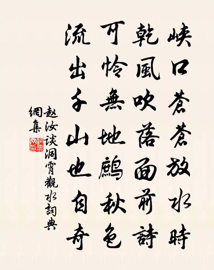 詩詞名句歷史字典書法欣賞書法字典國語詞典說文解字康熙字典古漢語字典標 題 作 者 詩 句 洞霄觀水作者:趙汝談 朝代:宋代洞霄觀水原文峽口蒼蒼放水時,乾風吹落面前詩。可憐無地鷓秋色,流出千山也自奇。詩詞問答問:洞霄觀水的作者是誰?答:趙汝談問:洞霄觀水寫於哪個朝代?答:宋代趙汝談洞霄觀水書法欣賞洞霄觀水書法作品詩詞推薦張京乾還故廨創茅亭揭以清心二首曾豐〔宋代〕歲月不饒與,簿書無了期。隨緣贏取懶,著意倒成痴。朝斂幕中板,晚圍檐下下碁。更防閒散里,忙甚坐曹時。賢者之孝二百四十首穆寧林同〔宋代〕儻非親所樂,至枉道而行。雖以三牲養,難辭不孝名。庭竹祝慶夫〔宋代〕庭前修竹長琅玕,任是隆冬不畏寒。戛玉篩金承雨露,亭亭青翠拂雲端。宣州竹(墨梅)呂本中〔宋代〕小溪蓬底湖風重。吹破凝酥動。一枝斜映庾門深。冷淡無言香泛、月華清。已經輕瘦誰為共。魂繞徐熙□。恥同桃辭閩王歸朝寄倪先輩翁承贊〔唐代〕時人莫訝再還鄉,簡冊分明劍佩光。駟馬高車太常樂,登庸門下憶賢良。題城南書院三十四詠張栻〔宋代〕秋風颯颯林塘晚,萬綠叢中數點紅。若識榮枯是真實,不知何物更談空。章和二年中李賀〔唐代〕雲蕭索,田風拂拂,麥芒如彗黍如粟。關中父老百領襦,關東吏人乏詬租。健犢春耕土膏黑,菖蒲叢叢沿水脈。殷最高樓 智郎中席上即一併序。予謝病北歸,盧摯〔元代〕轄龍川李公、鄂牧安侯思誠索詩,為賦最高樓兼貽仲廉郎中長沙客,寧食武昌魚。未覺故人疏。歸舟喚醒鄉關夢,朗湖道中因見二事信筆二首許月卿六〔宋代〕烏雀逢鸇皆憶鳳,鸕鶿遇獺等求魚。秋風散天無極,清曉冥冥鴻影孤。鳳歸雲二首佚名〔唐代〕金井欄邊見羽儀,梧桐枝上宿寒枝。五陵公子憐文彩,畫與佳人刺繡衣。飲啄蓬山最上頭,和煙飛下禁城秋。曾將郊園即事寄蕭侍郎(一作呈蕭常州復)戴叔倫〔唐代〕衰鬢辭餘秩,秋風入故園。結茅成暖室,汲井及清源。鄰里桑麻接,兒童笑語喧。終朝非役役,聊寄遠人言。謝松野叔惠菊羅公升〔宋代〕囷粟分公瑾,千金壽仲連。山人不須此,再拜菊花前。太皇太后閣六首蘇軾〔宋代〕日永蠶收簇,風高麥上場。朝來藉田令,菰黍獻時芳。水調歌頭倪偁〔宋代〕風卷暮雲盡,鏡淨一天秋。試把鵝黃新酒,細酌散閒愁。西望群山千疊,眇眇飛鴻沒處,爽氣與俱浮。且盡尊中綠挽謝淨安二首吳芾〔宋代〕耆舊今無幾,鄉閭素所依。官登五馬貴,年及七旬稀。一旦成長往,九原誰與歸。寒風吹畫翣,回首淚空揮。句丁謂〔宋代〕子美集開詩世界。偈頌二百零五首釋正覺〔宋代〕一燈分耀百千燈,個事宗家誰也曾。少室相傳斷臂可,黃梅分付墜腰能。甲子初冬宿直玉堂淒風小雨次日即承先帝晏駕馬廷鸞〔宋代〕雲黯天低結暝陰,孤燈對影夜沉沉。可憐一曲村田樂,猶是堯民擊壤音。減字木蘭花王觀〔宋代〕天之美祿。會飲思量平生福。一碩劉伶,五斗將來且解酲。百年長解。三萬六千能幾日。勸飲瑤觴。祝壽不如歲月婁師德引諺佚名〔唐代〕卒客無卒主人。名句推薦幾度紅窗,誤認鳴鑣。斷腸風月可憐宵。蔡伸《一剪梅·堆枕烏雲墮翠翹》 小桃枝下試羅裳,蝶粉斗遺香。陳子龍《訴衷情·春遊》 一朝春盡紅顏老,花落人亡兩不知。曹雪芹《紅樓夢·第二十七回》 信人莫若信己,防人毋存幸念。來俊臣《羅織經·閱人卷第一》 如何同枝葉,各自有枯榮李白《樹中草》 函車之獸,離山必斃;絕波之鱗,宕流則枯。沈約《宋書·列傳·卷七十》 燎沉香,消溽暑。周邦彥《蘇幕遮·燎沉香》 白雲江上故鄉,月下風前吟處。子蘭《秋日思舊山》 蕃甲鎖蛇鱗,馬嘶青冢白。李賀《塞下曲》 不知何歲月,得與爾同歸?韋承慶《南中詠雁詩》