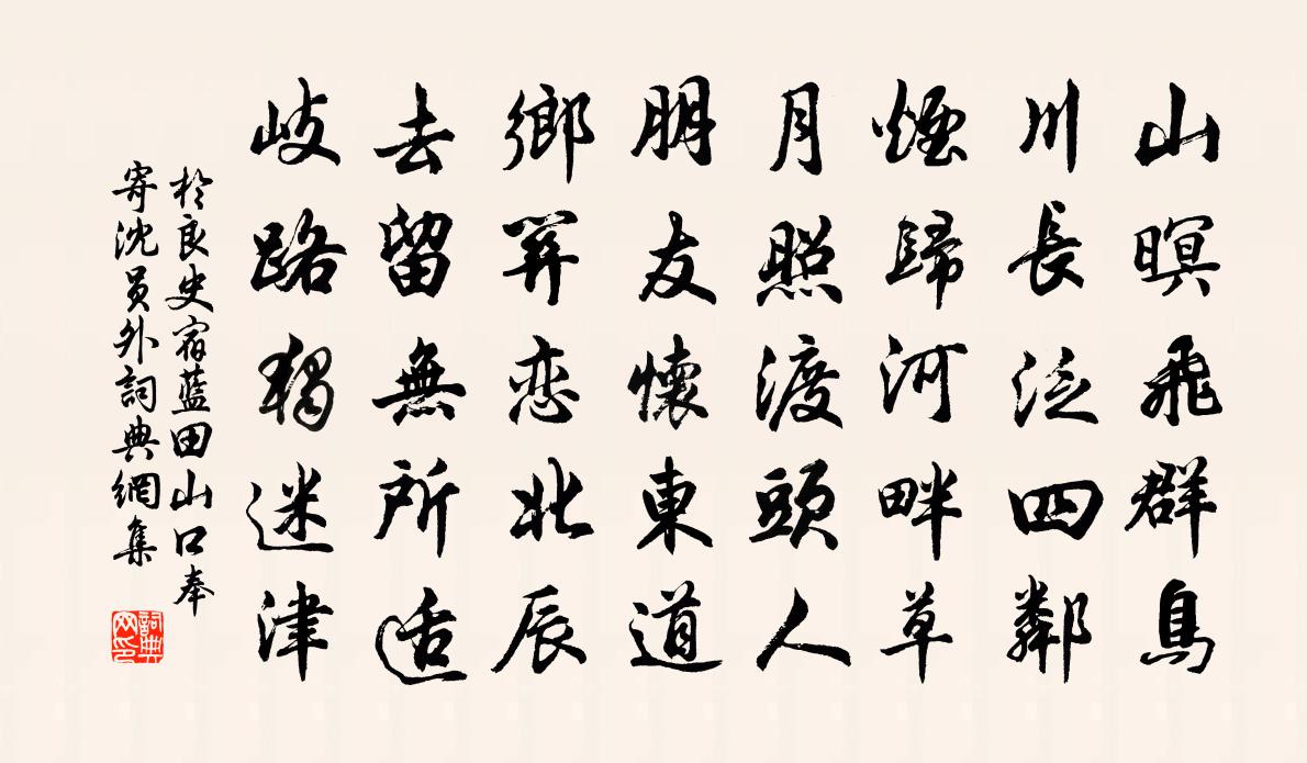 詩詞名句歷史字典書法欣賞書法字典國語詞典說文解字康熙字典古漢語字典標 題 作 者 詩 句 宿藍田山口奉寄沈員外作者:於良史 朝代:唐代宿藍田山口奉寄沈員外原文山暝飛群鳥,川長泛四鄰。煙歸河畔草,月照渡頭人。朋友懷東道,鄉關戀北辰。去留無所適,岐路獨迷津。詩詞問答問:宿藍田山口奉寄沈員外的作者是誰?答:於良史問:宿藍田山口奉寄沈員外寫於哪個朝代?答:唐代問:宿藍田山口奉寄沈員外是什麼體裁?答:五律於良史宿藍田山口奉寄沈員外書法欣賞宿藍田山口奉寄沈員外書法作品注釋全唐詩:卷275_4詩詞推薦古杭感事王鎡〔宋代〕入北鑾輿竟不回,銜花輦路長蒼苔。九重禁地為僧舍,六代園陵變劫灰。宋國衣冠春草綠,趙宮珠翠野花開。雖然水調歌頭葛郯〔宋代〕青銅昏水面,烏帽裹山頭。風濤如此,天公作意巧相留。常記垂虹晚渡,臥看菰蒲煙雨,屈指十三秋。恍若華胥夢杖藜王安石〔宋代〕杖藜隨水轉東岡,興罷還來赴一床。堯桀是非時入夢,固知余習未全忘。寄滁州歐陽永叔梅堯臣〔宋代〕昔讀韋公集,固多滁州詞。爛熳寫風土,下上窮幽奇。君今得此郡,名與前人馳。君才比江海,浩浩觀無涯。下筆水龍吟 詠揚州明月樓 南濠詞話貫雲石〔元代〕晚來碧海風沉,滿樓明月留人住。瓊花香外,玉笙初響,修眉如妒。十二闌乾,等閒隔斷,人間風雨。望畫橋檐影寄桐江隱者 [一作許渾詩。]杜牧〔唐代〕潮去潮來洲渚春,山花如繡草如茵。嚴陵台下桐江水,解釣鱸魚能幾人?偈頌一百四十一首釋師範〔宋代〕一飽忘百飢,人人盡展眉。太平無事日,唱個囉囉哩。荔支盛熟四絕劉克莊〔宋代〕牡丹姚魏荔方陳,歐蔡亡來罕識真。縱使有文堪續譜,未知楷法屬何人。琉璃灘陳岩〔宋代〕青青琉璃手可拈,寒花多在雨中添。高風不捲銀河浪,仿佛康王谷里簾。千秋歲趙聞禮〔宋代〕鶯啼晴晝,南國春如繡。飛絮眼,憑闌袖。日長花片落,睡起眉山斗。無個事,沉煙一縷騰金獸。千里空回首。兩文殊台錢聞詩〔宋代〕五台山里現文殊,人指此台名似虛。正馬東峰有獅子,恐曾高跨入匡廬。隴頭水江總〔隋代〕霧暗山中日。風驚隴上秋。徒傷幽咽響。不見東西流。無期從此別。更度幾年幽。遙聞玉關道。望入杳悠悠。有感二首劉克莊〔宋代〕桓司馬欲兵夫子,哥利王曾醜釋迦。血面何須九墜臂,忮心終不怨鏌鎁。浪淘沙周密〔宋代〕芳草碧茸茸。染恨無窮。一春心事雨聲中。窄索宮羅寒尚峭,閒倚熏籠。猶記粉闌東。同醉香叢。金鞍何處驟驊驄句崔暨〔宋代〕居占梅仙里。西江月馬鈺〔元代〕人總貪生盡死,我今認死長生。這般徑路少人行。悟後舍家勇猛。休說玄元難解,我觀容易分明。要君守拙絕多能慶源宣義王丈,以累舉得官,為洪雅主簿,雅蘇軾〔宋代〕青衫半作霜葉枯,遇民如兒吏如奴。吏民莫作官長看,我是識字耕田夫。妻啼兒號刺史怒,時有野人來挽須。拂衣丙辰年鄜州遇寒食城外醉吟五首韋莊〔唐代〕滿街楊柳綠絲煙,畫出清明二月天。好是隔簾花樹動,女郎撩亂送鞦韆。雕陰寒食足遊人,金鳳羅衣濕麝薰。腸斷送鄧器先赴羅田尉五首曾協〔宋代〕古郡有奇觀,祖祖燈相傳。子來後往哲,青山古依然。紛紛簿領中,深觀常安然。但內外盡,飢餐困須眠。賞蓮趙濟〔宋代〕芒鞋竹杖踏晴沙,雲白山青老歲華。太極一丸融造化,賞心應不為荷花。名句推薦東船西舫悄無言,唯見江心秋月白。白居易《琵琶行 / 琵琶引》 誰知得酒尚能狂,脫帽向人時大叫。陸游《三月十七日夜醉中作》 曉風不散愁千點,宿雨還添淚一痕。曹雪芹《詠白海棠》 何日歸家洗客袍?銀字笙調,心字香燒。蔣捷《一剪梅·舟過吳江》 小人錯其在己者,而慕其在天者。荀子《荀子·天論》 遠送從此別,青山空復情。杜甫《奉濟驛重送嚴公四韻》 寧為太平犬,莫作亂離人!馮夢龍《醒世恆言·卷三》 江湖多風波,舟楫恐失墜。杜甫《夢李白二首·其二》 雨過一蟬噪,飄蕭松桂秋。杜牧《題揚州禪智寺》 廣陵城裡昔繁華,煬帝行宮接紫霞。曾棨《維揚懷古》