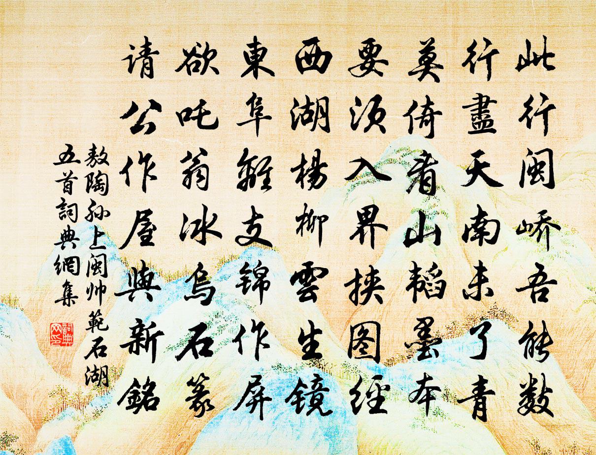 詩詞名句歷史字典書法欣賞書法字典國語詞典說文解字康熙字典古漢語字典標 題 作 者 詩 句 上閩帥范石湖五首作者:敖陶孫 朝代:宋代上閩帥范石湖五首原文此行閩嶠吾能數,行盡天南未了青。莫倚看山韜墨本,要須入界挾圖經。西湖楊柳雲生鏡,東阜離支錦作屏。欲吒翁冰烏石篆,請公作屋與新銘。詩詞問答問:上閩帥范石湖五首的作者是誰?答:敖陶孫問:上閩帥范石湖五首寫於哪個朝代?答:宋代問:上閩帥范石湖五首是什麼體裁?答:七律敖陶孫上閩帥范石湖五首書法欣賞上閩帥范石湖五首書法作品詩詞推薦雜興四首林逋〔宋代〕散帙揮毫總不忺,病懷愁緒坐相兼。苔痕作意生秋壁,樹影無端上古簾。一壑等閒甘汩汩,五門平昔避炎炎。惟應與侯春時同年南池夜話許渾〔唐代〕蘆葦暮修修,溪禽上釣舟。露涼花斂夕,風靜竹含秋。素志應難契,清言豈易求。相歡一瓢酒,明日醉西樓。和彥威紀事二首程公許〔宋代〕民勞無訴卒長片,安得天河洗甲兵。虎出柙誰當任責,鳥傷弓後可無驚。峽山風雪清尊共,楚澤雲濤去棹輕。憂國秋日感懷孔武仲〔宋代〕萬山松色鎖蟬嗚,日透林陰上下清。霜壓蒹葭連地白,風吹河漢滿天聲。穹廬夜動陰山虜,玉甲朝屯紫塞兵。願漱再和晁說之〔宋代〕頃歲官嘗傍紫虛,嵩雲緱月笑談余。惟知猿鶴乞骸疏,不錄熊羆諫獵書。游寺但知能自與,焚舟不復問何如。岩廊鈷鉧潭西小丘記柳宗元〔唐代〕得西山後八日,尋山口西北道二百步,又得鈷鉧潭。西二十五步,當湍而浚者為魚梁。梁之上有丘焉,生竹樹。其茶荔謠熊禾〔宋代〕陽春播一氣,著處成芳菲。閩地本荒落,山川亦何奇。贏劉始為郡,望秩暨武夷。通仕良鮮少,貢入還稀微。晚唐還家秋夕飲中喜雨楊萬里〔宋代〕好風有意入金台,白酒無聲落玊林。秋雨亦嫌秋熱在,打荷飄竹為人來。環州通判張殿丞梅堯臣〔宋代〕欲向蕭關外,窮陰雪暗沙。磧寒鴻雁少,冰合水泉賒。自有從軍樂,應無去國嗟。春風曾不到,吹角寄梅花。送退齋先生歸武夷林若存〔宋代〕我七君六旬,從會知無期。但貪言議合,不誤光景非。先生明當別,吾將儔決疑。欲言尚何限,記一十已遺。南鄉子(送朱元晦行,張欽夫、邢少連同集張孝祥)張孝祥〔宋代〕江上送歸船。風雨排空浪拍天。賴有清尊澆別恨,悽然。寶蠟燒花看吸川。楚舞對湘弦。暖響圍春錦帳氈。坐上定靈岩李迪〔宋代〕靈岩宮山勢異,宮金地景難宮窮。塔影遮層漢,鐘聲落半空。千峰羅雉堞,萬仞聳屏風。飛鶴來清竇,刳魚掛古桐恨歡遲王哲〔元代〕名*排三本姓王。字知明子號重陽。似菊花如要清香。吐緩緩,等濃霜。學易年高便道裝。遇淵明、語我嘉祥。指和南仲見寄仇遠〔宋代〕我本西湖一散人,偶來溪上濯烏巾。波光綠映台城柳,山色青回句曲春。客舍相親那忍別,交情到老願如新。江南登嵩山十首 法華岩蘇轍〔宋代〕飛橋走岩居,茅屋今已破。何年避世僧,此地常獨臥。秋風高鳥入,夜月寒猿過。自非心已灰,靜極生悲惰。初秋夢故山覺而有作陸游〔宋代〕昔我東歸時,父老迎船頭。開篷相勞苦,怪我領雪稠。故山何負君,且作數月留。豈知席未暖,疋馬來南州。蠻花句丁謂〔宋代〕珊瑚新筆架,雲母舊屏風。竹棕文同〔宋代〕秀乾扶疏彩檻新,琅玕一束淨無塵。重苞吐實黃金穗,密葉圍條碧玉輪。凌犯雪霜持勁節,遮藏煙雨長輕筠。此名酬襲美見寄海蟹陸龜蒙〔唐代〕藥杯應阻蟹螯香,卻乞江邊采捕郎。自是揚雄知郭索,且非何胤敢餦餭。骨清猶似含春靄,沫白還疑帶海霜。強作登峴首阻雨楊時〔宋代〕江風飛雨上雕欄,庭樹蕭蕭影自閒。向晚微雲遮不盡,好山渾在有無間。名句推薦沉恨細思,不如桃杏,猶解嫁東風。張先《一叢花令·傷高懷遠幾時窮》 懷家寒食夜,中酒落花天。趙長卿《臨江仙·暮春》 沖天香陣透長安,滿城盡帶黃金甲。黃巢《不第後賦菊》 彩舟載得離愁動。無端更借樵風送。賀鑄《菩薩蠻·彩舟載得離愁動》 道傍榆莢仍似錢,摘來沽酒君肯否。岑參《戲問花門酒家翁》 對酒捲簾邀明月,風露透窗紗。蘇軾《少年游·潤州作》 花滿河陽,為君羞褪晨妝茜。吳文英《燭影搖紅·賦德清縣圃古紅梅》 不知香積寺,數里入雲峰王維《過香積寺》 暗相思,無處說,惆悵夜來煙月。韋莊《應天長·別來半歲音書絕》 恩仇不可太明,明則人起攜貳之志。洪應明《菜根譚·概論》