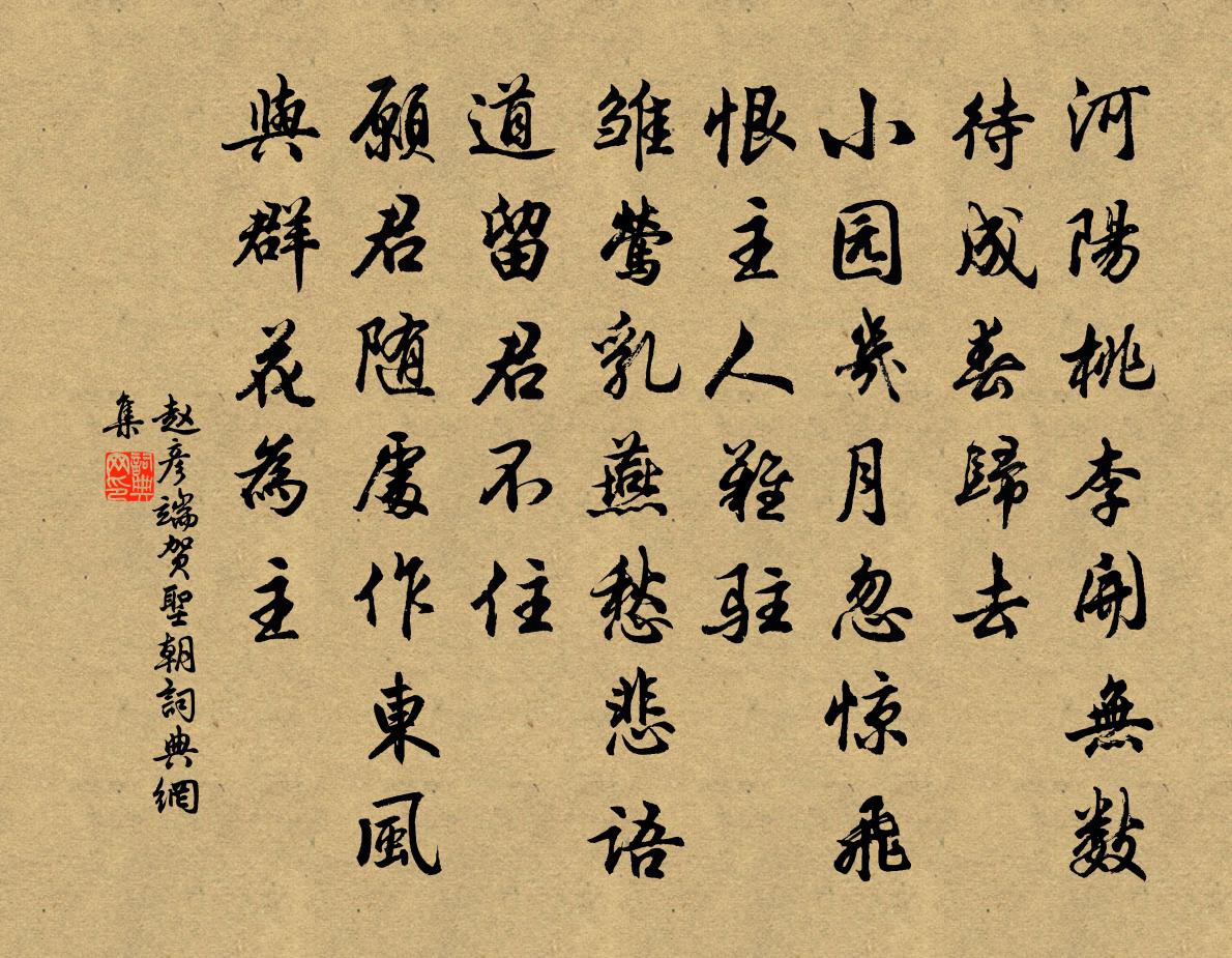 詩詞名句歷史字典書法欣賞書法字典國語詞典說文解字康熙字典古漢語字典標 題 作 者 詩 句 賀聖朝作者:趙彥端 朝代:宋代賀聖朝原文河陽桃李開無數。待成春歸去。小園幾月忽驚飛,恨主人難駐。雛鶯乳燕愁悲語。道留君不住。願君隨處作東風,與群花為主。詩詞問答問:賀聖朝的作者是誰?答:趙彥端問:賀聖朝寫於哪個朝代?答:宋代問:賀聖朝是什麼體裁?答:詞趙彥端賀聖朝書法欣賞賀聖朝書法作品詩詞推薦陪陳帥登孺子亭一首王阮〔宋代〕未上滕王閣,先登孺子亭。朝廷黨錮傳,湖海少微星。獨善非忘世,高風自有靈。東湖山上色,長為此人青。邠風陸游〔宋代〕少學詩三百,邠風最力行。春前耕犢健,節近祭豬鳴。檐日桑榆暖,園蔬風露清。金丹不須問,持此畢吾生。賀元樞游先生除右相宋伯仁〔宋代〕元樞登相未為奇,奇在先生甚懶為。四海熙熙今有日,九重眷眷已多時。人才豈用拘彝調,邊事常如援拙棋。天下謝李伯時自臨安見過台州二首曹勛〔宋代〕念公萬里回異俗,睠我南來忘趼足。它時短幅問死生,為向荒寒訪雲屋。相和歌辭·江南曲丁仙芝〔唐代〕長乾斜路北,近浦是兒家。有意來相訪,明朝出浣紗。發向橫塘口,船開值急流。知郎舊時意,且請攏船頭。昨暝頌古四十五首釋如珙〔宋代〕是定出得不得,關捩初無多子。文殊神通太過,罔明輕輕彈指。昨日於竹堂後開一逕通南坡甚近從此便於往還虞儔〔宋代〕先生一室如懸罄,彈鋏浩歌誰復聽。籃輿每出欠僕夫,蹇驢試跨愁泥濘。南坡日涉恐負渠,寸步躋攀如折脛。偶向章塢庵趙蕃〔宋代〕路盡庵才出,雲深山更藏。陂池新得水,松檜舊成行。午供隨齋缽,留題陟上方。林鳩方喚雨,歸路恐相妨。送秦秘監以顯謨知潼川魏了翁〔宋代〕杜侯歸未幾,又送秦侯歸。錦衣赫相望,里閈生光輝。僅存二三士,去意不可羈。王張屢乞身,余亦五請祠。豈不送薛子舒福州省覲徐照〔宋代〕一馬背西風,斑衣與古同。暫時離膝下,鄰郡是閩中。到日殘秋兔,還期早塞鴻。即須同邑里,來迓黑頭公。晚過常州楊萬里〔宋代〕常州曾作兩年住,一別重來十年許。岸頭楊柳記得無,總是行春繫船處。自笑恍如丁令威,老懷成喜亦成悲。人民相思引袁去華〔宋代〕皓齒清歌絕代音。眼波斜處寄情深。東風吹散,雲雨杳難尋。試手羅箋花樣在,唾窗茸線暗塵侵。向來多事,觸緒句周式〔宋代〕花前嫫母醜,雪裡屈原醒。為人賦橫舟二首陳容〔宋代〕古悲歌,淚如血,渡河無船氣欲絕。古非歌,淚如泉,河激湯湯聲徹天。峨舸大艑載琛貝,錦纜迷樓催管弦。人生挽黃提舉震三章陳著〔宋代〕文弊莫如今,獨存師古心。汲深六經海,茹實百家林。公有傳賢筆,私無諛墓金。晚年北山北,誰識醒中吟。頌證道歌證道歌釋印肅〔宋代〕何表無生慈忍力,洞庭撞倒虛空吃。不留絲髮與人知,摩訶般若波羅蜜。官舍假日書懷奉呈子華內翰長文原甫景仁舍人歐陽修〔宋代〕鎖印春風雪人簾,天寒鳥雀聚空檐。青幡受歲兒童喜,白髮催人老病添。 * 回腰飛玉盞,清吟擁鼻對冰蟾。相從減字木蘭花佚名〔宋代〕園林衰槁。一品梅花開太早。紫蕊檀心。獨占中央色似金。幽香清遠。對景開尊同賞玩。雅稱仙姿。莫是多情染相定風波元好問〔金代〕何處如今更有詩。爭教風鬢見橫枝。詩到梅邊誰最似。除是。玉顏寂寞酒清時。為向雲間公子道。聞早。安排歡賞春帖子詞二十首皇帝合六首歐陽修〔宋代〕熙熙人物樂春台,風送春從天上來。玉輦經年不游幸,上林花好莫爭開。名句推薦慈母倚門情,遊子行路苦。王冕《墨萱圖·其一》 人主莫喜強臣,臣下戒懷妄念。來俊臣《羅織經·事上卷第二》 寒禽與衰草,處處伴愁顏。司空曙《賊平後送人北歸》 獨夜憶秦關,聽鍾未眠客。韋應物《夕次盱眙縣》 寧我負人,毋人負我。陳壽《三國志·魏書·武帝紀》 錦江近西煙水綠,新雨山頭荔枝熟。張籍《成都曲》 坤至柔而動也剛,至靜而德方佚名《易傳·文言傳·坤文言》 上窮碧落下黃泉,兩處茫茫皆不見。白居易《長恨歌》 昨夜西風凋碧樹,獨上高樓,望盡天涯路。晏殊《蝶戀花·檻菊愁煙蘭泣露》 琴里知聞唯淥水,茶中故舊是蒙山。白居易《琴茶》