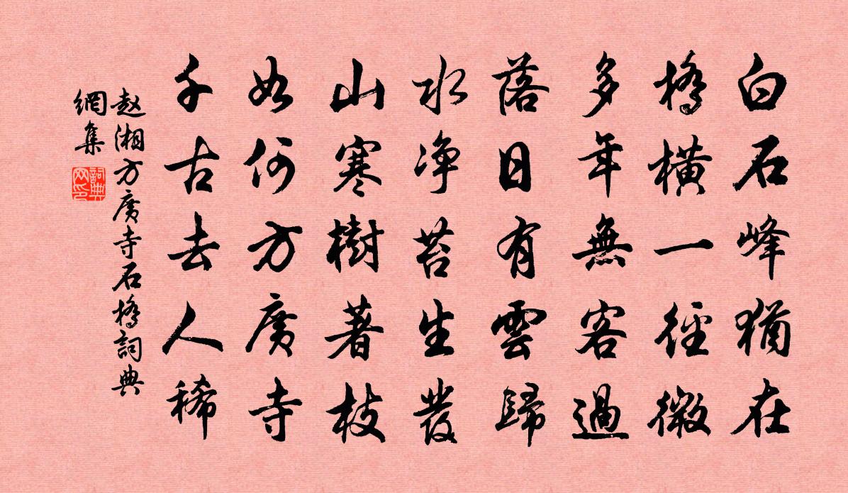 詩詞名句歷史字典書法欣賞書法字典國語詞典說文解字康熙字典古漢語字典標 題 作 者 詩 句 方廣寺石橋作者:趙湘 朝代:唐代方廣寺石橋原文白石峰猶在,橋橫一徑微。多年無客過,落日有雲歸。水淨苔生髮,山寒樹著枝。如何方廣寺,千古去人稀。詩詞問答問:方廣寺石橋的作者是誰?答:趙湘問:方廣寺石橋寫於哪個朝代?答:唐代趙湘方廣寺石橋書法欣賞方廣寺石橋書法作品詩詞推薦蘇幕遮 勸李哥馬鈺〔元代〕羊兒皮,虎兒質。害物心機,盡夜無寧息。雖惡肯將兒子食。休逞威風,真性宜調習。親非親,識非識。雲水清閒揚州選蒙相公賞判雪後呈上崔峒〔唐代〕自得山公許,休耕海上田。慚看長史傳,欲棄釣魚船。窮巷殷憂日,蕪城雨雪天。此時瞻相府,心事比旌懸。臘後楊萬里〔宋代〕雲暗虛疑暮,江空分外寒。如何山雨過,便爾岸沙乾。柰此詩愁得,懷哉歲事闌。梅殘吾更忍,不折一枝看。哨遍(春詞)蘇軾〔宋代〕睡起畫堂,銀蒜押簾,珠幕雲垂地。初雨歇,洗出碧羅天,正溶溶養花天氣。一霎暖風回芳草,榮光浮動,掩皺銀江北梅開殊晚和林實之別駕韻孫應時〔宋代〕楚江橫月一枝明,想見江南半落英。等是春風有先後,不妨調鼎看功成。木蘭花慢 殷獻臣伯德孝先奉使日本,索詩送胡祗遹〔元代〕要深名洋溢,須涉險,卒奇功。盡萬里蒼溟,魚龍吹浪,□□□□。□□□□□□,□□□□□□□□。□□□□十四夜月趙蕃〔宋代〕既夕風猶進,凌空月故遲。明宵縱當滿,今夕可乖期。少壯欣逢節,年侵意自悲。平生一杯酒,即事五言詩。蜘蛛諷孟郊〔唐代〕萬類皆有性,各各稟天和。蠶身與汝身,汝身何太訛。蠶身不為己,汝身不為佗。蠶絲為衣裳,汝絲為網羅。濟物再用前韻各賦三解吳潛〔宋代〕九天膏澤沛群方,盡掃螟蝗蝥蟘殃。即刻焦煩成爽塏,何時繁富換荒涼。滌場定是多遺秉,棲畝爰知有剩糧。卻笑送洪史君赴闕移節會府吳儆〔宋代〕史君文彩漢相如,暫向明時綰左符。為郡似家身似客,視民如子吏如奴。魯公金石光千古,吏部文章妙兩都。戴白倦尋芳(餞周糾定夫)吳文英〔宋代〕暮帆掛雨,冰岸飛梅,春思零亂。送客將歸,偏是故宮離苑。醉酒曾同涼月舞,尋芳還隔江塵面。去難留,悵芙蓉種菊徐照〔宋代〕屈平發悲吟,采之療飢腹。人貌歲不同,興嘆有荀昱。遠人陶淵明,釀酒不等熟。醉把菊花枝,醅濁巾可漉。從道損舅乞移山藥韓維〔宋代〕弱歲抱衰病,好讀神農經。雜然眾藥品,粗識性與形。商於岩谷間,厥產芝術菁。山家乘冬采,氣烈味亦並。常思不寐十首方回〔宋代〕夜眠才合眼,即見此諸公。骸骨已應朽,精神猶自通。老懷常忽忽,暮景極匆匆。知己恩難報,皇天識寸衷。嘲杜鵑白玉蟾〔宋代〕杜宇聲聲蓋自嗟,春殘何事更天涯。不歸則是歸還是,伊是無家或有家。王希武通判輓詞范成大〔宋代〕當代名臣後,惟公奕世賢。及親三釜養,遺子一經傳。藥石探奇字,芸香緝斷編。堂堂今不見,塵跡自依然。用山谷題借景軒賦史簿清蔭釋寶曇〔宋代〕竹君如餘子琴張,友此百十庸何傷。聽渠風雨夜深語,撼我窗幾無邊涼。起來顛倒急穿襪,直恐吾廬變林樾。卻煩自順陽至均房道五首用陳符寶去非韻張嵲〔宋代〕行客路正遠,曦馭已西馳。霜風吹草樹,眇眇連荒陂。如何羈旅懷,更值搖落時。四序欻已晚,我生可無衰。尚紆江常庵出武夷張至龍〔宋代〕厭居京洛說行持,袖裹青蛇上武夷。仟為寫真供御覽,天憐病眼召神醫。江中白石差龍斲,洞裡蒼松帶鶴移。無事丘安人輓詩葉適〔宋代〕左司遺事遠,介婦古風存。為廣添新宅,儒多起舊門。真亭留壽影,雲物護山原。我欲攀車別,衰殘阻故園。名句推薦善有善報,惡有惡報。佚名《增廣賢文·上集》 樓外垂楊千萬縷。欲系青春,少住春還去。朱淑真《蝶戀花·送春》 任你官清似水,難逃吏滑如油。馮夢龍《醒世恆言·卷二十》 玉手佳人,笑把琵琶理。顧德輝《蝶戀花·春江暖漲桃花水》 父之讎,弗與共戴天。兄弟之讎不反兵。交遊之讎不同國。戴聖《禮記·曲禮上》 蚊蟲遭扇打,只因嘴傷人!佚名《增廣賢文·下集》 何似當筵虎士,揮手弦聲響處,雙雁落遙空。葉夢得《水調歌頭·九月望日與客習射西園余偶病不能射》 人心險于山川,難於知天。莊子《莊子·雜篇·列禦寇》 觸簾風送景陽鍾,鴛被繡花重。顧敻《虞美人·觸簾風送景陽鍾》 人歸落雁後,思發在花前。薛道衡《人日思歸》