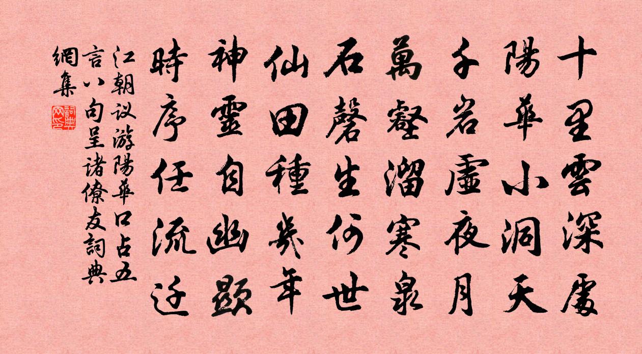 詩詞名句歷史字典書法欣賞書法字典國語詞典說文解字康熙字典古漢語字典標 題 作 者 詩 句 游陽華口占五言八句呈諸僚友作者:江朝議 朝代:宋代原文十里雲深處,陽華小洞天。千岩虛夜月,萬壑溜寒泉。石磬生何世,仙田種幾年。神靈自幽顯,時序任流遷。詩詞問答問:《游陽華口占五言八句呈諸僚友》的作者是誰?答:江朝議問:該詩寫於哪個朝代?答:宋代書法欣賞游陽華口占五言八句呈諸僚友書法作品詩詞推薦天仙子張孝祥〔宋代〕三月灞橋煙共雨。拂拂依依飛到處。雪逑輕揚弄精神,撲不住。留不住。常系柔腸千萬縷。只恐舞風無定據。容易調笑令秦觀〔宋代〕輦路,江楓古。樓上 * 人在否?菱花半璧香塵污。往日繁華何處,舊歡新愛誰是主。啼笑兩難分付。杜鵑花方乾〔唐代〕未問移栽日,先愁落地時。疏中從間葉,密處莫燒枝。郢客教誰探,胡蜂是自知。周回兩三步,常有醉鄉期。北橋送客張耒〔宋代〕橋上垂楊系馬嘶,橋頭船尾插青旗。船來船去知多少,橋北橋南長別離。亭上幾傾行客酒,遊人自唱少年辭。百年聖號雅二篇趙湘〔唐代〕皇振厥猷,法天以寧。我法我度,我經我營。或風或雨,或雷或霆。日月昭然,奮皇之明。霜肅以平,露澤以清。和吳侍御被使燕然盧照鄰〔唐代〕春歸龍塞北,騎指雁門垂。胡笳折楊柳,漢使采燕支。戍城聊一望,花雪幾參差。關山有新曲,應向笛中吹。與子瞻會松江得浪字秦觀〔宋代〕松江浩無旁,垂虹跨其上。漫然銜洞庭,領略非一狀。怳如陳平野,萬馬攢穹帳。離離雲抹山,窅窅天粘浪。煙中【中呂】普天樂_贈白玉梅滴張可久〔元代〕贈白玉梅滴仙名,樂天姓。緇塵不染,玉骨長清。西樓羌管聲,東閣新詩興。艷紫妖紅塵俗病,論風流讓與瓊瓊。曉邊張鎡〔宋代〕曉邊花面雨蒙忪,鶯避金丸翠竹叢。春半風光自招舉,按歌姑洗旋移宮。東湖晚步洪恩橋海棠洞三首陳杰〔宋代〕百花洲前萬柳堤,一川紅綠醉春時。樓台忽斷見西爽,鶯燕正深聞子規。疊字招隱二首白玉蟾〔宋代〕逐逐且貪怎足。戀松楸,愛蓮菊。食玉衣錦,池酒林肉。瓮埋地閣鍾,月瀉天窗瀑。鄭衛殆塞其聰,趙燕可盲其目偈頌八十五首釋妙倫〔宋代〕擒虎兕,辨龍蛇。一句子,絕周遮。太白不曾登便殿,筆頭昨夜自生花。戊申年七夕五絕薛映〔宋代〕月放冰輪傍絳河,丁期寶婺夜經過。嫦娥不惜宮中桂,乞與天香分外多。浣溪沙納蘭性德〔清代〕十里湖光載酒游,青簾低映白苹洲。西風聽徹采菱謳。沙岸有時雙袖擁,畫船何處一竿收。歸來無語晚妝樓。木蘭花(海棠·三之二·林鐘商)柳永〔宋代〕東風催露千嬌面。欲綻紅深開處淺。日高梳洗甚時忄欠,點滴燕脂勻未遍。霏微雨罷殘陽院。洗出都城新錦段。美偈頌一百六十首釋宗杲〔宋代〕丹霞燒木佛,院主眉須落。鳥飛毛墜,魚行水濁,要識真麒麟,只有一隻角。哭十侄李覯〔宋代〕到官六月寄書回,未病封題死後開。一命至卑人盡得,九泉何事獨相催。唯憂旅櫬還鄉遠,況是親喪繼踵來。數世楊本勝說於長安見小男阿袞李商隱〔唐代〕聞君來日下,見我最嬌兒。漸大啼應數,長貧學恐遲。寄人龍種瘦,失母鳳雛痴。語罷休邊角,青燈兩鬢絲。有感仇遠〔宋代〕腐儒乖世用,作事例迂疏。浪走長安道,欲投光範書。懸知成漫爾,可笑賦歸與。寄語陳言者,毋輕出草廬。和陶詠三良蘇軾〔宋代〕此生太山重,忽作鴻毛遺。三子死一言,所死良已微。賢哉晏平仲,事君不以私。我豈犬馬哉,從君求蓋帷。殺身名句推薦白雲映水搖空城,白露垂珠滴秋月。李白《金陵城西樓月下吟》 朔方正月雪澌澌,單于策馬至京西沈約《昭君辭》 今夕何夕,見此良人?佚名《綢繆》 暮雲收盡溢清寒。銀漢無聲轉玉盤。蘇軾《陽關曲 / 中秋月》 我住長江頭,君住長江尾。李之儀《卜運算元·我住長江頭》 黃霧漲天雪晦冥,黑雲拂地風膻腥沈約《昭君辭》 相逢秋月滿,更值夜螢飛。王績《秋夜喜遇王處士》 君子不以言舉人,不以人廢言。孔子弟子《論語·衛靈公篇》 對飲食,勿揀擇。食適可,勿過則。李毓秀《弟子規·謹》 嗚呼!楚雖三戶能亡秦,豈有堂堂中國空無人!陸游《金錯刀行》