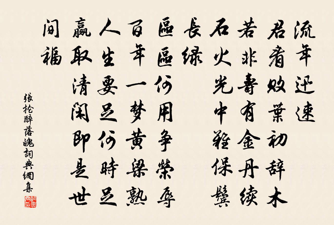 詩詞名句歷史字典書法欣賞書法字典國語詞典說文解字康熙字典古漢語字典標 題 作 者 詩 句 醉落魄/一斛珠作者:張掄 朝代:宋代醉落魄/一斛珠原文流年迅速。君看敗葉初辭木。若非壽有金丹續。石火光中,難保鬢長綠。區區何用爭榮辱。百年一夢黃梁熟。人生要足何時足。贏取清閒,即是世間福。詩詞問答問:醉落魄/一斛珠的作者是誰?答:張掄問:醉落魄/一斛珠寫於哪個朝代?答:宋代問:醉落魄/一斛珠是什麼體裁?答:詞張掄醉落魄/一斛珠書法欣賞醉落魄/一斛珠書法作品詩詞推薦冬日北庭懷餘杭舊僚屬蘇頌〔宋代〕曾約尋山春水間,越江吳岫遍留連。沙頭寺院看花日,湖上樓台試茗天。酒後歌呼常薄暮,風流雲散忽經年。異方辭唱歌韓愈〔唐代〕抑逼教唱歌,不解看艷詞。坐中把酒人,豈有歡樂姿。幸有伶者婦,腰身如柳枝。但令送君酒,如醉如憨痴。聲自詠雜花詩何遜〔南北朝〕井上發新花。誰言不經染。已如薄紫拂。復似濃紅點。狀錦無裁縫。依霞有舒斂。陪實之登姜峰絕頂鐫石黃公度〔宋代〕抱琴歷高峰,拂石就晚陰。空山對搖落,懷哉千古心。次陳宰韻陳造〔宋代〕觥籌交錯舞僛僛,曉色侵窗客未知。便整醉魂乘款段,尚餘吟興屬酴醾。還家擬趁寶瓔珞,喚客重乾金屈卮。著意追和東坡梅花十絕王之道〔宋代〕絳跗檀口映冰肌,踏雪來看帶雪枝。一見遂能消鄙恡,汝南誰敢忽牛醫。次韻子瞻初到杭州見寄二絕蘇轍〔宋代〕吏治區區豈不任,吳中已自富才能。還應占位書名姓,學取藍田崔縣丞。試盡風波萬里身,到官山水卻宜人。君知鷓鴣天魏了翁〔宋代〕誰把璇璣運化工。參旗又掛玉梅東。三三律琯聲餘亥,九九玄經卦起中。新歲月,舊遊從。一觴還似去年冬。人間秋興陸游〔宋代〕蓬蒿門巷絕經過,清夜何人與晤歌?蟋蟀獨知秋令早,芭蕉正得雨聲多。傳家產業遺書富,玩世神通醉臉酡。如許北園籬外放步陸游〔宋代〕北園西出路逶迤,荊作門扉枳縛籬。鋤麥正忙人滿野,營巢未定鵲爭枝。招呼父老嘗新釀,約束兒童築壞陂。遇興至日早雪時郊祀畢壬寅之二晁說之〔宋代〕冬來無雪待佳辰,玉日飛霙喜更新。風偃南郊雲獻瑞,龍騰北陸日潛春。壁門仗下千官佩,瑤席歌前萬國珍。負亹題明叔郎中海月吹笛圖李彌遜〔宋代〕天上星郎騎省孫,興隨孤月到無垠。浮槎夜入魚龍宅,橫竹秋生海岳雲。控鯉丹成終獨往,騎鯨仙去杳難群。紛紛織女懷牽牛曹唐〔唐代〕北斗佳人雙淚流,眼穿腸斷為牽牛。封題錦字凝新恨,拋擲金梭織舊愁。桂樹三春煙漠漠,銀河一水夜悠悠。欲將季秋蘇五弟纓江樓夜宴崔十三評事、韋少府侄三首杜甫〔唐代〕峽險江驚急,樓高月迥明。一時今夕會,萬里故鄉情。星落黃姑渚,秋辭白帝城。老人因酒病,堅坐看君傾。明月寂寂張耒〔宋代〕寂寂秋日暮,輝輝檐影斜。鳴蟲隱衰蔓,晚蝶守余花。雨急荷翻葉,牆崩竹引芽。不才非吏隱,雞黍學山家。淘金山陳世卿〔宋代〕未覆一簣土,便作千仞觀。一自登巉岩,培塿視群山。謁敦詩先生因留一絕蘇軾〔宋代〕凜凜人言君似雪,我言凜凜雪如君。時人盡怪蘇司業,不解將錢與廣文。聽郢客歌陽春白雪歐陽袞〔唐代〕寂聽郢中人,高歌已絕倫。臨風飄白雪,向日奏陽春。調雅偏盈耳,聲長杳入神。連連貫珠並,裊裊遏雲頻。度曲淳熙已酉二月二日皇帝登寶位鎡獲廁廷紳輒成張鎡〔宋代〕宣召班排過隔廊,聳聞神器授儲皇。只將揖遜為家法,我宋真宜萬代昌。寧宗郊祀二十九首學士院〔宋代〕帝鄉於郊,一精二純。紫觚陟降,嘉玉妥陳。神方留娭,瑞貺紛綸。申錫無疆,螽斯振振。名句推薦嬌艷輕盈香雪膩,細雨黃鶯雙起。張泌《滿宮花·花正芳》 大方無隅;大器晚成;大音希聲;大象無形。老子《老子·德經·第四十一章》 當年不肯嫁春風,無端卻被秋風誤。賀鑄《芳心苦·楊柳回塘》 人見利而不見害,魚見食而不見鉤。李汝珍《鏡花緣·第九十二回》 花自飄零水自流。一種相思,兩處閒愁。李清照《一剪梅·紅藕香殘玉簟秋》 關西老將不勝愁,駐馬聽之雙淚流。王維《隴頭吟》 多事年年二月風,翦出鵝黃縷。納蘭性德《卜運算元·新柳》 綠葉素榮,紛其可喜兮。屈原《九章》 君子不以冥冥墮行。張廷玉《明史·列傳·卷三十七》 故國三千里,深宮二十年。張祜《宮詞·故國三千里》