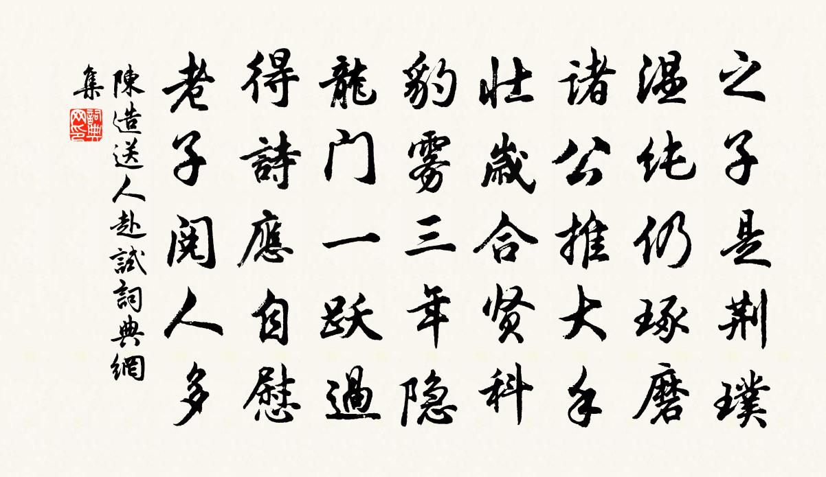 詩詞名句歷史字典書法欣賞書法字典國語詞典說文解字康熙字典古漢語字典標 題 作 者 詩 句 送人赴試作者:陳造 朝代:宋代送人赴試原文之子是荊璞,溫純仍琢磨。諸公推大手,壯歲合賢科。豹霧三年隱,龍門一躍過。得詩應自1~1慰,老子閱人多。詩詞問答問:送人赴試的作者是誰?答:陳造問:送人赴試寫於哪個朝代?答:宋代陳造送人赴試書法欣賞送人赴試書法作品詩詞推薦和李太白並敘蘇軾〔宋代〕李太白有《潯陽紫極宮感秋》詩,紫極宮,今天慶觀也。道士胡洞微以石本示余,蓋其師卓玘之所刻。玘有道術,訴衷情張元乾〔宋代〕兒時初未識方紅。學語問西東。對客呼為紅蕊,此興已偏濃。嗟白首,抗塵容。費牢籠。星球何在,鶴頂長丹,誰臘日宣詔幸上苑武則天〔唐代〕明朝游上苑,火急報春知。花須連夜發,莫待曉風吹。暇日弄筆戲書陸游〔宋代〕天地為我廬,江山為我客。北斗以酌酒,恨我飲量窄。人生但閉戶,烏用分菽麥。贈君玉四方,憒憒無皂白。送靈州李判官杜甫〔唐代〕犬戎腥四海,回首一茫茫。血戰乾坤赤,氛迷日月黃。將軍專策略,幕府盛材良。近賀中興主,神兵動朔方。送鄭邛叔珪之博羅尉四首王邁〔宋代〕是邑經兵火,今纏補少痕。要教民擊壞,毋遣吏椎門。文惠殘碑在,坡仙醉墨存。公餘勤物色,幽興入琴樽。縣齋秋懷程公許〔宋代〕學仙宗無為,學禪空萬緣。自昔抱奇志,師心為真傳。失腳墮世納,芘事幾充捐。惟有一念息,不受物慾牽。空花青溪橋王遂〔宋代〕倬彼清溪兮山高水長,上承黟歙兮下接錢唐。雨稍漸漬兮眾流湯湯,家具舟楫兮商旅伏藏。繄四海以為家兮何獨困挽呂東萊先生黃人傑〔宋代〕天意高難問,胡為奪巨賢。後生安取正,聖道不容傳。感意悲風木,傷心慘暮煙。翩翩丹旐去,徒有淚潸然。題真覺僧房蘆呂祖謙〔宋代〕何人夜折苕溪雪,吹落山堂寄清絕。夢回軒檻非人間,一岸扶疎碎殘月。秋風索索秋意晚,葉外參差明疊巘。頗似送束徽之入京王令〔宋代〕出處身之道,窮通命有時。九門無直謁,千里去何為。南畝春耕近,西風去馬羸。白雲況多很,歸計莫令遲。詩曹丕〔魏晉〕巾車出鄴宮。校獵東橋津。重罝施密網。{罒/乾}篳飄如雲。彎弓忽高馳。一發連雙麕。感花宋庠〔宋代〕前日來攀小園樹,枝頭蓓蕾無萬數。今朝置酒來賞花,已有殘英伴飛絮。春花如此將奈何,白日雖遲終不住。鶯歌同邱直長和歐公三游洞韻孫應時〔宋代〕維舟下牢關,散策上西嶺。天風吹我裳,恍惚非人境。丹崖翠壁明空山,呀然洞府蔥蘢間。珊瑚為門玉為里,石骨贈潯州朱祠部宋庠〔宋代〕粉署郎潛已十年,囊毫奏議委千篇。恥論頗牧雲中級,去詠齊夷海國泉。路控驛疆逢瑞翟,氣收炎浦見飛鳶。鈴齋奉和襲美酒中十詠酒篘陸龜蒙〔唐代〕山齋醞方熟,野童編近成。持來歡伯內,坐使賢人清。不待盎中滿,旋供花下傾。汪汪日可挹,未羨黃金籝。荔枝香近/荔枝香陳允平〔宋代〕臉霞香銷粉薄,淚偷泫。靉靉金獸,瀋水微薰,人簾綠樹春陰,糝徑紅英風卷。芳草怨碧,王孫漸遠。錦屏夢回,古香慢(自度腔·夷則商犯無射宮·賦滄淚看桂)吳文英〔宋代〕怨娥墜柳,離佩搖葓,霜訊南圃。漫憶橋扉,倚竹袖寒日暮。還問月中游,夢飛過、金風翠羽。把殘雲、勝水萬頃題雲梯石和王東卿壁間韻廖行之〔宋代〕客里春愁萬緒長,歸心宛轉九迴腸。鳥聲啼破刀頭夢,似是曉人猶異鄉。大自在庵郭印〔宋代〕茫茫三界中,何處不自在。情存想未除,轉側成拘礙。名句推薦幼敏悟過人,讀書輒成誦。歐陽修《畫地學書》 秦樓月,年年柳色,灞陵傷別。李白《憶秦娥·簫聲咽》 地中有山,謙;君子以裒多益寡,稱物平施。佚名《易傳·象傳上·謙》 淮水東邊舊時月,夜深還過女牆來。劉禹錫《金陵五題·石頭城》 回日樓台非甲帳,去時冠劍是丁年溫庭筠《蘇武廟》 春路雨添花,花動一山春色。秦觀《好事近·夢中作》 雪照山城玉指寒,一聲羌管怨樓間。劉著《鷓鴣天·雪照山城玉指寒》 何時倚虛幌,雙照淚痕乾。杜甫《月夜》 八月寒葦花,秋江浪頭白。李頎《送劉昱》 寒英坐銷落,何用慰遠客。柳宗元《早梅》