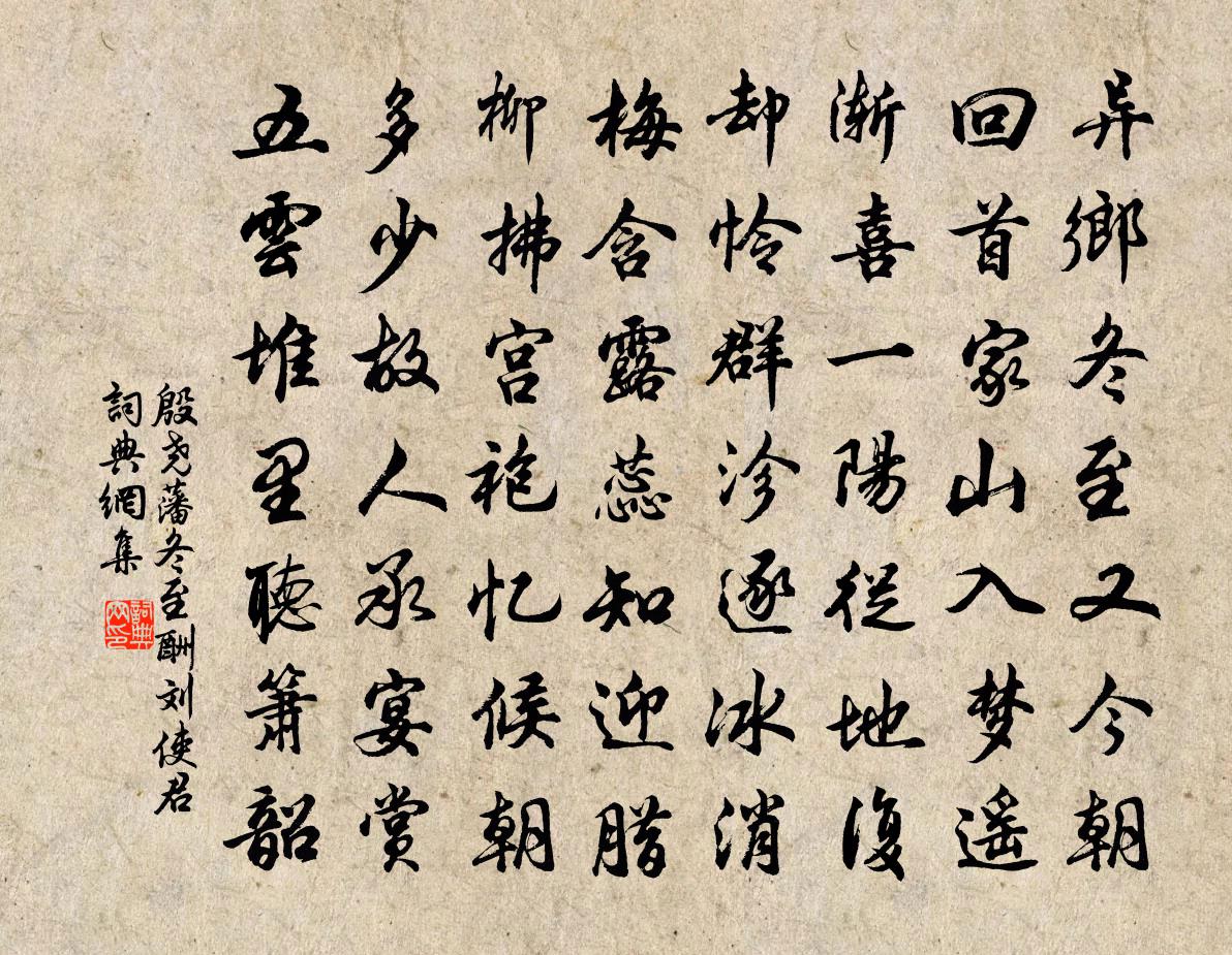 詩詞名句歷史字典書法欣賞書法字典國語詞典說文解字康熙字典古漢語字典標 題 作 者 詩 句 冬至酬劉使君作者:殷堯藩 朝代:唐代冬至酬劉使君原文異鄉冬至又今朝,回首家山入夢遙。漸喜一陽從地復,卻憐群沴逐冰消。梅含露蕊知迎臘,柳拂宮袍憶候朝。多少故人承宴賞,五雲堆里聽簫韶。詩詞問答問:冬至酬劉使君的作者是誰?答:殷堯藩問:冬至酬劉使君寫於哪個朝代?答:唐代問:冬至酬劉使君是什麼體裁?答:七律殷堯藩冬至酬劉使君書法欣賞冬至酬劉使君書法作品注釋全唐詩:卷492-41詩詞推薦感舊詩曹攄〔魏晉〕富貴他人合。貧賤親戚離。廉藺門易軌。田竇相奪移。晨風集茂林。棲鳥去枯枝。今我唯困蒙。羣士所背馳。鄉人萱徑攜筇陳杰〔宋代〕松下無喝道,言樹聊蠲憂。誰知赤籐杖,獨倚萬古愁。頌古釋如珏〔宋代〕諸佛出身處,千般謾度量。東山行水上,眨眼過扶桑。寄亳州何郎中二首陳師道〔宋代〕西原追送未成旬,赫赫傳聲已迫人。剩欲抄詩寄來使,尚能拂席致佳賓。孰知簡易歸劉向,誰使循良作寇恂。他日邇英閣早直鄭獬〔宋代〕綠樹蔭修廊,雲深別殿涼。星文開帝座,玉色泛天光。大典尊周孔,名家盛漢唐。自憐攜釣手,持筆翠旒旁。虔州景德寺榮師湛然堂蘇軾〔宋代〕卓然精明念不起,兀然灰槁照不滅。方定之時慧在定,定慧寂照非兩法。妙湛總持不動尊,默然真入不二門。語息題彭尉軒壁三首陳造〔宋代〕甓社家居水四環,房陵官舍只重山。客中一旦兼雙美,山影江光衽席間。夜行至平羌憩大悲院陸游〔宋代〕憶昨游天台,夜投石橋宿。水聲亂人語,炬火散山谷。穿林有驚鶻,截道多奔鹿。今夕復何夕,此境忽在目。蒼茫黃雀痴(雜言走筆)王維〔唐代〕黃雀痴,黃雀痴,謂言青鷇是我兒。一一口銜食,養得成毛衣。到大啁啾解游颺,各自東西南北飛。薄暮空巢上,緣識宋太宗〔宋代〕露含千滴瀝,幻化杳無跡。心重一時間,寸陰堪可惜。明根生惠性,德行多饒益。掌握驪龍珠,縱橫不改易。浮生陪諸先輩題名登春台臞軒即席次故相陳魏公韻劉克莊〔宋代〕台荒屋老閱人深,拂拭留題重整襟。科目一朝來券外,姓名三世在碑陰。公孫晚歲叨明詔,裘氏當年費苦吟。報與方岩尹主課漁溪劉克莊〔宋代〕君於場屋素稱雄,非止原夫一技工。貫虱心推白社族,執牛耳屬紫薇公。烏衣子弟如康樂,絳帳先生得馬融。看得馮永之號冰壺工水墨丹青吳龍翰〔宋代〕半生江海冰壺翁,擔風荷雨七尺筇。爛嚼扶桑紫金椹,玉樓光徹十二重。飽吃孤山白玉花,一鑿九竅開玲瓏。能鉟雜詩四首王之望〔宋代〕有憂烏啼門,有喜鵲噪廬。主人聞啼噪,喜鵲唾老烏。吉凶實由人,烏鵲何與乎。但知預相報,其智各有餘。人智東掖四絕句隔塵亭石象之〔宋代〕山椒亭榭適徘徊,病膜煩襟斗頓開。若有塵埃何處隔,此中自是少塵埃。二月二十一日東園桃李未開有感二首張耒〔宋代〕日慘東風正怒號,小園寂寂閉蓬蒿。可能春色如人事,獨發玄都觀里桃。悲秋陸游〔宋代〕病後支離不自持,湖邊蕭瑟早寒時。已驚白髮馮唐老,又起清秋宋玉悲。枕上數聲新到雁,燈前一局欲殘棋。丈夫寒食清明十首劉克莊〔宋代〕向來稱合老,歸去作園翁。鬚髮已華皓,紫薇藥應紅。夜宿荒村孔德紹〔唐代〕綿綿夕漏深,客恨轉傷心。撫弦無人聽,對酒時獨斟。故鄉萬里絕,窮愁百慮侵。秋草思邊馬,繞枝驚夜禽。風度和伯氏春雨中韻胡仲參〔宋代〕雨堤楊柳拂新亭,怪底遊人懶踏青。手撚梨花成小立,半窗湖水雨冥冥。名句推薦萬里浮雲卷碧山,青天中道流孤月。李白《答王十二寒夜獨酌有懷》 東飛烏鵲西飛燕。盈盈一水經年見。陳師道《菩薩蠻·七夕》 凡治天下,必因人情。韓非及後人《韓非子·八經》 小扇引微涼,悠悠夏日長。顧太清《菩薩蠻·端午日詠盆中菊》 侵陵雪色還萱草,漏泄春光有柳條。杜甫《臘日》 風吹古木晴天雨,月照平沙夏夜霜。白居易《江樓夕望招客》 君子崇人之德,揚人之美,非諂諛也;正義直指,舉人之過,非毀疵也。荀子《荀子·不苟》 天相漢,民懷國。史達祖《滿江紅·九月二十一日出京懷古》 池台竹樹三畝餘,至今人道江家宅。劉禹錫《金陵五題·並序》 挾飛仙以遨遊,抱明月而長終。蘇軾《前赤壁賦》