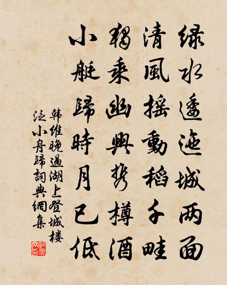 詩詞名句歷史字典書法欣賞書法字典國語詞典說文解字康熙字典古漢語字典標 題 作 者 詩 句 晚過湖上登城樓泛小舟歸作者:韓維 朝代:宋代晚過湖上登城樓泛小舟歸原文綠水逶迤城兩面,清風搖動稻千畦。獨乘幽興攜樽酒,小艇歸時月已低。詩詞問答問:晚過湖上登城樓泛小舟歸的作者是誰?答:韓維問:晚過湖上登城樓泛小舟歸寫於哪個朝代?答:宋代韓維晚過湖上登城樓泛小舟歸書法欣賞晚過湖上登城樓泛小舟歸書法作品詩詞推薦寄題郢州白雪樓梅堯臣〔宋代〕楚之襄王問於宋玉,玉時對以郢中歌。歌為白雪陽春曲,始唱千人和,再唱百人逐。至此和者才數人,乃知高調難金牛山方信孺〔宋代〕金牛去後久淒涼,好景乾坤亦祠藏。滄海無窮月無盡,從今收拾入詩囊。崇女擷菜煮羹程公許〔宋代〕穉女春間繞舍嬉,手挑野菜滿籃歸。細{奭斗}碧澗和極煮,旋掬香粳芼糝稀。久識道腴知雋永,更從禪悅悟精微戴時可家賞木芙蓉花醉賦陳著〔宋代〕西風不是芳菲節,木落山空景淒切。賴有桂菊聊記時,殿後拒霜花始發。我攜樽酒來問花,花於此時擅奇絕。先白悼亡姜特立〔宋代〕安仁愁思 * ,捫淚題詩睫未乾。雙燕歸來如訪舊,不知吾已是孤鸞。點絳唇朱淑真〔宋代〕黃鳥嚶嚶,曉來卻聽丁丁木。芳心已逐,淚眼傾珠斛。見自無心,更調離情曲。鴛帷獨。望休窮目,回首溪山綠。自西園登山宿方廣寺林用中〔宋代〕登山極目望,梵宇自鮮明。風度閒花落,雲低野樹清。夜長人不寐,地僻月初生。明發又歸去,何能已此情。鐵釘釋紹曇〔宋代〕惡鉗鎚下翻身去,個個當陽要出尖。釘得虛空無縫罅,有完全有不完全。清平樂晁補之〔宋代〕炎天畏景。午漏那堪永。何苦相仍愁簿領。短壑清溪牽興。瑤台月下曾逢。何由卻睹冰容。一笑為驅煩暑,故人元跋諫長畫軸後五王按樂圖許及之〔宋代〕玉笛床頭取次橫,自吹頭管按新聲。梨園舊譜今何在,一段風流畫得成。光祿庵二首蘇軾〔宋代〕文章恨不見文園,禮樂方將訪石泉。何事庵中著光祿,枉教閒處筆如椽。城中太守的何人,林下先生非我身。若向贈道士王玉壺潘璵〔宋代〕屨不染凡塵,雲深竹屋春。安心能學道,屋指別無人。丹熟玄機透,琴清古樂真。前緣君悟否,老子是龍身。滿庭芳佚名〔宋代〕稽首諸兄,*聽吾勸,化飯朝日隨緣。殘餘好惡,只要自心堅。飽後歸庵靜坐,無益語、閉口藏言。他人過,見如南歌子佚名〔宋代〕有同年傅景仁長短句,走筆次韻,既抵嶠南,回首野處,後會之期未卜也。因鍥石湘灕江上,以寓萬里之思雲。紹題陳生鯉魚圖趙必成〔宋代〕神龍原自異凡魚,瀦澤還知不久居。平地雷轟頭角露,滔天浪浴甲鱗舒。應夸鰲海都量遍,漫道龍門不可逾。試問頌古一○一首釋子淳〔宋代〕前後三三不失宗,迥迢午聖數難窮。金剛腦後全軒露,疊疊青山鎖翠空。張橫渠贊陳長方〔宋代〕祖龍吐毒,烈火四焚。先王載籍,畢罹其屯。劉漢崛興,訪索丘墳。群儒掇拾,百不一存。綿蕝之野,陋兮叔孫。雨夜思子虡陸游〔宋代〕兀兀過遙夜,悠悠擁破衾。峭寒侵病骨,殘雨滴愁心。人別易千里,書來真萬金。醉眠差似可,誰與伴孤斟?山陰縣西樓孫逖〔唐代〕都邑西樓芳樹間,逶迤霽色繞江山。山月夜從公署出,江雲晚對訟庭還。誰知春色朝朝好,二月飛花滿江草。一見蠟梅十五絕和陳天予韻唐仲友〔宋代〕積雪愁陰久不開,為憐花冷故徘徊。憑君琢句留金蕊,待取霜風送月來。名句推薦愛人者必見愛也,而惡人者必見惡也。墨子《墨子·16章 兼愛(下)》 重五山村好,榴花忽已繁。陸游《乙卯重五詩》 樓倚霜樹外,鏡天無一毫。杜牧《長安秋望》 為有書來與我期,便從蘭杜惹相思。莊棫《定風波·為有書來與我期》 寧可濕衣,不可亂步李汝珍《鏡花緣·第二十回》 泥融飛燕子,沙暖睡鴛鴦。杜甫《絕句二首》 寒燈思舊事,斷雁警愁眠。杜牧《旅宿》 夜發清溪向三峽,思君不見下渝州。李白《峨眉山月歌》 金風玉露一相逢,便勝卻人間無數。秦觀《鵲橋仙·纖雲弄巧》 人逢喜事精神爽,月到中秋分外明。馮夢龍《醒世恆言·卷十八》