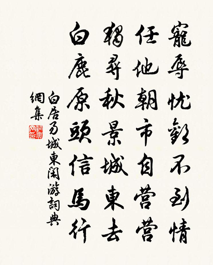 詩詞名句歷史字典書法欣賞書法字典國語詞典說文解字康熙字典古漢語字典標 題 作 者 詩 句 城東閒遊作者:白居易 朝代:唐代城東閒遊原文寵辱憂歡不到情,任他朝市自營營。獨尋秋景城東去,白鹿原頭信馬行。詩詞問答問:城東閒遊的作者是誰?答:白居易問:城東閒遊寫於哪個朝代?答:唐代問:城東閒遊是什麼體裁?答:七絕問:白居易的名句有哪些?答:白居易名句大全白居易城東閒遊書法欣賞城東閒遊書法作品注釋全唐詩詩詞推薦喜有秋宋祁〔宋代〕順氣綿區廣,嘉生告稔初。人驚萬箱入,天賜九年儲。絕塞元休馬,吾農先夢魚。牛應賣刀後,酒是乞漿餘。祀續驀山溪蔡伸〔宋代〕書雲今旦,雪霽嚴凝候。玉輦想迴鑾,正花覆、千官錦繡。周南留滯,清夢繞觚稜,心耿耿,路迢迢,此際空回首寄主管舅二首趙蕃〔宋代〕少公上黃扉,長公思玉局。恭惟我舅氏,出處似前躅。潯陽開三徑,鏡湖賜一曲。是為千載人,何有萬鍾祿。新詩通道呂岩〔唐代〕通道復通玄,名留四海傳。交親一拄杖,活計兩空拳。要果逡巡種,思茶逐旋煎。豈知來混世,不久卻回天。餞翁丹山發南浦張至龍〔宋代〕鳴鳩語燕近清明,柳絮風輕秧水平。一帶春流多斷岸,盡緣倒樹錄橋行。燈下讀山谷詩曹勛〔宋代〕天下無雙雙井黃,遺編猶作舊時香。百年人物今安在,千載功名紙半張。使我詩篇如許好,關人身事亦何嘗。地爐秋懷十首韓元吉〔宋代〕江南四百八十寺,未抵西湖勝處多。不用樓台帶煙雨,只看宮殿壓晴波。望月婆羅門引 為吹頭管張解愁賦王惲〔元代〕秋懷花索寞,悠花悠心事野花鷗邊。幾回崔九堂前。照眼故家風調,人物尚依然。按清商一曲,傾動華筵。新聲巧隱居趙良坡〔宋代〕習靜深山裡,幽棲趣逼真。青樓何足契,白雪故相親。守道無妨困,藏書不盡貧。昔人嘉遁漢,我亦愛逃秦。阮郎歸歐陽修〔宋代〕落花浮水樹臨池。年前心眼期。見來無事去還思。而今花又飛。淺螺黛,淡燕脂。閒妝取次宜。隔簾風雨閉門時。艇齋秦觀〔宋代〕平生樂漁釣,放浪江湖間。兀兀寄幽艇,不憂浪如山。聞君城郭居,左右群書環。有齋亦名艇,何時許追攀。釣古和人孤雁王令〔宋代〕朔磧雲深憶舊行,心驚漢月忽騫翔。江南水闊無天地,漠北沙寒有雪霜。遠目送飛沉暮靄,西風吹影過斜陽。衡南彰聖輝長老請贊釋師範〔宋代〕一之上,三之下。有來由,無縫罅。是甚牛溲馬浡,剛自遼天索價,累及兒孫成話欛。為合密府判題趙子昂大字蘭亭方回〔宋代〕神奇變化莫若龍,屈蟠可藏螺谷中。一聲霹靂起頭角,金鱗萬丈橫蒼空。右軍禊帖不盈咫,善臨摹者子趙子。一觴導引佚名〔宋代〕秋月冷、秋鶴無聲。清禁曉、動皇情。玉笙忽斷今何在,不知誰報玉樓成。七星授轡驂鸞種,人不見、恨難平。何平政橋華岳〔宋代〕建水合流三百里,直下富沙如捻指。溪東披拽纜過西,千丈春風怒濤起。香輪不解碾清江,造舟貫索成河梁。年年和子瞻記夢二首蘇轍〔宋代〕兄從南山來,夢我南山下。探懷出詩卷,卷卷盈君把。詩詞古人似,弟則吾弟也。相與千里隔,安得千里馬。攜手頌證道歌證道歌釋印肅〔宋代〕廓然瑩徹周沙界,方語難詮無可解。別傳一句了非言,妙契圓通觀自在。呂顏野飲醉中寄五絕句次其韻李廌〔宋代〕醉後詩成筆似椽,客來傾酒酒如泉。憐君常得酒中趣,愧我經春只慘然。答景毫宣徽吳尚書見寄短偈宋祁〔宋代〕玉帳論兵罷,東方靜守藩。有塵都是客,無法可容言。海鳥逢觴怯,醯雞戀甕喧。因公四句惠,彌覺對酬煩。名句推薦苦心豈免容螻蟻,香葉終經宿鸞鳳。杜甫《古柏行》 愁因薄暮起,興是清秋發。孟浩然《秋登蘭山寄張五》 齊唱憲王春樂府,金梁橋外月如霜。李夢陽《汴京元夕》 劍外忽傳收薊北,初聞涕淚滿衣裳。杜甫《聞官軍收河南河北》 神龜雖壽,猶有竟時。曹操《龜雖壽》 扁舟昨泊,危亭孤嘯,目斷閒雲千里。吳潛《鵲橋仙·扁舟昨泊》 那堪疏雨滴黃昏。更特地、憶王孫。歐陽修《少年游·欄乾十二獨憑春》 指點江山,激揚文字,糞土當年萬戶侯 * 《沁園春·長沙》 大凡朋友須箴規指摘處少,誘掖獎勸意多,方是。王陽明《傳習錄·卷下·門人陳九川錄》 日長唯鳥雀,春遠獨柴荊。杜甫《春遠 / 春運》