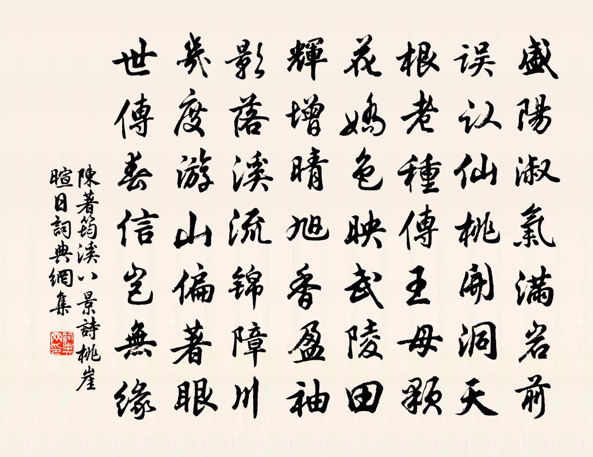 詩詞名句歷史字典書法欣賞書法字典國語詞典說文解字康熙字典古漢語字典標 題 作 者 詩 句 筠溪八景詩桃崖暄日作者:陳著 朝代:宋代筠溪八景詩桃崖暄日原文盛陽淑氣滿岩前,誤認仙桃開洞天。根老種傳王母顆,花嬌色映武陵田。輝增晴旭香盈袖,影落溪流錦障川。幾度游山偏著眼,世傳春信豈無緣。詩詞問答問:筠溪八景詩桃崖暄日的作者是誰?答:陳著問:筠溪八景詩桃崖暄日寫於哪個朝代?答:宋代陳著筠溪八景詩桃崖暄日書法欣賞筠溪八景詩桃崖暄日書法作品詩詞推薦秋月山中放歌釋文珦〔宋代〕秋氣清,秋葉鳴,四山風骨方崢嶸。有時支頤靜對,有時緩步遊行。朝昏之景無盡藏,一皆遺我無人爭。中林橡栗江上春事晁公溯〔宋代〕春來江上解霜嚴,群柏周廬筍出檐。突兀狸頭蒙紫籜,參差龍甲長蒼髯。閒思井臼高人宅,懶傍車輿刺史幨。留滯花月吟效連珠體十一首 7唐寅〔明代〕月臨花徑影交加, 花自芳菲月自華。 愛月遲眠花尚吐, 看花起早月方斜。 長空影動花迎月, 深院人歸月戊申年七夕五絕錢惟演〔宋代〕玉露金河顥氣涼,辛夷車轉桂旗香。嫦娥可是多猜忌,不駐瓊輪放夜長。陳侍御新居黃滔〔唐代〕幕客開新第,詞人遍有詩。山憐九仙近,石買太湖奇。樹勢想高日,地形誇得時。自然成避俗,休與白雲期。李漕和詩次韻李石〔宋代〕斯文百官富,未易眾目窺。共此一鳥過,誰其補三遺。粗能述前輩,抗說不敢卑。一朝得印可,寵若華袞辭。神仙晚春衛宗武〔宋代〕飛花迷柳岸,小葉貼荷塘。冉冉年增老,匆匆春去忙。候禽喧巧哢,進駐卉逗余香。盡日敲吟字,詩慳類括囊。題營山法幢院張嵲〔宋代〕天晴白雲高,喬木蔭初暑。久客倦紅塵,愛此崖寺古。時危僧飯少,日晏無鐘鼓。下馬憩幽軒,光風轉林莽。新竹新晴書事上知府宋諫議魏野〔宋代〕美化何因見,民歌處處同。雨申諸縣足,獄奏半年空。郡閣煙光里,人家霽色中。偶吟知淺拙,將獻愧明公。鄠杜馬上念漢書(一雲五陵懷古)李商隱〔唐代〕世上蒼龍種,人間武帝孫。小來惟射獵,興罷得乾坤。渭水天開苑,鹹陽地獻原。英靈殊未已,丁傅漸華軒。答洛陽主人陳子昂〔唐代〕平生白雲志,早愛赤松游。事親恨未立,從宦此中州。主人亦何問,旅客非悠悠。方謁明天子,清宴奉良籌。再取贈歌人(一作贈佳人)武元衡〔唐代〕林鶯一哢四時春,蟬翼羅衣白玉人。曾逐使君歌舞地,清聲長嘯翠眉顰。時余不得預會戲成二韻宋庠〔宋代〕筆陣談鋒醉幕天,遙知三俊共周旋。據鞍舊將曾銷髀,不得行間左執鞭。梁甫吟沈約〔南北朝〕龍駕有馳策。日御不停陰。星鑰亟回變。氣化坐盈侵。寒光稍眇眇。秋塞日沉沉。高窗仄余火。傾河駕騰參。飈風鵲橋仙(七夕之明日載酒李彭州炁家即席賦)魏了翁〔宋代〕銀潢濯月,金莖團露,一日清於一日。昨宵雲雨暗河橋,似劃地、不如今夕。乘查信斷,搘機人去,誤了橋邊訊息清平樂許有壬〔元代〕天寒日暮。百繞梅花樹。萬斛清香藏不住。都在一花開處。可憐月墮霜飛。不知疏影來時。誰報雲川老子,翠禽先暮春對柳二首司空圖〔唐代〕縈愁惹恨奈楊花,閉戶垂簾亦滿家。惱得閒人作酒病,剛須又撲越溪茶。洞中猶說看桃花,輕絮狂飛自俗家。正是泛湖至東涇陸游〔宋代〕湖光分別浦,嶺路過前村。泉石相縈帶,雲煙互吐吞。耕犁無易業,鄰曲有通婚。試覓誅茆地,吾將遺子孫。熙寧祀皇地祗十二首佚名〔宋代〕曳我黼黻,屐鳥接武。鏘我珩璜,降升圉圉。其將肆兮,既日不侮。其終徹兮,恭欽惟主。觀道君御書胡仲弓〔宋代〕帶草行書十數行,也隨匹馬到錢塘。傷心一幅槐黃紙,猶染宣和御墨香。名句推薦秋風別蘇武,寒水送荊軻。庾信《擬詠懷二十七首·其二十六》 來日綺窗前,寒梅著花未。王維《雜詩三首 / 雜詠三首》 橋成漢渚星波外,人在鸞歌鳳舞前。晏幾道《鷓鴣天·當日佳期鵲誤傳》 白水明田外,碧峰出山後。王維《新晴野望》 半死梧桐老病身,重泉一念一傷神。白居易《為薛台悼亡》 晨昏滾滾水東流,今古悠悠日西墜。錢福《明日歌》 勿貪意外之財,勿飲過量之酒。朱柏廬《朱子家訓·全文》 其交也以道,其接也以禮孟子《孟子·萬章章句下·第四節》 纖雲弄巧,飛星傳恨,銀漢迢迢暗度。秦觀《鵲橋仙·纖雲弄巧》 落花有淚因風雨,啼鳥無情自古今。屈大均《壬戌清明作》