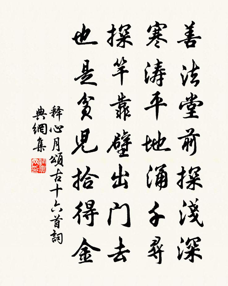 詩詞名句歷史字典書法欣賞書法字典國語詞典說文解字康熙字典古漢語字典標 題 作 者 詩 句 頌古十六首作者:釋心月 朝代:宋代頌古十六首原文善法堂前探淺深,寒濤平地涌千尋。探竿靠壁出門去,也是貧兒拾得金。詩詞問答問:頌古十六首的作者是誰?答:釋心月問:頌古十六首寫於哪個朝代?答:宋代釋心月頌古十六首書法欣賞頌古十六首書法作品詩詞推薦題登真洞張果〔唐代〕修成金骨煉歸真,洞鎖遺蹤不計春。野草謾隨青嶺秀,閒花長對白雲新。風搖翠筱敲寒玉,水激丹砂走素鱗。自是送峽州陳廉秘丞三首司馬光〔宋代〕地險三巴口,江流百折蟠。騶珂通峽響,門戟照秋寒。翠壁虎牙石,素花狼尾灘。孫劉置柵處,細為寫圖看。榴花宋庠〔宋代〕孤根西土幾時傳,絳蕊緗趺早夏天。艷發雖慚李桃後,子成猶占雪霜前。醖餘霞醑香應在,染殺綃裙色未鮮。一種少年行三首張耒〔宋代〕少年賣珠登主門,主家千金惜一身。綠鞴請罪見天子,尚得君王呼主人,◇雞走馬長安道,豪傑驅來奉談笑。漢庭句鄭域〔宋代〕旅程一見錯歡喜,仿佛吾鄉茉莉花。示霞上人釋如珙〔宋代〕一大藏教方外薦,十方剎土目前看。老僧住世無多日,只要闍梨心地安。贈珪上人仇遠〔宋代〕一塵不染俗難乾,百事無能心自閒。我道老僧痴未絕,有時採菊見南山。蒙才孺伯惠詩頗及參問葛立方〔宋代〕鶴氅 * 養粹和,冥心十地六波羅。宦情微似庵摩勒,佛行高於窣堵波。海裹泥牛端解笑,庵前石鏡不須磨。擬詢雜詩二十七首曹勛〔宋代〕一山孤秀隱溪雲,溪影涵光隔世紛。松竹徑深涼意透,衣巾不覺午風薰。野興王柏〔宋代〕文字飢難煮,為農策最良。興來鋤曉月,倦後臥斜陽。秋稼連千頃,春花醉幾場。任他名利客,車馬鬧康莊。次韻子儀初夏偶作黃庶〔宋代〕醉紅芳寂寞,吟綠又裝成。急雨荷宜聽,清風簟可迎。燕忙諳物態,花盡見時情。獨有無言意,不知枯與榮。癸酉冬雪孔武仲〔宋代〕平時看積雪,吟對佳山川。此地富華屋,聽觀亦浩然。愛景匿何處,凍雪迷遠天。離離黃庭沙,種作白玉田。飛舞生涯陸游〔宋代〕殘年端有幾,寂寞寄滄洲。鳥宿千林暮,蟲鳴四壁秋。風廊動碪杵,月壟把鉏耰。衣食隨宜具,何心復浪求。罪所送苗員外上都盧綸〔唐代〕謀身當議罪,寧遣友朋聞。禍近防難及,愁長事未分。寂寥驚遠語,幽閉望歸雲。親戚如相見,唯應泣向君。以詩句詠梅竹外一枝斜更好方蒙仲〔宋代〕梅豈必□竹,居何與梅事。政爾亦偶然,人自見之異。偈頌二首釋齊已〔宋代〕漸漸雞皮鶴髮,父少而子老。看看行步躘蹱,疑殺木上座。直饒金玉滿堂,照顧白拈賊。豈免衰殘老病,正好著精出郭晁公溯〔宋代〕出郭花相引,尋荒草欲迷。綠低憐獨臥,紅缺見鶯啼。溪石皆堪坐,山醪亦偶攜。淹留送落日,直過石城西。寄梁從善趙蕃〔宋代〕舊說舂陵郡,全如石作州。胸中飽丘壑,筆下剖琳球。遙想窗扉敞,多能磊落收。平生有餘嗜,安得致林幽。送趙宰之上虞二首於石〔宋代〕百里子男邦,職任非不厚。治民如牧羊,擾之則驚走。眷茲上虞邑,江海環左右。蕭蕭北風寒,怒濤聲撼吼。元亮和毛秀才江墅幽居好十首穆修〔宋代〕江墅幽居好,南塘枕野亭。菰蒲顫風綠,菱荇蓋波清。系葦一魚艇,翹煙雙雪翎。相攜二三叟,扶醉不曾醒。名句推薦解落三秋葉,能開二月花。李嶠《風》 得眾而不得其心,則與獨行者同實。管仲《管子·參患》 故人宿茅宇,夕鳥栖楊園。李白《之廣陵宿常二南郭幽居》 江海之所以能為百穀王者,以其善下之,故能為百穀王。老子《老子·德經·第六十六章》 桃根桃葉終相守,伴殷勤、雙宿鴛鴦。納蘭性德《一叢花·詠並蒂蓮》 東風靜、細柳垂金縷。万俟詠《三台·清明應制》 又是春將暮,無語對斜陽。葛長庚《水調歌頭·江上春山遠》 輕寒細雨情何限。不道春難管。秦觀《虞美人·碧桃天上栽和露》 恨蕭蕭、無情風雨,夜來揉損瓊肌。李清照《多麗·詠白菊》 寧不知傾城與傾國。佳人難再得。李延年《李延年歌》