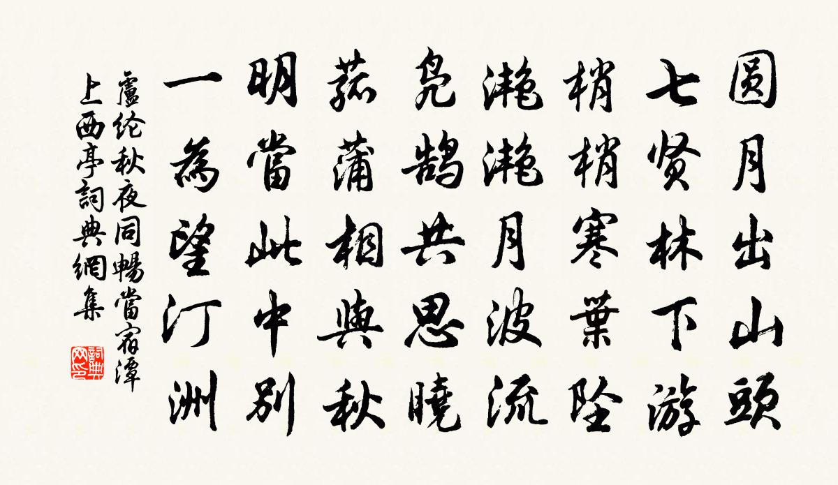 圓月出山頭,七賢林下游。梢梢寒葉墜,灩灩月波流。
