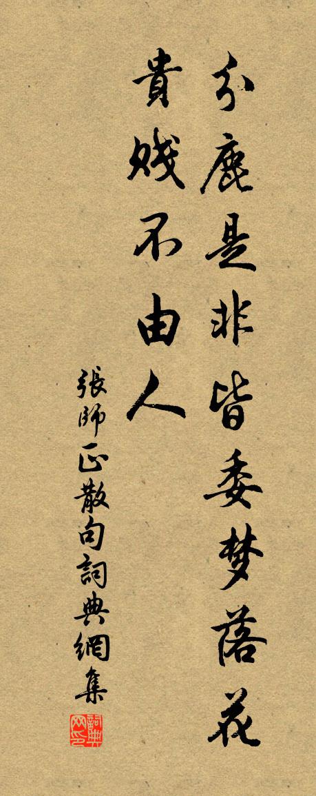 詩詞名句歷史字典書法欣賞書法字典國語詞典說文解字康熙字典古漢語字典標 題 作 者 詩 句 句作者:張師正 朝代:宋代句原文分鹿是非皆委夢,落花貴賤不由人。詩詞問答問:句的作者是誰?答:張師正問:句寫於哪個朝代?答:宋代張師正句書法欣賞句書法作品詩詞推薦句徐沖淵〔宋代〕破衲捲雲秋漠漠。九日思杭州舊遊寄周判官及諸客白居易〔唐代〕忽憶郡南山頂上,昔時同醉是今辰。笙歌委曲聲延耳,金翠動搖光照身。風景不隨宮相去,歡娛應逐使君新。江山約致明入開善不至二首劉子翬〔宋代〕偶臨沙岸立多時,淡淡煙村日向低。幽事挽人歸不得,一枝梅影浸澄溪。雨後十小絕以一雨洗殘暑萬家生早涼為韻章甫〔宋代〕閒居何所宜,把酒策第一。石田今有秋,痛飲事可必。綠陰陳著〔宋代〕風枝雨葉漸成陰,掃退浮紅浪紫塵。慚我老蒼留本色,安排晚景見新春。次韻寄謝楊制機項安世〔宋代〕把卷愴然不自勝,古來離合豈人能。未應鬻髢尤窮髮,暫喜餐蔬得枕肱。身逐南雲親色養,夢尋巴瘴隔心朋。囊中次韻子發勸酒鄭俠〔宋代〕子真依前家谷口,無地栽禾口栽柳。否亨千熊古難常,與物浮沉兒女詬。鵾鵬海伏而天飛,鷦鷯林棲惟一枝。迂談墊江縣范成大〔宋代〕青泥沒髁仆頻驚,黃海平橋馬不行。舊雨雲招新雨至,高田水入下田鳴。百年心事終懷土,一日身謀且望晴。休入役誠齋劉過〔宋代〕智愚上下爾自異,盡寸不差公短長。畢竟昌黎仍舊好,何曾人說段文昌。鷓鴣天朱熹〔宋代〕已分江湖寄此生。長蓑短笠任陰晴。鳴橈細雨滄洲遠,系舸斜陽畫閣明。奇絕處,未忘情。幾時還得去尋盟。江妃登扶風王宗元山亭黃庶〔宋代〕雲收南山頭,太白青崔嵬。我有泉石夢,坐對懷抱開。小池數斛水,涉鳥來氈毸。遺翎與行跡,縱橫在蒼苔。憶得太白東溪張老舍即事,寄舍弟侄等岑參〔唐代〕渭上秋雨過,北風何騷騷。天晴諸山出,太白峰最高。主人東溪老,兩耳生長毫。遠近知百歲,子孫皆二毛。中庭太孺人蔣氏輓詞樓鑰〔宋代〕之死靡他志,天乎不諒人。嫠孤蓬在首,艱苦棘成薪。晚福容千指,心空滅六塵。平生貞烈意,終作坐忘身。詠史詩昆陽胡曾〔唐代〕師克由來在協和,蕭王兵馬固無多。誰知大敵昆陽敗,卻笑前朝困楚歌。楚有{蕱肖換旱}菜色潔而味辛夜對吳監丞飲飲楊冠卿〔宋代〕山澤有臞儒,骨相無食肉。平生藜莧腸,愧負詩書腹。碧澗掇香芹,雕盤堆苜蓿。艱苦謀一飽,未免窮途哭。君今九月八日登高作重九奇父賦三十韻與義拾余意陳與義〔宋代〕九月風景好,節意滿天涯。書生尊所聞,登高亂城鴉。雖無後乘麗,前驅載黃花。兩樓壓波壯,眾澤分夭斜。居夷端午內中帖子詞皇后閣王珪〔唐代〕夕然辟惡仙香度,朝結延年帝縷成。願上玉宸千萬壽,薰風常泛舜弦聲。覽古四十二首 其二十楊維楨〔元代〕會稽嵇叔夜,才氣浩不群。平生癖於鍛,余好在琴尊。不如一長嘯,攜琴學蘇門。可憐廣陵散,奇弄今無聞。夜行船(和成都王漕巽澤)丘崈〔宋代〕飛舄朝天雲作路。長安近、更無程數。梧竹當年,絲綸奕世,咫尺鳳池平渡。青眼相逢何太暮。眉黃透、卻愁君去題四仙像陸游〔宋代〕反虜鯨鯢世共讎,漢公勳業過伊周。市門灑淚塵埃里,誰與朝廷植委裘?名句推薦寂寞風蟬至,連翩霜雁來。陰行先《和張燕公湘中九日登高》 一生大笑能幾回,斗酒相逢須醉倒。岑參《涼州館中與諸判官夜集》 興國在於務農。陳壽《三國志·魏書·辛毗楊阜高堂隆傳》 東山老,可堪歲晚,獨聽桓箏。葉夢得《八聲甘州·壽陽樓八公山作》 離恨做成春夜雨。添得春江,劃地東流去楊炎正《蝶戀花·別范南伯》 鷺窺蘆箔水,鳥啄紙錢風。范成大《寒食郊行書事》 相識滿天下,知心能幾人?佚名《增廣賢文·上集》 把酒送春春不語。黃昏卻下瀟瀟雨。朱淑真《蝶戀花·送春》 時人不識凌雲木,直待凌雲始道高。杜荀鶴《小松》 眺聽良多感,徙倚獨沾襟。李密《淮陽感秋》