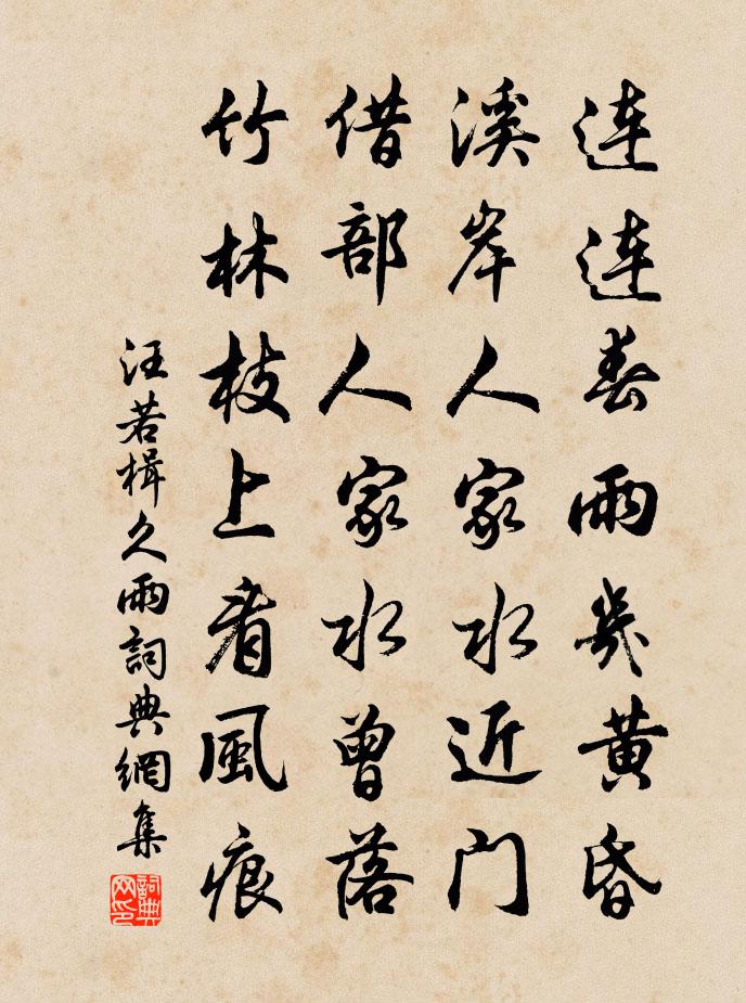詩詞名句歷史字典書法欣賞書法字典國語詞典說文解字康熙字典古漢語字典標 題 作 者 詩 句 久雨作者:汪若楫 朝代:宋代久雨原文連連春雨幾黃昏,溪岸人家水近門。借部人家水曾落,竹林枝上看風痕。詩詞問答問:久雨的作者是誰?答:汪若楫問:久雨寫於哪個朝代?答:宋代汪若楫久雨書法欣賞久雨書法作品詩詞推薦池水久涸雨後生蓮偶作李洪〔宋代〕繞郭荷花泛畫船,枯池忽見葉田田。艱生頗似石間柏,罕喻真成陸地蓮。要看露香明菡萏,不辭汲水弄漪漣。況逢感時二首陳著〔宋代〕一點忠忱無處輸,與滔滔者走危途。新聲感泣尚書客,破鏡傳盟公主奴。流散莫非中澤雁,死亡誰是首邱狐。平生赴亳州教官次韻和中書錢舍人及亳州守晁美叔張耒〔宋代〕久知疏慵難應接,勉強一官親訟牒。羈窮正似鳩無巢,擺去不如魚有鬣。從來書史鈍蹊徑,更嘆詩騷窮事業。幾思送以道赴漢東兵官因呈繡使吳勝這同年兼簡李曹彥約〔宋代〕李許相從久,時方混武文。議刑新幕府,保塞舊將軍。二士俱人物,三賢更主君。春蘭秋菊意,他日共風雲。新雨感應琴齋檐溜忽得雙魚趙時韶〔宋代〕詹流非沼非池躺,躍出雙魚亦自奇。不是縣於庭上落,便因生出斧來去。聽琴莫笑音非古,葉夢須知稔可期。謾說次韻西塢道庵洪咨夔〔宋代〕芳蹊幾曲重行行,塢裹曾陰塢外晴。秧馬鬅鬙和雨種,籜龍菌蠢帶煙烹。黑風動地前程暗,白日行天內景明。卻愛和襲美重題後池陸龜蒙〔唐代〕曉煙清露暗相和,浴雁浮鷗意緒多。卻是陳王詞賦錯,枉將心事托微波。女幾山女仙廟李復〔宋代〕絳節高翔不可攀,尚留遺幾在空山。月明曾有芳簫過,松老時看舊鶴不。岩下春歸花寂寂,壁間雲暗蘚斑斑。開元陪諸貴公子丈八溝攜妓納涼,晚際遇雨二首杜甫〔唐代〕落日放船好,輕風生浪遲。竹深留客處,荷淨納涼時。公子調冰水,佳人雪藕絲。片雲頭上黑,應是雨催詩。雨來枕上崔敦禮〔宋代〕輾轉孤燈夢不成,念家憂國總關情。月明定到棠梨上,時有啁嘈格磔聲。宿城頭舖小飲而睡陸游〔宋代〕亭傳臨江滸,床敷息我勞。屋茅殘月冷,庭樹北風鏖。虛市饒新兔,村場有濁醪。氣衰仍病著,小飲不能豪。辛酉冬罷歸至家自省曾豐〔宋代〕彼哉言者固云云,老矣歸歟敢自文。不可以風霜後葉,何傷於月雨余雲。性情與物常為一,鷗鷺容吾便入群。古道追換劉平父二首李呂〔宋代〕高才入用合求聞,卻向丘園號隱君。馳騁古人真我事,泥塗軒冕付時人。黃粱未熟驚塵世,白璧空埋慘暮雲。賴得偈七首釋允韶〔宋代〕秋光清淺時,白鷺和煙島。良哉觀世音,全身入荒草。送知久禪者釋重顯〔宋代〕霜竹凝寒攜九節,銅瓶浪鎖千溪月。天上人間不自知,行行誰共分清絕。謝人自鍾陵寄紙筆齊己〔唐代〕故人猶憶苦吟勞,所惠何殊金錯刀。霜雪剪栽新剡硾,鋒鋩管束本宣毫。知君倒篋情何厚,借我臨池價斗高。詞客早春雪中戎昱〔唐代〕陰雲萬里晝漫漫,愁坐關心事幾般。為報春風休下雪,柳條初放不禁寒。江如練(蝶戀花)賀鑄〔宋代〕睡鴨爐寒熏麝煎。寂寂歌梁,無計留歸燕。十二曲闌閒倚遍。一杯長待何人勸。不識當年桃葉面。吟詠佳詞,想像姜肱徐鈞〔宋代〕畫手尚難圖我貌,安車何可屈吾身。惟餘爭死同衾事,千載稱為孝友人。絳都春·余往來清華池館六年賦詠屢矣感昔傷今益不堪懷吳文英〔宋代〕春來雁渚。弄艷冶、又入垂楊如許。困舞瘦腰,啼濕宮黃池塘雨。碧沿蒼蘚雲根路。尚追想、凌波微步。小樓重上名句推薦城中桃李愁風雨,春在溪頭薺菜花。辛棄疾《鷓鴣天·陌上柔桑破嫩芽》 酹酒蒼茫,倚歌平遠,亭上玉虹腰冷。吳文英《十二郎·垂虹橋》 知否,知否?應是綠肥紅瘦。李清照《如夢令·昨夜雨疏風驟》 黃鶯不語東風起,深閉朱門伴舞腰。溫庭筠《楊柳八首·其三》 芳菲歇。故園目斷傷心切。向子諲《秦樓月·芳菲歇》 春風爾來為阿誰,蝴蝶忽然滿芳草。李白《山人勸酒》 名豈文章著,官應老病休。杜甫《旅夜書懷》 應酬都不暇,一嶺是梅花。張道洽《嶺梅》 春風知別苦,不遣柳條青。李白《勞勞亭》 今夫地一撮土之多,及其廣厚載華岳而不重,振河海而不洩,萬物載焉。子思《中庸·第二十六章》