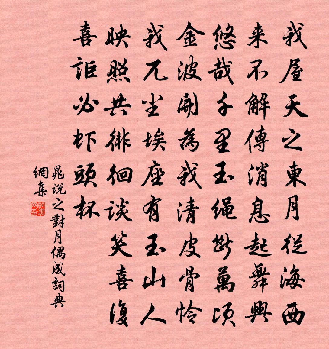 詩詞名句歷史字典書法欣賞書法字典國語詞典說文解字康熙字典古漢語字典標 題 作 者 詩 句 對月偶成作者:晁說之 朝代:宋代對月偶成原文我屋天之東,月從海西來。不解傳訊息,起舞興悠哉。千里玉繩斷,萬頃金波開。為我清皮骨,憐我兀塵埃。座有玉山人,映照共徘徊。談笑喜復喜,詎必蝦頭杯。詩詞問答問:對月偶成的作者是誰?答:晁說之問:對月偶成寫於哪個朝代?答:宋代晁說之對月偶成書法欣賞對月偶成書法作品詩詞推薦次韻謝借觀五老圖黃庭堅〔宋代〕五老天然一會閒,太平時節振儒冠。相君於理回天詔,輔國驅夷立寒桓。妖術圖奸梁木壞,黨碑雷震雹冰寒。丹心為客戴復古〔宋代〕琴劍長為客,詩書欠策勛。老來臨鏡懶,愁里把杯勤。北雁寒離塞,秋鷹健拂雲。物情能奮發,人不解超群。一壺歌陸游〔宋代〕長安市上 * ,亂插繁花滿帽紅。看盡人間興廢事,不曾富貴不曾窮。初冬陸游〔宋代〕已罷彈冠欲掛冠,一庵天遣養衰殘。雨荒園菊枝枝瘦,霜染江楓葉葉丹。羹釜帶鱗烹白小,蓬門和蔓系黃團。夕陽南浦歲暮對酒送王十五歸京白居易〔唐代〕臘後冰生覆湓水,夜來雲暗失廬山。風飄細雪落如米,索索蕭蕭蘆葦間。此地二年留我住,今朝一酌送君還。相看山居雜詩九十首曹勛〔宋代〕駸駸隨日老,寧能問分陰。波流固自遠,雲在初無心。鳥聲驚幽思,風徐快衝襟。馬卿苦病多,中懷天莫忱。淳熙八年端午帖子詞太上皇后合六首崔敦詩〔宋代〕寶月驂鸞采結垂,朝來新寫上皇詩。金盤有露涼生是,玉宇無塵凍解遲。別離情所鍾十二章章四句送定叟弟之官嚴陵張栻〔宋代〕自昔謹交際,人情易因循。敬始以念終,君子貴守身。江梅引/江城梅花引洪皓〔宋代〕去年湖上雪欺梅。片雲開。月飛來。雪月光中、無處認樓台。今歲梅開依舊雪,人如月,對花笑,還有誰。一枝兩九日張嵲〔宋代〕九日空山里,乘高感歲華。霜風翻絳葉,晴日亂黃花。積雨饒新徑,荒林足亂雅。連年頻避地,憔悴客田家。石橋歌張伯端〔宋代〕吾家本住石橋北,山鎮水關森古木。橋下澗水徹崑崙,山下有泉香馥郁。吾居山內實堪夸,遍地均栽不謝花。山北書志示子聿陸游〔宋代〕誤上蓬山亦已叨,所悲故里隔胥濤。還家未失屠羊業,報國元無汗馬勞。載筆敢言宗史漢,閉門猶得讀莊騷。小兒和元遺山太山古句王奕〔宋代〕我來拜爭魯,舟過歌鳳台。登嶧仰東蒙,自謂高矣哉。及登東山頂,天級真難階。河瀆走罅漏,嵪陵塌埏垓。己大有感蘇麟〔宋代〕近水樓台先得月,向陽花木易為春。小雪陸游〔宋代〕夜臥風號野,晨興雪擁籬。未言能壓瘴,要是欲催詩。跨蹇雖堪喜,呼舟似更奇。元知剡溪路,不減灞橋時。送康判官往新安(一作皇甫冉詩)劉長卿〔唐代〕不向新安去,那知江路長。猿聲近廬霍,水色勝瀟湘。驛路收殘雨,漁家帶夕陽。何須愁旅泊,使者有輝光。和酬趙宮保致政言懷二首曾鞏〔宋代〕愛國憂民有古風,米鹽親省尚嫌慵。袞袞天上歸何晚,霖雨人間望正濃。三少官儀雖赫赫,五湖心事背容容。角巾醉落魄(次韻斯遠)韓淲〔宋代〕風高木落。壯心萬里空回薄。振衣待把塵埃濯。聲里斜陽,孤起戍樓角。人生誰會誰為錯。年來但覺多離索。黃花詩劉楨〔魏晉〕昔君錯畦畤。東土有素木。條柯不盈尋。一尺再三曲。隱生置翳林。控倊自迫速。得托芳蘭苑。列植高山足。 十月菊潘牥〔宋代〕一段風流玉琢成,開從霜後越精神。休嫌茉莉非吾配,曾見張良似婦人。名句推薦江水浸雲影,鴻雁欲南飛。朱熹《水調歌頭·隱括杜牧之齊山詩》 前度綠陰載酒,枝頭色比舞裙同。王沂孫《慶清朝·榴花》 誰念文園病客?夜色沉沉,獨抱一天岑寂。張埜《奪錦標·七夕》 善有善報,惡有惡報。佚名《增廣賢文·上集》 楓林凋翠,寒雁聲悲。趙長卿《柳梢青·過何郎石見早梅》 天地相合,以降甘露,民莫之令而自均。老子《老子·道經·第三十二章》 玉碗冰寒滴露華,粉融香雪透輕紗。晏殊《浣溪沙·玉碗冰寒滴露華》 雖然不如延年妹,亦是當時絕世人。李白《中山孺子妾歌》 飛雪帶春風,裴回亂繞空。劉方平《春雪》 夫尚儉者開福之源,好奢者起貧之兆。魏收《魏書·列傳·卷五十》