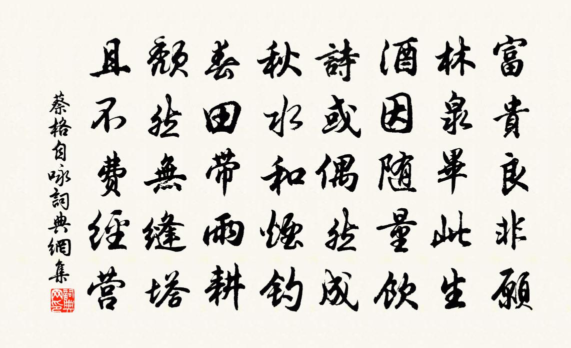 詩詞名句歷史字典書法欣賞書法字典國語詞典說文解字康熙字典古漢語字典標 題 作 者 詩 句 自詠作者:蔡格 朝代:宋代自詠原文富貴良非願,林泉畢此生。酒因隨量飲,詩或偶然成。秋水和煙釣,春田帶雨耕。頹然無縫塔,且不費經營。詩詞問答問:自詠的作者是誰?答:蔡格問:自詠寫於哪個朝代?答:宋代問:自詠是什麼體裁?答:五律蔡格自詠書法欣賞自詠書法作品詩詞推薦偶得北虜金泉酒小酌陸游〔宋代〕逆胡萬里跨燕秦,志士悲歌淚滿巾。未履胡腸涉胡血,一樽先醉范陽春。和當塗道中趙希逢〔宋代〕至今修竹下,陳跡憶山陰。去去人如水,行行杖掛金。柳絲偏惹恨,禽語更關心。對景愁千斛,無言酒懶斟。作家書竟題范龍仙書齋壁上蘆雁圖陳維崧〔清代〕漏悄裁書罷。繞廊行,偶然瞥見,壁間古畫。一派蘆花江岸上,白雁濛濛欲下。有立且、飛而鳴者。萬里重關歸夢揚州慢·瓊花鄭覺齊〔宋代〕弄玉輕盈,飛瓊淡濘,襪塵步下迷樓。試新妝才了,炷瀋水香球。記曉剪、春冰馳送,金瓶露濕,緹騎新流。甚天寄題傅欽之草堂秦觀〔宋代〕河陽有洑流,經營太行根。盛德不終晦,發為清濟源。斯堂濟源上,太行正當門。仰視浮雲作,俯窺流水奔。修竹休假日訪王侍御不遇韋應物〔唐代〕九日馳驅一日閒,尋君不遇又空還。怪來詩思清人骨,門對寒流雪滿山。陳君式恭軒曾鞏〔宋代〕不要牆頭俗眼看,故開蒼蘚種檀欒。虛心得處從天性,勁節知來在歲寒。葉養風煙夸酒美,枝留冰雪送歌殘。名郎西江月佚名〔宋代〕花下春光正好,柳邊春色才多。雨聲日夜長滄波。暗地芳心滴破。拍拍浪飛白雪,冥冥山點青螺。汀蘭岸芷有情麽丘文定公輓詞樓鑰〔宋代〕同與隆興第,嘉禾見兩轓。瀛壖迂使節,蜀道送行軒。預草前須詔,驚傳易簀言。不堪鸞鏡舞,雙旐愴丘原。山居詩釋延壽〔宋代〕幽齋獨坐絕參詳,兀爾何如驟世忙。拯濟終憑宏願力,安閒須得守愚方。柴門半掩花空落,苔徑虛蹤草自荒。最好同李二過亡友鄭子故第(李與之故,非予所識)韋應物〔唐代〕客車名未滅,沒世恨應長。斜月知何照,幽林判自芳。故人驚逝水,寒雀噪空牆。不是平生舊,遺蹤要可傷。又寄徐徑畈吏部劉黻〔宋代〕元陽詔墨動天霞,喜到東都處士家。世路幾年滋艾草,道山今日聚梅花。作舟濟國看商傅,鍊石補天過女媧。珍重東村陸游〔宋代〕野人知我出門稀,男輟鉏耰女下機。掘得茈菇炊正熟,一杯苦勸護寒歸。郡齋平望江山岑參〔唐代〕水路東連楚,人煙北接巴。山光圍一郡,江月照千家。庭樹純栽橘,園畦半種茶。夢魂知憶處,無夜不京華。郊行潘牥〔宋代〕擬欲尋詩取次行,東風放出十分晴。花時酒旆家家有,蠶月繅車處處鳴。乍可腰鐮從父老,何能手板事公卿。他年詠打扇虞儔〔宋代〕腕脫何須問小童,汗流聊復慰衰農。聯翩天下一輪月,簸蕩人間萬竅風。螢火招來還自照,蚊雷揮去覺群空。散仙活計何應龍〔宋代〕三間茅屋蓋頭顱,除卻吟篇事事無。擬把十年窮活計,一時傾倒向江湖。鷓鴣天(離豫章別司馬漢章大監)辛棄疾〔宋代〕聚散匆匆不偶然。二年遍歷楚山川。但將痛飲酬風月,莫放離歌入管弦。縈綠帶,點青錢。東湖春水碧連天。明朝步月吟邵雍〔宋代〕林罅天尤碧,風餘月更明。人間無事日,得向此中行。送人南遊鄭巢〔唐代〕南京路悄然,欹石漱流泉。遠寺寒雲外,揚帆暑雨前。雁行回曉岫,蜃色上湖田。更想清吟處,多同隱者眠。名句推薦想文君望久,倚竹愁生步羅襪。姜夔《八歸·湘中送胡德華》 夕陽倒影射疏林,江邊一帶芙蓉老。陳霆《踏莎行·晚景》 酒後競風采,三杯弄寶刀。李白《白馬篇》 雨色秋來寒,風嚴清江爽。李白《酬裴侍御對雨感時見贈》 貨無大小,缺者便貴。馮夢龍《醒世恆言·卷三十五》 春風一夜吹鄉夢,又逐春風到洛城。武元衡《春興》 燕子歸來,雕梁何處,底事呢喃語。王瀾《念奴嬌·避地溢江書於新亭》 淒涼別後兩應同,最是不勝清怨月明中。納蘭性德《虞美人·曲闌深處重相見》 交淺而言深者,愚也;在賤而望貴者,惑也;未信而納忠者,謗也。范曄《後漢書·列傳·崔駰列傳》 一身虜雲外,萬里胡天西。岑參《早發焉耆懷終南別業》