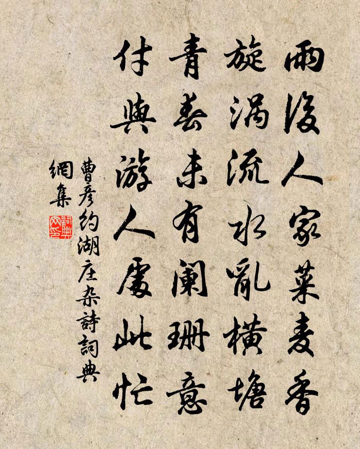 詩詞名句歷史字典書法欣賞書法字典國語詞典說文解字康熙字典古漢語字典標 題 作 者 詩 句 湖莊雜詩作者:曹彥約 朝代:宋代湖莊雜詩原文雨後人家菜麥香,旋渦流水亂橫塘。青春未有闌珊意,付與遊人處此忙。詩詞問答問:湖莊雜詩的作者是誰?答:曹彥約問:湖莊雜詩寫於哪個朝代?答:宋代曹彥約湖莊雜詩書法欣賞湖莊雜詩書法作品詩詞推薦秋興二首文同〔宋代〕百蟲感秋陰,入夜聲更切。問爾苦何事,到曉啼不曷。盈庭不可止,蓊{上艹下歲}藏萬穴。會是天使然,相將送謁郭道沖唐師德登台偶作朱長文〔唐代〕沖寒步郊原,煙水照林薄。雪余山色佳,浦浚湖波落。靜可釣綸垂,清欲塵纓濯。相逢兩俊友,辭義富金臒。攜手偈頌一百一十七首釋紹曇〔宋代〕廣漢馬駒子,十方羅漢僧。不吃金雞粟,專銜血戰冤。古龍淵吸乾到底,清涼權靠倒無根。五處移場弄巘險,化機安樂窩中吟邵雍〔宋代〕安樂窩中設不安,略行湯劑自能痊。居常無病不服藥,就使有災宜俟天。理到昧時須索講,情於盡處更何言。自餘吳少由惠詩百篇久未及謝又以委貺勉次來韻樓鑰〔宋代〕江左一世稱名公,首出劉惔與王-濛。自高直以天自況,何止數仞言高墉。虛聲一傳實何在,但知景附而風從。我赴端禮之招道中偶成李處權〔宋代〕月離於畢俾滂沱,兆及豐年喜欲歌。任有泥塗甘曳尾,更無波浪敢憑河。老來酒量難酬酢,閒里詩情好琢磨。晏子鷓鴣天(為妻壽)管鑒〔宋代〕前日新冬舉壽觴。今朝喜色又非常。一陽生後逢生日,日漸舒長壽更長。移晚宴,慶新堂。堂前高竹早梅芳。年年聯句越溪楊女〔唐代〕珠簾半床月,青竹滿林風。 ——楊女何事今宵景,無人解語同。 ——謝生宜興山房十首李曾伯〔宋代〕曉起爐煙一縷清,梵音繚繞檻軒行。須臾日上松梢了,又聽齋鐘相齋鳴。病起楊時〔宋代〕竹風帶雨作秋聲,半睡惟聞鳥雀爭。老病衰殘惟骨立,白頭看鏡不須驚。寒夜袁枚〔清代〕寒夜讀書忘卻眠,錦衾香盡爐無煙。美人含怒奪燈去,問郎知是幾更天!中界山張又新〔唐代〕瑟瑟峰頭玉水流,晉時遺蹟更堪愁。愁人到此勞長望,何處煙波是祖州。浪淘沙皇甫松〔唐代〕蠻歌豆蔻北人愁,浦雨杉風野艇秋。浪起□□眠不得,寒沙細細入江流。旅懷張詠〔宋代〕儒術精窮久,風塵鬢欲衰。知音豈易得,搔首獨何為。寓舍思親處,秋原墜葉時。樂天吟更苦,笑殺五陵兒。湖州歌九十八首 其七十七汪元量〔宋代〕第八筵開在北亭,三宮豐燕已恩榮。諸行百戲都呈藝,樂局伶官叫點名。觀刈方岳〔宋代〕石田犖确底須嫌,苦說頻年不下鎌。煙雨一犁經老手,翻匙香雪十分甜。早夏郡樓宴集姚合〔唐代〕官散有閒情,登樓步稍輕。窗雲帶雨氣,林鳥雜人聲。曉日襟前度,微風酒上生。城中會難得,掃壁各書名。頌古一百二十一首釋宗杲〔宋代〕禾黍不陽艷,競栽桃李春。翻令力耕者,半作賣花人。岳館沈佺期〔唐代〕洞壑仙人館,孤峰玉女台。空濛朝氣合,窈窕夕陽開。流澗含輕雨,虛岩應薄雷。正逢鸞與鶴,歌舞出天來。新堂夜坐月色皎然由連理亭信步庭中徘徊久之鮮于侁〔宋代〕秋風動微涼,天雨新霽後。閒齋獨隱几,明日在高柳。振衣步庭下,顥氣入襟袖。天空雲漢明,隱約辨列宿。蒼蒼名句推薦對菊難逢元亮酒,登樓愧乏仲宣才。秋瑾《九日感賦》 渡頭楊柳青青。枝枝葉葉離情。晏幾道《清平樂·留人不住》 好言難得,惡語易施。佚名《增廣賢文·上集》 竹外一枝斜,想佳人,天寒日暮。曹組《驀山溪·梅》 欲往從之雪雰雰,側身北望涕沾巾。張衡《四愁詩》 鳥之將死,其鳴也哀;人之將死,其言也善。孔子弟子《論語·泰伯篇》 亦余心之所善兮,雖九死其猶未悔。屈原《離騷》 靡靡秋已夕,淒淒風露交。陶淵明《己酉歲九月九日》 清淚浥羅巾,各自消魂,一江離恨恰平分。陸游《浪淘沙·丹陽浮玉亭席上作》 寒山轉蒼翠,秋水日潺湲。王維《輞川閒居贈裴秀才迪》