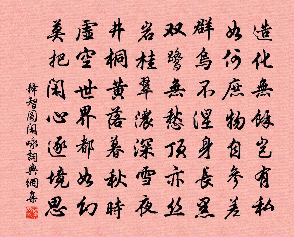 詩詞名句歷史字典書法欣賞書法字典國語詞典說文解字康熙字典古漢語字典標 題 作 者 詩 句 閒詠作者:釋智圓 朝代:宋代閒詠原文造化無餘豈有私,如何庶物自參差。群烏不涅身長黑,雙鷺無愁頂亦絲。岩桂翠濃深雪夜,井桐黃落暮秋時。虛空世界都如幻,莫把閒心逐境思。詩詞問答問:閒詠的作者是誰?答:釋智圓問:閒詠寫於哪個朝代?答:宋代釋智圓閒詠書法欣賞閒詠書法作品詩詞推薦利州路提刑秘書張季長送洮研,發視乃一假柏楊萬里〔宋代〕繡衣使者稟霜威,方丈仙人舊羽儀。別去十年真一夢,書來萬里寄相思。如何綠石涵風面,化作青銅溜雨枝。卻送望梅花佚名〔宋代〕密密彤雲覆地。蓬蓬然、朔風又起。大塊呼吸,陽凝陰結,遍四野、玉花呈端。這些意。聖感豐年,顯唐虞、再來挽傅安道郎中詞二首韓元吉〔宋代〕蚤負凌雲氣,長懷流水音。詞場俱白首,世路只丹心。妙語空成誦,歡盟詎可尋。泉山幾千里,涕淚俱沾襟。示五峰僧趙師秀〔宋代〕峰形如掌翠相環,頭白山僧引客看。積葉壞來泥徑滑,斜陽移去石橋寒。近聞瀑布尋還遠,易得菖蒲采極難。分我蘇文忠蕭丞相樓二詩帖贊岳珂〔宋代〕登高而賦,維以思古。二難之風,意健句嫵。黯然塵楮,筆勢軒翥。真兮不諼,我懷陟岵。贈李秀才肖舒葉適〔宋代〕帆來帆去海中山,自笑臞仙歲月閒。忽值巡遊防豕突,也叨扈從識龍顏。寺傳弓劍煙嵐外,門掩詩書浪泊間。待得郊廟歌辭。五郊樂章。白郊迎神佚名〔唐代〕序移玉律,節應金商。天嚴殺氣,吹警秋方。槱燎既積,稷奠並芳。樂以迎奏,庶降神光。式微佚名〔先秦〕式微,式微,胡不歸?微君之故,胡為乎中露!式微,式微,胡不歸?微君之躬,胡為乎泥中!泰靈園書事蔡襄〔宋代〕上元天仗款琳房,靈圃遙傳玉殿香。要識年年桃李色,不關春力是恩光。題墨梅蔡戡〔宋代〕誰作橫枝太逼真,枝頭的皪眼俱明。也知筆力窺天巧,無奈清香畫不成。望遠行孫惟信〔宋代〕又還到元宵台榭。記輕衫短帽,酒朋詩社。爛漫向、羅綺叢中,馳騁風流俊雅。轉頭是、三十年話。量減才慳,自同吳居安入開善四首游松庵劉子翬〔宋代〕虛廓附山翔,泉聲小庵閉。齋余恣行遨,剝啄忻屢至。午陰遇蘭芳,夕照坐松吹。徜徉無所為,聊盡今日意。秋江寫望林逋〔宋代〕蒼茫沙嘴鷺鷥眠,片水無痕浸碧天。最愛蘆花經雨後,一蓬煙火飯魚船。天竺寺蘇軾〔宋代〕香山居士留遺蹟,天竺禪師有故家。空詠連珠吟疊璧,已亡飛鳥失驚蛇。林深野桂寒無子,雨浥山姜病有花。四十寄成父並帖彥博審知趙蕃〔宋代〕霜落湖邊路,林疏溪上居。向來行載酒,今日問憑書。一飽異初計,五言真累渠。故人誰我念,煩為語王徐。答弟婦歇後語李濤〔唐代〕慚無竇建,愧作梁山。宿西谷院六首李新〔宋代〕線繞參差路,雲封咫尺山。寺僧初怪客,三日竊優閒。忽夢遊仙王勃〔唐代〕仆本江上客,牽跡在方內。寤寐霄漢間,居然有靈對。翕爾登霞首,依然躡雲背。電策驅龍光,煙途儼鸞態。乘月三代門成王周曇〔唐代〕成王有過伯禽笞,聖惠能新日自奇。王道既成何所感,越裳呈瑞鳳來儀。述懷二首郭昭乾〔宋代〕皇皇長安都,赫赫金張第。車馬競奔趨,窮達在片議。綺麗世所欣,崇高物恆忌。何如古逸民,蓬門臥幽閟。名句推薦瘦葉幾經雪,淡花應少春。於武陵《贈賣松人》 日間不做虧心事,半夜敲門不吃驚。馮夢龍《喻世明言·卷三十八》 禮輕情意重,千里送鵝毛!緬伯高《千里送鵝毛(將鵝貢唐朝)》 又送王孫去,萋萋滿別情。白居易《草 / 賦得古原草送別》 機心信隱,交接靡密,庶下者知威而畏也。來俊臣《羅織經·治下卷第三》 獨眠林下夢魂好,回首人間憂患長。蘇軾《捕蝗至浮雲嶺山行疲苶有懷子由弟二首·其二》 人去空流水,花飛半掩門。秦觀《南歌子·香墨彎彎畫》 去年離別雁初歸,今夜裁縫螢已飛。張紘《閨怨 / 怨詩》 黃鸝驚夢破,青鳥喚春還。張弘范《臨江仙·憶舊》 人之命在天,國之命在禮荀子《荀子·強國》