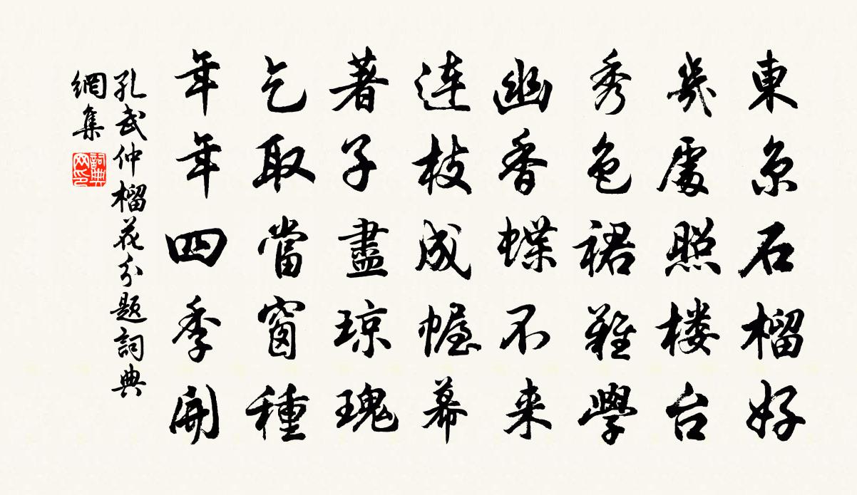 詩詞名句歷史字典書法欣賞書法字典國語詞典說文解字康熙字典古漢語字典標 題 作 者 詩 句 榴花分題作者:孔武仲 朝代:宋代榴花分題原文東京石榴好,幾處照樓台。秀色裙難學,幽香蝶不來。連枝成幄幕,著子盡瓊瑰。乞取當窗種,年年四季開。詩詞問答問:榴花分題的作者是誰?答:孔武仲問:榴花分題寫於哪個朝代?答:宋代孔武仲榴花分題書法欣賞榴花分題書法作品詩詞推薦奉陪韋潤州游鶴林寺李嘉祐〔唐代〕野寺江城近,雙旌五馬過。禪心超忍辱,梵語問多羅。松竹閒僧老,雲煙晚日和。寒塘歸路轉,清磬隔微波。題扇面六言黃復之〔宋代〕峽束天圍漸小,林穿日腳微明。竹居有徑誰掃,水礁無人自鳴。八聲甘州(和梅津)吳文英〔宋代〕記行雲夢影,步凌波、仙衣翦芙容。念杯前燭下,十香搵袖,玉暖屏風。分種寒花舊盎,蘚土蝕吳蛩。人遠雲槎渺句羅之紀〔宋代〕吾道非耶真可恥,此君豈是折腰人。菩薩蠻·玉纖彈處真珠落溫庭筠〔唐代〕玉纖彈處真珠落,流多暗濕鉛華薄。春露浥朝華,秋波浸晚霞。風流心上物,本為風流出。看取薄情人,羅衣無此七言呂岩〔唐代〕周行獨力出群倫,默默昏昏亘古存。無象無形潛造化,有門有戶在乾坤。色非色際誰窮處,空不空中自得根。此道偈二十七首釋守淨〔宋代〕常州有,福州無,江風作惡浪花粗。不用刻舟徒記劍,片帆已過洞庭湖。感詠十解寄呈楊安撫白玉蟾〔宋代〕風吹五花輦,露綴九光輿。夜半紅塵起,琴高失鯉魚。句黃世長〔宋代〕溪上接秦頭,遠江分楚尾。喜遷鶯李煜〔唐代〕曉月墮,宿雲微,無語枕憑欹。夢回芳草思依依,天遠雁聲稀。啼鶯散,餘花亂,寂寞畫堂深院。片紅休掃盡從伊上林內翰二首毛滂〔宋代〕內廷吳陸善文書,絕代如公可數渠。科斗他年載深厚,楞伽終日伴清虛。濟時即展經綸業, * 聊施采色余。想為送高集中赴漳浦宰張元乾〔宋代〕三年烏石僧房居,忍飢待次真臞儒。有意載酒問奇字,無事閉門抄異書。一行作吏去漳水,斂版趨廊參刺史。胸中得江西報六言十首劉克莊〔宋代〕但見盈城盈野,誰能去食去兵。山東河北卷土,江右湖南失耕。游虎丘富嚴〔宋代〕繚繞禪關鎖翠微,遊人到此便忘歸。古今不盡春風恨,一劍清泉浸落暉。早興白居易〔唐代〕晨光出照屋樑明,初打開門鼓一聲。犬上階眠知地濕,鳥臨窗語報天晴。半銷宿酒頭仍重,新脫冬衣體乍輕。睡覺過故府中武威公交城舊庄感事(武威公王茂元也)李商隱〔唐代〕信陵亭館接郊畿,幽象遙通晉水祠。日落高門喧燕雀,風飄大樹撼熊羆。新蒲似筆思投日,芳草如茵憶吐時。山下偈頌二十五首釋如淨〔宋代〕眼見黃葉落,耳聞孤雁鳴。咦,溪上秋光分外清。已亥雜詩 257龔自珍〔清代〕難憑肉眼識天人,恐是優曇偶現身。故遣相逢當五濁,不然誰信上仙淪。頌古一百則釋正覺〔宋代〕一倒一起,雪庭師子。慎於犯而懷仁,勇於為而見義。清光照眼似迷家,明白轉身還墮位。衲僧家,了無寄,同死送隴州使君劉仲儀左藏赴治強至〔宋代〕夾道濃香數里焚,隨車和氣一城薰。兵民如見古循吏,文武兼能今使君。冷射祠堂汧水月,晴飛郡閣隴山雲。幕中名句推薦晚日金陵岸草平,落霞明,水無情歐陽炯《江城子·晚日金陵岸草平》 中秋誰與共孤光。把盞悽然北望。蘇軾《西江月·世事一場大夢》 若問相思甚了期,除非相見時。晏幾道《長相思·長相思》 江東子弟多才俊,捲土重來未可知。杜牧《題烏江亭》 仁遠乎哉?我欲仁,斯仁至矣。孔子弟子《論語·述而篇》 又是春將暮,無語對斜陽。葛長庚《水調歌頭·江上春山遠》 愛親者,不敢惡於人;敬親者,不敢慢於人。孔子及其弟子《孝經·天子》 亦余心之所善兮,雖九死其猶未悔。屈原《離騷》 橫笛聞聲不見人,紅旗直上天山雪。陳羽《從軍行》 聞道春還未相識,走傍寒梅訪訊息。李白《早春寄王漢陽》