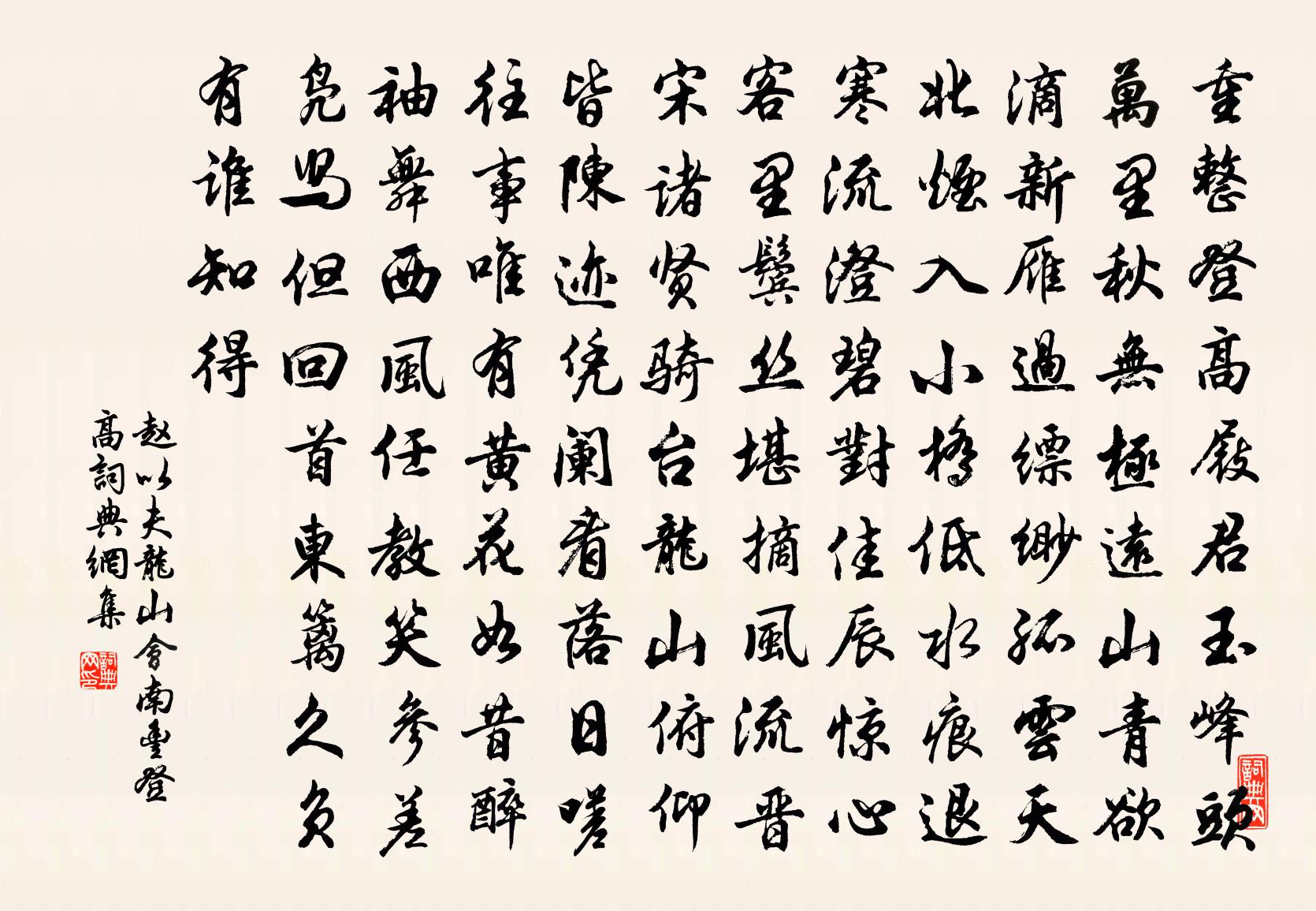 詩詞名句歷史字典書法欣賞書法字典國語詞典說文解字康熙字典古漢語字典標 題 作 者 詩 句 龍山會(南豐登高)作者:趙以夫 朝代:宋代龍山會(南豐登高)原文重整登高屐。君玉峰頭,萬里秋無極。遠山青欲滴。新雁過、縹緲孤雲天北。煙入小橋低,水痕退、寒流澄碧。對佳辰,驚心客里,鬢絲堪摘。風流晉宋諸賢,騎台龍山,俯仰皆陳跡。憑闌看落日。嗟往事、唯有黃花如昔。醉袖舞西風,任教笑、參差鳧舄。但回首、東籬久負,有誰知得。詩詞問答問:龍山會(南豐登高)的作者是誰?答:趙以夫問:龍山會(南豐登高)寫於哪個朝代?答:宋代趙以夫龍山會(南豐登高)書法欣賞龍山會(南豐登高)書法作品詩詞推薦紹興親享明堂二十六首佚名〔宋代〕孰謂天遠,至誠冊通。孰謂地厚,與天則同。惠我純嘏,克成大功。握圖而治,如日之中。陪諸先輩題名登春台臞軒即席次故相陳魏公韻劉克莊〔宋代〕台荒屋老閱人深,拂拭留題重整襟。科目一朝來券外,姓名三世在碑陰。公孫晚歲叨明詔,裘氏當年費苦吟。報與念奴嬌(慶朱察推)佚名〔宋代〕蔥蔥佳氣,人都道、今日垂孤令旦。怪得歡聲如鼎沸,準擬華堂開宴。三虎容儀三子,二喬態度二寵是姊妹,爭捧擬東城一何高詩陸機〔魏晉〕西山何其峻。層曲郁崔嵬。零露彌天墜。蕙葉憑林衰。寒暑相因襲。時逝忽如頹。三閭結飛轡。大耋嗟落暉。曷為水磑文同〔宋代〕激水為磑嘉陵民,構高穴深良苦辛。十里之間凡共此,麥入面出無虛人。彼甿居險所產薄,世世食此江之濱。朝廷謝淮南徐巨源寄酒王洋〔宋代〕淮南有酒誰人得,分餉東吳無酒客。應憐蔀屋寒氣多,倍費行廚春色力。人道使君宜在朝,我視使君宜逍遙。已聞會賈守邀許倅有感吳芾〔宋代〕宿霧濃雲撥不開,更傾驟雨下天來。天公也喜人歡聚,故遣斜陽送一杯。櫂歌九章寄彭鶴林白玉蟾〔宋代〕岸上酒旗舞,寒蕪生秋風。誰家六七童,手持金芙蓉。臨江仙 壽程雪樓張伯淳〔元代〕白雪樓前清畫,新來喜事連綿。朱明綠暗麥秋天。繡衣何日去,丹荔已香傳。前夜團圓明月好,清光流照華筵。錦招山陽高徐二生飲二首袁說友〔宋代〕欲作山陰興盡回,良思與子把離杯。要須人境俱清絕,好抱瑤琴踏雪來。小閣省心舒岳祥〔宋代〕避地逃名花時臧,春風何事轉桑樞。退藏小閣收心靜,閒下危階放步徐。身到衰時方學道,眼當昏處始觀書。一生無題舒岳祥〔宋代〕春風萬里虞姬草,夜月千村蜀帝花。已矣莫論如許事,菜畦黃蝶繞田家。長妹第一百四十八文天祥〔宋代〕近聞韋氏妹,零落依草木。深負鶺鴒詩,臨風欲痛哭。瑞鶴仙(紅葉)蔣捷〔宋代〕縞霜霏霽雪。漸翠沒涼痕,猩浮寒血。山窗夢淒切。短吟筇猶倚,鶯邊新樾。花魂未歇。似追惜、芳消艷滅。挽西楊柳枝詞四首孫光憲〔唐代〕閶門風暖落花乾,飛遍江城雪不寒。獨有晚來臨水驛,閒人多憑赤欄乾。有池有榭即濛濛,浸潤翻成長養功。恰似芍藥四首邵雍〔宋代〕含露仙姿近玉堂,翻堦美態醉紅妝。對花未免須酣舞,到底昌黎是楚狂。無為洞口作元結〔唐代〕無為洞口春水滿,無為洞傍春雲白。愛此踟躕不能去,令人悔作衣冠客。洞傍山僧皆學禪,無求無欲亦忘年。欲問無題楊億〔宋代〕巫陽歸夢隔千峰,辟惡香銷翠被空。桂魄漸虧愁曉月,蕉心不展怨春風。遙山黯黯眉長斂,一水盈盈語未通。漫托頌古十九首釋慧暉〔宋代〕是風是旙君莫疑,百草叢中信步歸。王道太平無忌諱,戲蝶流鶯繞樹飛。江上與兄別趙嘏〔唐代〕楚國湘江兩渺彌,暖川晴雁背帆飛。人間離別盡堪哭,何況不知何日歸。名句推薦髻子傷春慵更梳。晚風庭院落梅初。李清照《浣溪沙·髻子傷春慵更梳》 五更鐘動笙歌散,十里月明燈火稀。賀鑄《思越人·紫府東風放夜時》 卷峭寒萬里,平沙飛雪。吳文英《暗香疏影·夾鍾宮賦墨梅》 金谷園中柳,春來似舞腰。李益《上洛橋》 敗垣芳草,空廊落葉,深砌蒼苔。徐再思《人月圓·甘露懷古》 莫辭酒味薄,黍地無人耕。杜甫《羌村三首·其三》 淡雲孤雁遠,寒日暮天紅。徐昌圖《臨江仙·飲散離亭西去》 復值接輿醉,狂歌五柳前。王維《輞川閒居贈裴秀才迪》 柳葉隨歌皺,梨花與淚傾。黃庭堅《南歌子·槐綠低窗暗》 迢迢牽牛星,皎皎河漢女。佚名《迢迢牽牛星》