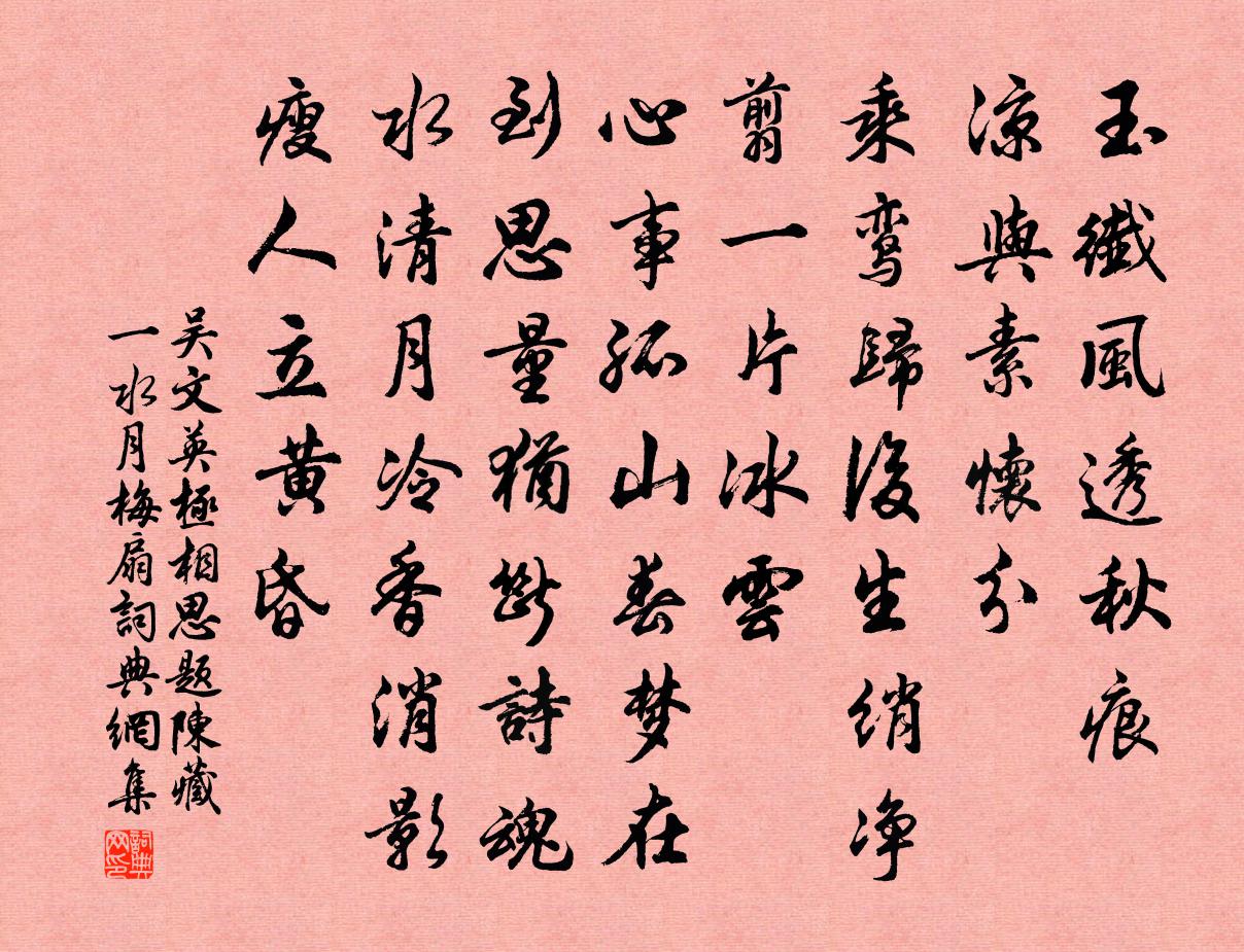 詩詞名句歷史字典書法欣賞書法字典國語詞典說文解字康熙字典古漢語字典標 題 作 者 詩 句 極相思·題陳藏一水月梅扇作者:吳文英 朝代:宋代極相思·題陳藏一水月梅扇原文玉纖風透秋痕。涼與素懷分。乘鸞歸後,生綃淨翦,一片冰雲。心事孤山春夢在,到思量、猶斷詩魂。水清月冷,香消影瘦,人立黃昏。詩詞問答問:極相思·題陳藏一水月梅扇的作者是誰?答:吳文英問:極相思·題陳藏一水月梅扇寫於哪個朝代?答:宋代問:極相思·題陳藏一水月梅扇是什麼體裁?答:詞問:吳文英的名句有哪些?答:吳文英名句大全吳文英極相思·題陳藏一水月梅扇書法欣賞極相思·題陳藏一水月梅扇書法作品標籤:詠物詩詞推薦花犯·小石梅花周邦彥〔宋代〕粉牆低,梅花照眼,依然舊風味。露痕輕綴。疑淨洗鉛華,無限佳麗。去年勝賞曾孤倚。冰盤同宴喜。更可惜,雪霜天曉月(梅)蕭泰來〔宋代〕千霜萬雪。受盡寒磨折。賴是生來瘦硬,渾不怕、角吹徹。清絕。影也別。知心惟有月。原沒春風情性,如何共、南浦·春水張炎〔宋代〕波暖綠粼粼,燕飛來、好是蘇堤才曉。魚沒浪痕圓,流紅去、翻笑東風難掃。荒橋斷浦,柳陰撐出扁舟小。回首池流鶯李商隱〔唐代〕流鶯漂蕩復參差,渡陌臨流不自持。巧囀豈能無本意,良辰未必有佳期。風朝露夜陰晴里,萬戶千門開閉時。曾苦梅花宸濠翠妃〔明代〕銹針刺破紙糊窗,引透寒梅一線香。螻蟻也知春色好,倒拖花片上東牆。詠新竹際智〔清代〕此君志欲擎天碧,聳出雲頭高百尺。只恐年深化作龍,一朝飛去不留跡。蓮藕花葉圖吳師道〔元代〕玉雪竅玲瓏,紛披綠映紅。生生無限意,只在苦心中。江梅引·憶江梅洪皓〔宋代〕歲在壬戌,甫臨長至,張總侍御邀飲。眾賓皆退,獨留少款。侍婢歌江梅引,有“念此情、家萬里”之句,仆曰:憶秦娥·詠桐李清照〔宋代〕臨高閣。亂山平野煙光薄。煙光薄。棲鴉歸後,暮天聞角。斷香殘酒情懷惡。西風催襯梧桐落。梧桐落。又還秋色養竹記白居易〔唐代〕 竹似賢,何哉?竹本固,固以樹德,君子見其本,則思善建不拔者。竹性直,直以立身;君子見其性,則思中椒聊佚名〔先秦〕椒聊之實,蕃衍盈升。彼其之子,碩大無朋。椒聊且,遠條且。椒聊之實,蕃衍盈匊。彼其之子,碩大且篤。椒聊柳枝詞何希堯〔唐代〕大堤楊柳雨沉沉,萬縷千條惹恨深。飛絮滿天人去遠,東風無力系春心。使院中新栽柏樹子,呈李十五棲筠岑參〔唐代〕愛爾青青色,移根此地來。不曾台上種,留向磧中栽。脆葉欺門柳,狂花笑院梅。不須愁歲晚,霜露豈能摧。題小松李商隱〔唐代〕憐君孤秀植庭中,細葉輕陰滿座風。桃李盛時雖寂寞,雪霜多後始青蔥。一年幾變枯榮事,百尺方資柱石功。為謝早梅張謂〔唐代〕一樹寒梅白玉條,迥臨林村傍溪橋。不知近水花先發,疑是經春雪未銷。銅雀台賦曹植〔魏晉〕從明後而嬉遊兮,登層台以娛情。見太府之廣開兮,觀聖德之所營。建高門之嵯峨兮,浮雙闕乎太清。立中天之華蘆花雍裕之〔唐代〕夾岸復連沙,枝枝搖浪花。月明渾似雪,無處認漁家。題張十一旅舍三詠井韓愈〔唐代〕賈誼宅中今始見,葛洪山下昔曾窺。寒泉百尺空看影,正是行人渴死時。菩薩蠻·詠梅朱淑真〔宋代〕濕雲不渡溪橋冷。娥寒初破東風影。溪下水聲長。一枝和月香。人憐花似舊,花不知人瘦。獨自倚闌乾,夜深花正瀟湘神劉禹錫〔唐代〕湘水流,湘水流,九疑雲物至今秋。若問二妃何處所,零陵芳草露中愁。名句推薦誤用聰明,何若一生守拙王永彬《圍爐夜話·第四一則》 習讀書之業,便當知讀書之樂王永彬《圍爐夜話·第五五則》 非知之艱,行之惟艱。佚名《尚書·商書·說命中》 春無蹤跡誰知。除非問取黃鸝。黃庭堅《清平樂·春歸何處》 寂寞深閨,柔腸一寸愁千縷。李清照《點絳唇·閨思》 冬夜夜寒覺夜長,沉吟久坐坐北堂。李白《夜坐吟》 今又重陽,戰地黃花分外香。 * 《採桑子·重陽》 積善之家必有餘慶,積不善之家必有餘殃。佚名《易傳·文言傳·坤文言》 已從招提游,更宿招提境杜甫《游龍門奉先寺》 無錢休入眾,遭難莫尋親。佚名《增廣賢文·上集》