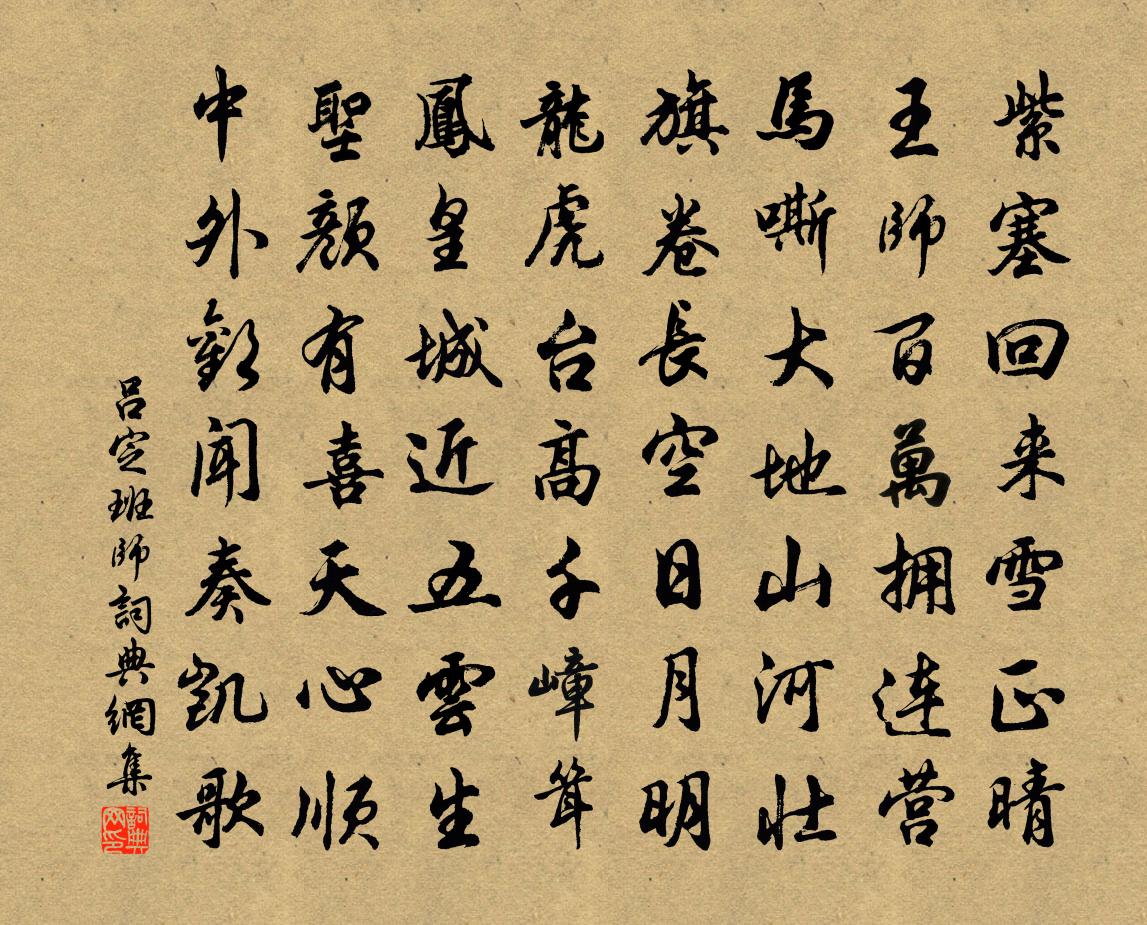 詩詞名句歷史字典書法欣賞書法字典國語詞典說文解字康熙字典古漢語字典標 題 作 者 詩 句 班師作者:呂定 朝代:宋代班師原文紫塞回來雪正晴,王師百萬擁連營。馬嘶大地山河壯,旗卷長空日月明。龍虎台高千嶂聳,鳳皇城近五雲生。聖顏有喜天心順,中外歡聞奏凱歌。詩詞問答問:班師的作者是誰?答:呂定問:班師寫於哪個朝代?答:宋代呂定班師書法欣賞班師書法作品詩詞推薦奉和元日賜群臣柏葉應制趙彥昭〔唐代〕器乏雕梁器,材非構廈材。但將千歲葉,常奉萬年杯。送高安辛聖祥謁後林許月卿六〔宋代〕論相何如只論心,無心無相更難尋。清風獨臥羲皇上,床下明朝拜後林。有懷江南作田家忙趙蕃〔宋代〕南風吹動原頭草,秧老麥收蠶向了。田家政用此時忙,不問兒童與翁媼。五溪之俗殊江南,刀耕火種不知蠶。勸農州橋范成大〔宋代〕州橋南北是天街,父老年年等駕回。忍淚失聲詢使者,"幾時真有六軍來?"贈白道者(一作詠史第二首)李商隱〔唐代〕十二樓前再拜辭,靈風正滿碧桃枝。壺中若是有天地,又向壺中傷別離。賢者之孝二百四十首張沖林同〔宋代〕未嘗無果菜,何至取吳中。祭我必土產,遺言敢不共。題孤山圖錢選〔宋代〕一童一鶴兩相隨,閒步梅邊賦小詩。疏影暗香真絕句,至今誰復繼新辭。雜劇·江州司馬青衫淚馬致遠〔元代〕第一折(沖末扮白樂天同外扮賈浪仙、孟浩然上)(白詩云)宴遊飲食漸無味,杯酒管弦徒繞身。賓客歡從童僕喜無題仇遠〔宋代〕粉圍香陣畫梁塵,幾夢梨花漠漠雲。一夜春風忽吹醒,鏡中白髮不須耘。寇萊公廟折彥質〔宋代〕萊公英特姿,譚笑安社稷。流離死窮荒,志士氣益塞。死謫憐忠愍,生還喜子由。荒祠連舊宅,幾見海雲秋。余有足疾因感柳子厚跂烏篇姜特立〔宋代〕跂烏肖翹叢薄間,低頭塌翅人所憐。既無三足相疑妒,恐可夤緣到日邊。哭伯姊二首劉克莊〔宋代〕弟為龜湖妹制碑,伯姬舍我復何之。今彤史筆嗟誰炳,古錦囊詩獨姊知。起絮撒鹽才有間,燎須作粥力安施。瀾湍風流子(泛湖)羅志仁〔宋代〕歌咽翠眉低。湖船客、尊酒謾重攜。正斷續齋鍾,高峰南北,飄零野褐,太乙東西。淒涼處,翠連松九里,僧馬濺和周侍郎見寄王起〔唐代〕貢院離來二十霜,誰知更忝主文場。楊葉縱能穿舊的,桂枝何必愛新香。九重每憶同仙禁,六義初吟得夜光。莫道崇山圖七賢詩張嵲〔宋代〕負郭幽崖面武當,襄江前占水雲長。四時景趣無窮盡,俱向公家靜隱堂。錫老弟山居蒲壽宬〔宋代〕君住南山我北山,隔溪斜照見炊煙。相尋懶趁溪邊路,村酒時沽上釣船。小三郎試院高捷喜成四韻曹勛〔宋代〕吾侄千里駒,一噴綠沙外。韜鈐本書史,方略挾經緯。小出附眾策,坐使勍敵潰。持弧褦襶子,雨汗亦良愧。生查子(再和丞相)趙磻老〔宋代〕金門一免時,離緒紛如縷。想像切雲高,曉日羅昏霧。峨冠補袞人,不是無心處。欲效貢公彈,衣缽知誰付。與微之同賦梅花得香字三首王安石〔宋代〕淺淺池塘短短牆,年年為爾惜流芳。向人自有無言意,傾國天教抵死香。須裊黃金危欲墮,蒂團紅蠟巧能裝。嬋娟游大滌棲真洞楊棟〔宋代〕山峨來夾案,泉急自穿渠。密記東陽訣,高題上帝居。牙兒藏寶篋,山子走籃輿。曲折璣衡轉,溪坳可結廬。名句推薦金玉其外,敗絮其中劉基《賣柑者言》 一自胡塵入漢關,十年伊洛路漫漫。陳與義《詠牡丹》 腳踏車欲問邊,屬國過居延。王維《使至塞上》 一年滴盡蓮花漏。碧井酴酥沈凍酒。毛滂《玉樓春·己卯歲元日》 回首天涯歸夢,幾魂飛西浦,淚灑東州。周密《一萼紅·登蓬萊閣有感》 風乍起,吹皺一池春水。馮延巳《謁金門·風乍起》 有錢道真語,無錢語不真。佚名《增廣賢文·上集》 清明時節雨聲嘩,潮擁渡頭沙張炎《朝中措·清明時節》 今日樓台鼎鼐,明年帶礪山河辛棄疾《西江月·堂上謀臣尊俎》 君安游兮西入秦,願為影兮隨君身。傅玄《車遙遙篇》