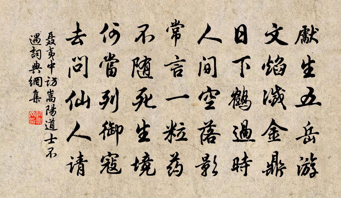 詩詞名句歷史字典書法欣賞書法字典國語詞典說文解字康熙字典古漢語字典標 題 作 者 詩 句 訪嵩陽道士不遇作者:聶夷中 朝代:唐代訪嵩陽道士不遇原文先生五嶽游,文焰滅金鼎。日下鶴過時,人間空落影。常言一粒藥,不隨死生境。何當列禦寇,去問仙人請。詩詞問答問:訪嵩陽道士不遇的作者是誰?答:聶夷中問:訪嵩陽道士不遇寫於哪個朝代?答:唐代問:訪嵩陽道士不遇是什麼體裁?答:五古聶夷中訪嵩陽道士不遇書法欣賞訪嵩陽道士不遇書法作品注釋全唐詩:卷636-18詩詞推薦次韻張守不欺堂陳造〔宋代〕使君古醇儒,內視保良貴。芸芸鏡中影,了莫遁情偽。賦芧豈至術,機灌彼誰子。退食一堂間,百事反諸己。床敷鵲橋仙 自壽二首劉辰翁〔宋代〕輕風澹月,年年去路。誰識小年初度。橋邊曾弄碧蓮花,悄不記、人間今古。 * 江上,沾衣微露。依約凌波曾步次韻何子楚食櫻桃沈與求〔宋代〕輕衫駿馬飛彈丸,上林花開紛繡團。御廚賜筍未解籜,山櫻亦復登金盤。宗廟薦新勤玉路,凡果紛紛不論數。風清錢史開府奉祠歸四明李洪〔宋代〕袞繡貂蟬侍太清,致身將相極儒生。三槐正位岩瞻峻,兩鎮交兵節制榮。晝錦蚤傳留鑒水,召棠重喜蔽龍城。願將和江鄰幾詠雪二十韻梅堯臣〔宋代〕十一月將雪,寒誰計有無。雲橫凍鵬翼,霰集泣蛟珠。萬里風為使,千門玉作樞。縞衣來自鄭,濤鷺卷從吳。積甲偈六十三首釋道寧〔宋代〕靈山顧視,迦葉親聞。白藕峰前,盧公契旨。直饒鍼芥相投,未免隨波逐浪。俱成勝負,猶涉驅馳。爭似青天為幕贈趙排岸兼簡汪尉陳造〔宋代〕二年挽眉簿書俗,分無足音到空谷。趙侯縹緲塵外人,肯艤歸舟問幽獨。冰壺炯炯當九秋,岩電熠熠懸雙目。小家記夢示師是陳造〔宋代〕青燈寒夜思吾鄉,合眼便坐吾家堂。阿丁炯然目如水,彩服蹁躚趨我傍。中心喜之謬督過,還為遨嬉廢書課。指似題烏程簿廳浮玉亭七首袁說友〔宋代〕誰將絕景傍家邊,舉足溪山已滿前。莫恨微管清俸少,一亭風月不論錢。哭陳伯求舒岳祥〔宋代〕早總淮西餉,晚為刑部郎,艱危身九隕,漂泊淚千行。天地孤忠在,山河遺恨長。寡妻隨季女,猶得在鄞鄉。謁金門(壽何令)黃機〔宋代〕冬十月。記取生申時節。梅傍小春融絳雪。淺寒猶未卻。且醉笙歌蕉葉。富貴不須頻說。國太夫人頭半白。看君金薌岩山居孟夏二十絕舒岳祥〔宋代〕綠樹塞柴門,青山壓茅宇。遙遙望來峰,日夕多風雨。信士畫真請贊釋印肅〔宋代〕法空為座,金剛為體,板如痴脫空無底。信心無二,吞山納水。高帝於石〔宋代〕呂氏強梁劉氏危,宮中枕臥復誰知。釀成外戚中官禍,興漢已開亡漢基。送友入關李端〔唐代〕聞君帝城去,西望一沾巾。落日見秋草,暮年逢故人。非才長作客,有命懶謀身。近更嬰衰疾,空思老漢濱。讀太白感興擬作二首張耒〔宋代〕陳王本無賴,少與美人期。蛾眉作穢血,蠱鬼尚何知。乃復結綢繆,佇車心傷悲。幻滅猶欲取,哀哉一痴兒。千年花游曲楊維楨〔元代〕三月十日春蒙蒙,滿江花雨濕東風。美人盈盈煙雨里,唱徹湖煙與湖水。水天虹女忽當門,午光穿漏海霞裙。美人自和寒食韻梅摯〔宋代〕龜堞春遊徑路賒,青青踏去冒煙華。翠停舴艋客尋寺,紅卸羃{上四下離}人上車。亭落五重沽卓酒,釵行十二步和虞永康梅花十絕句魏了翁〔宋代〕遠山雲抹半橫簪,野色昏明水淺深。庭外沉沉人不到,凜然玉雪對疏林。怪石范端臣〔宋代〕人間足安危,頃刻異候狀。唯應山中石,不愛客塵障。搜奇貯元龍,飛雲勞魯望。名句推薦醉里且貪歡笑,要愁那得工夫。辛棄疾《西江月·遣興》 手種黃柑二百株,春來新葉遍城隅。柳宗元《柳州城西北隅種柑樹》 知人者智,自知者明。勝人者有力,自勝者強。知足者富。強行者有志。老子《老子·道經·第三十三章》 鴛鴦密語同傾蓋,且莫與、浣紗人說。張炎《疏影·詠荷葉》 雪沫乳花浮午盞,蓼茸蒿筍試春盤。蘇軾《浣溪沙·細雨斜風作曉寒》 藍橋春雪君歸日,秦嶺秋風我去時。白居易《藍橋驛見元九詩》 有意栽花花不發,無心插柳柳成蔭。佚名《增廣賢文·上集》 大凡物不得其平則鳴韓愈《送孟東野序》 用舍由時,行藏在我,袖手何妨閒處看。蘇軾《沁園春·孤館燈青》 旋開旋落旋成空,白髮多情人更惜。司空圖《酒泉子·買得杏花》