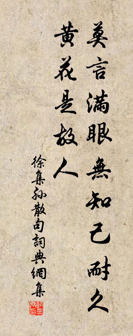 詩詞名句歷史字典書法欣賞書法字典國語詞典說文解字康熙字典古漢語字典標 題 作 者 詩 句 句作者:徐集孫 朝代:宋代句原文莫言滿眼無知己,耐久黃花是故人。詩詞問答問:句的作者是誰?答:徐集孫問:句寫於哪個朝代?答:宋代徐集孫句書法欣賞句書法作品詩詞推薦頌古八首釋道印〔宋代〕何必不必,方圓曲直。眉目分明,若為辨的。影草既隨身,覿面當機疾。一雙孤雁忽高飛,兩隻鴛鴦還獨立。如夢令譚處端〔元代〕因遇重陽師父。引入全真門戶。慧火煉靈空。不敢胡行一步。一步。一步。一步近如一步。寄餘杭全安石段少連二從事范仲淹〔宋代〕分攜俱是佐高牙,兩地光塵自等差。榮事日趨丞相府,道情時過老君家。雙鴻得侶知風便,一鶴思鳴對露華。早晚晉元帝廟劉克莊〔宋代〕元帝新祠西郭外,野人弔古獨來游。陰陰畫壁開冠劍,寂寂絲窠上璪旒。勢比龍盤猶在眼,事隨鴻去不回頭。葉碑讀黃莘秘校卷梅堯臣〔宋代〕嵇康昔彈廣陵散,商聲高與宮聲緩。託名山鬼未傳人,古桐紉絲絲不斷。一聞殭臥竊其音,世間雖得能亦罕。賢明句陽景春〔宋代〕詩書有味嚼逾美,編簡無花開自香。初入洞霄聞九成〔宋代〕擬借寒泉洗此心,幽亭曾屢謁清音。會須枕石伴龍睡,不爾 * 學鳳吟。蟄地金丹聞往昔,插天琳宇盛當今。靈芝得一吟邵雍〔宋代〕天自得一天無既,我一自天而後至。唯天與一無兩般,我亦何嘗與天異。桐花歐陽修〔宋代〕猗猗井上桐,花葉何蓑蓑。下蔭百尺泉,上聳陵雲材。翠色洗朝露,清陰午當階。幽蟬自嘒嘒,鳴鳥何喈喈。日出酬朱侍御望月見寄賈島〔唐代〕他寢此時吾不寢,近秋三五日逢晴。相思唯有霜台月,望盡孤光見卻生。讀《杜工部集》二首貫休〔唐代〕造化拾無遺,唯應杜甫詩。豈非玄域橐,奪得古人旗。日月精華薄,山川氣概卑。古今吟不盡,惆悵不同時。甫也秋懷陸游〔宋代〕策策桐葉風,蒙蒙菊花雨。空堂一燈青,幽壁百蟲語。嗟余豈願仕,老病歸無所。屈指計歲年,強半墮羈旅,荷戈邊上釋斯植〔宋代〕邊風斜日下長關,春到年年草自生。萬里戰場兵甲靜,近來應少北人行。金陵雜興二百首蘇泂〔宋代〕賞心亭前白鷺洲,淮水東畔水東流。只知覽古生許恨,不知身世自悠悠。寄韓愈張籍〔唐代〕野館非我室,新居未能安。讀書避塵雜,方覺此地閒。過郭多園墟,桑果相接連。獨游竟寂寞,如寄空雲山。夏景青玉案(和)趙長卿〔宋代〕恍如遼鶴歸華表。閱盡人間巧。天乞一堂山對繞。微波不動,岸巾時照。照見星星好。舞風荷蓋從敧倒。碧樹生涼次無咎凝祥春遊三首孔武仲〔宋代〕芸編校罷得嬉遊,池館雖春爽似秋。同舍病郎追不及,喜傳佳句到瀛洲。耕趙友直〔宋代〕布穀聲中雨一犁,綠蓑青笠兩相宜。隴頭枉費驅牛力,旱潦年來未可期。長干行李益〔唐代〕憶妾深閨里,煙塵不曾識。嫁與長乾人,沙頭候風色。五月南風興,思君下巴陵。八月西風起,想君發揚子。去來過招國李家南園二首李商隱〔唐代〕潘岳無妻客為愁,新人來坐舊妝樓。春風猶自疑聯句,雪絮相和飛不休。長亭歲盡雪如波,此去秦關路幾多。惟有名句推薦輕衫未攬,猶將淚點偷藏史達祖《夜合花·柳鎖鶯魂》 夜來雨橫與風狂,斷送西園滿地香。阿魯威《湘妃怨·夜來雨橫與風狂》 畫圖恰似歸家夢,千里河山寸許長。辛棄疾《鷓鴣天·送元濟之歸豫章》 無善而致人譽,不如無惡而致人毀。洪應明《菜根譚·概論》 此身行作稽山土,猶吊遺蹤一泫然。陸游《沈園二首》 倚闌凝望,獨立漁翁滿江雪。李綱《六么令·次韻和賀方回金陵懷古鄱陽席上作》 賤妾煢煢守空房,憂來思君不敢忘,不覺淚下沾衣裳。曹丕《燕歌行》 月明船笛參差起,風定池蓮自在香。秦觀《納涼》 螣蛇無足而飛,梧鼠五技而窮。荀子《荀子·勸學》 風為裳,水為佩李賀《蘇小小墓》